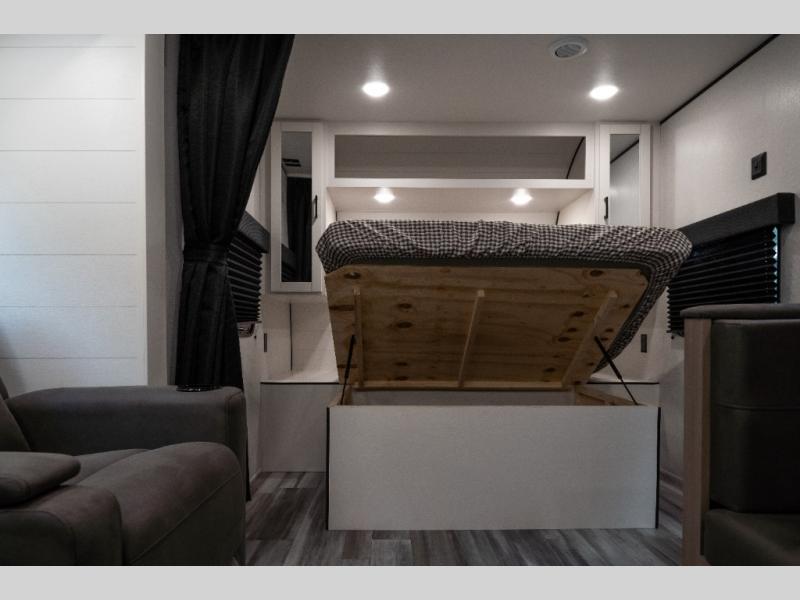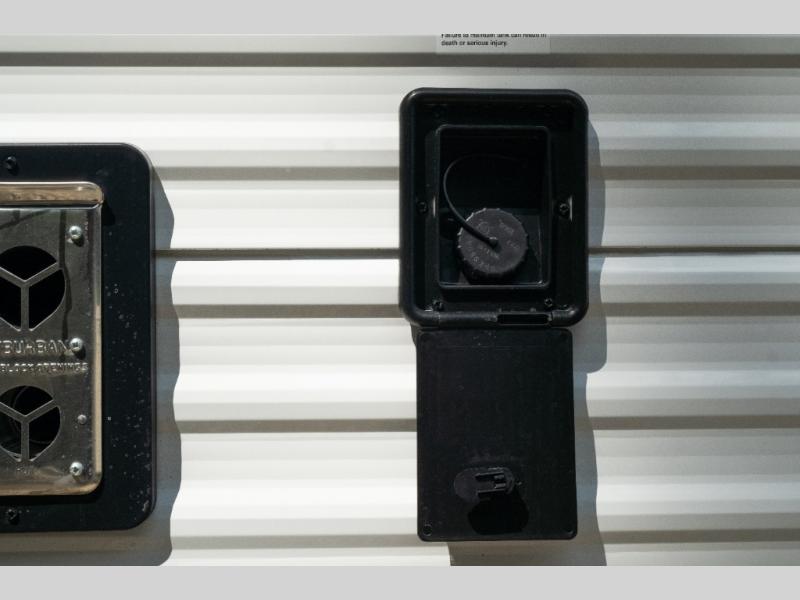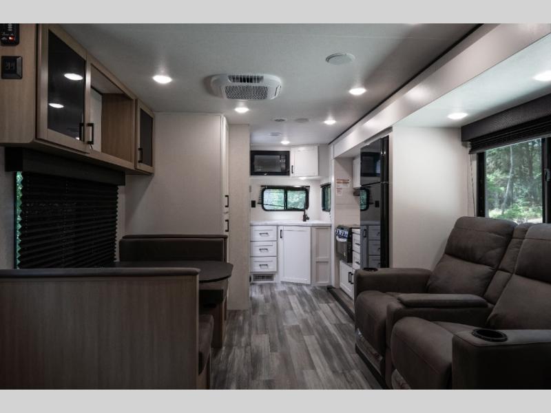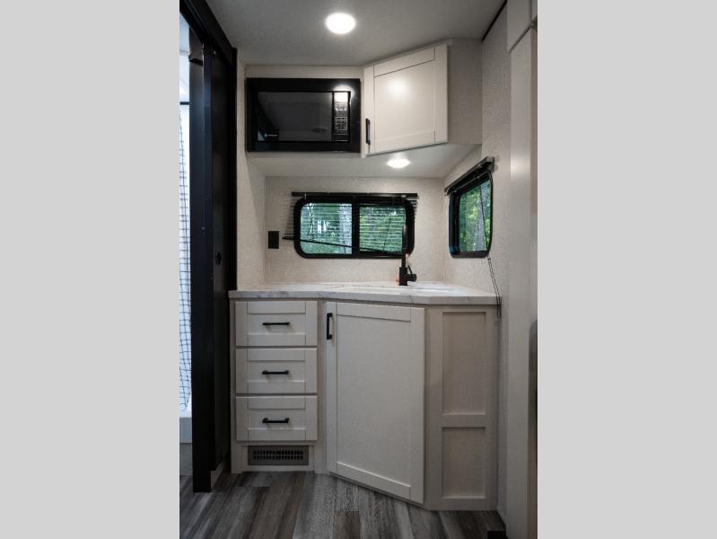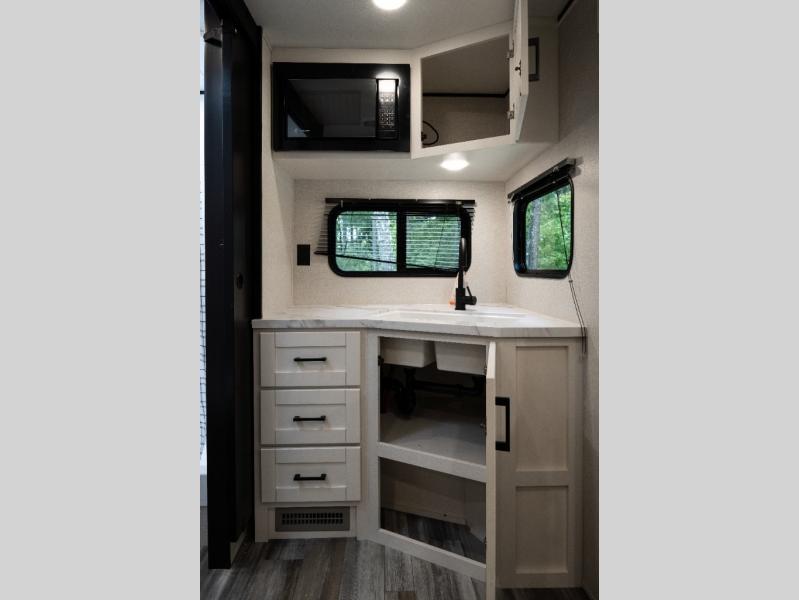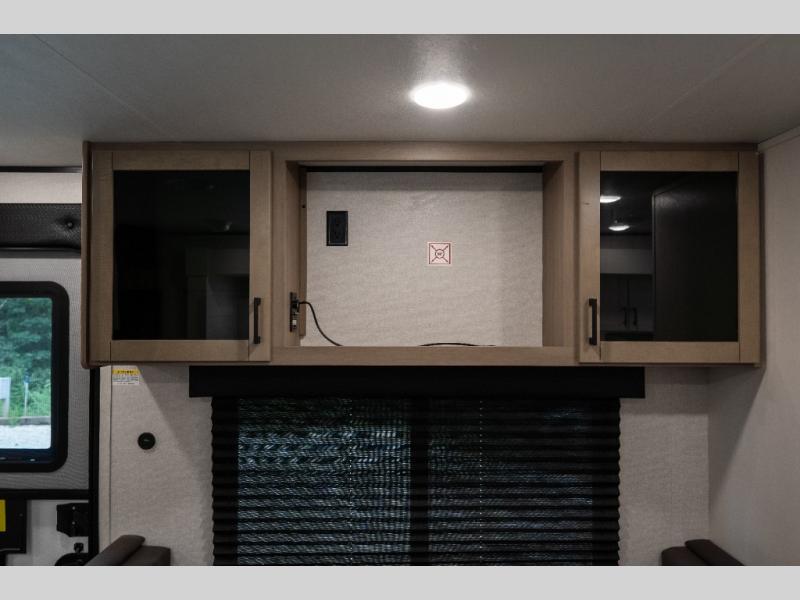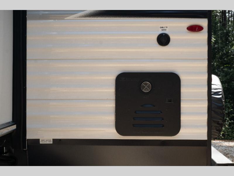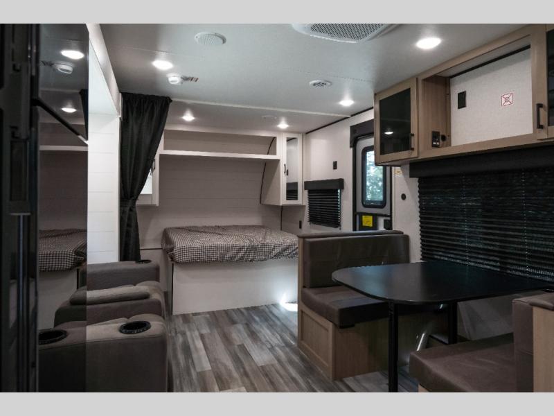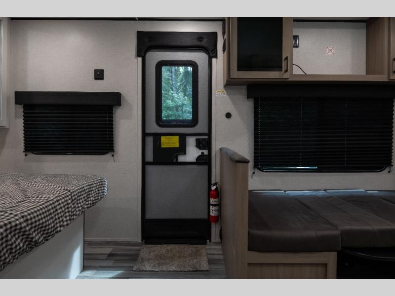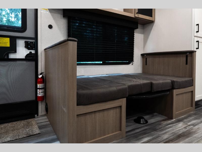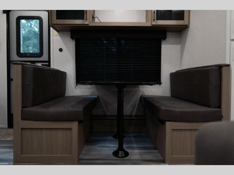 You will have a comfortable camping trip in this travel trailer! It offers full kitchen amenities including a pantry for snacks and such, plus a full rear corner bathroom for privacy and includes a shower. When you need a break, the semi-private bedroom up front offers a queen bed, dual wardrobes and a curtain to close, and the booth dinette can transform into a sleeping space as well. There is a 18' power awning with LED lights for you to enjoy this outdoor space into the night, plus exterior storage for your outdoor games and gear.