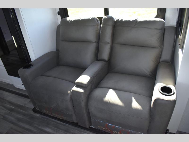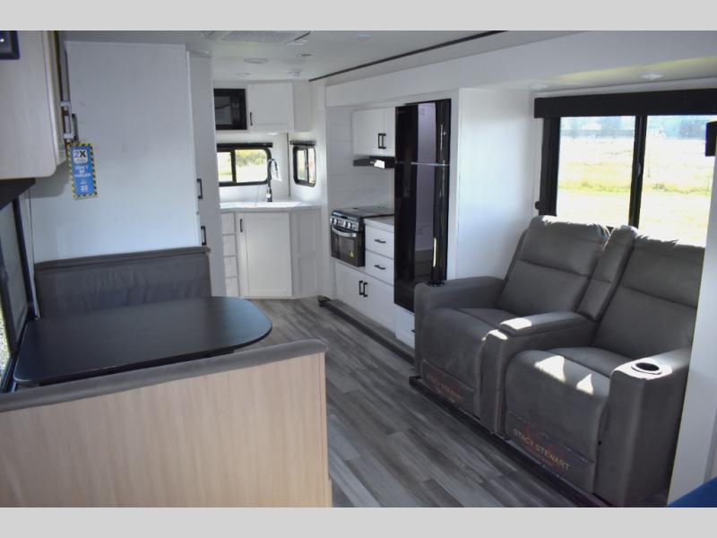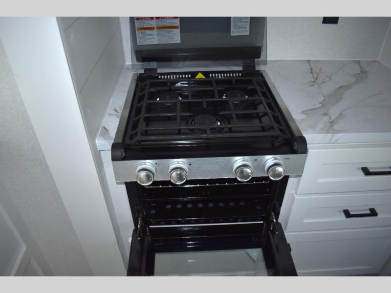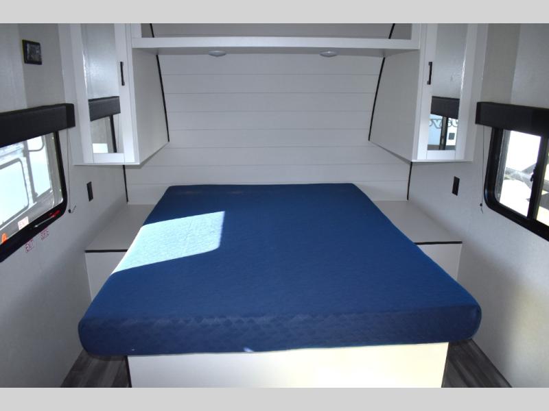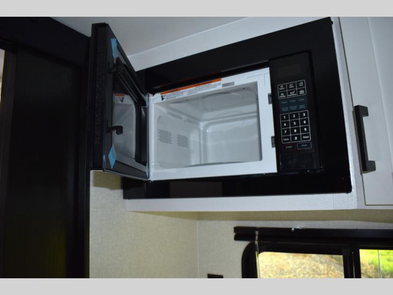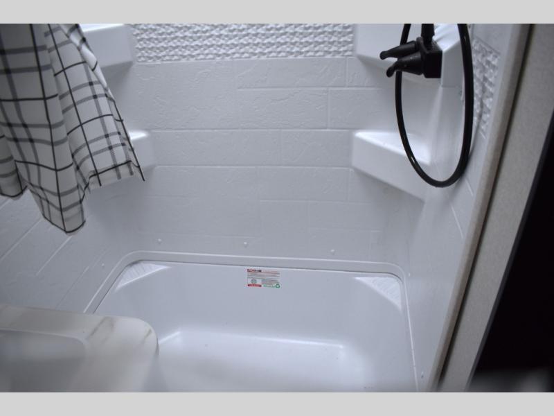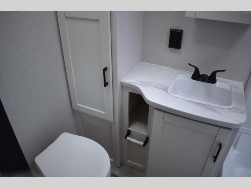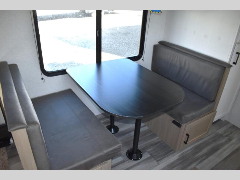 You will have a comfortable camping trip in this travel trailer! It offers full kitchen amenities including a pantry for snacks and such, plus a full rear corner bathroom for privacy and includes a shower. When you need a break, the semi-private bedroom up front offers a queen bed, dual wardrobes and a curtain to close, and the booth dinette can transform into a sleeping space as well. There is a 18' power awning with LED lights for you to enjoy this outdoor space into the night, plus exterior storage for your outdoor games and gear.