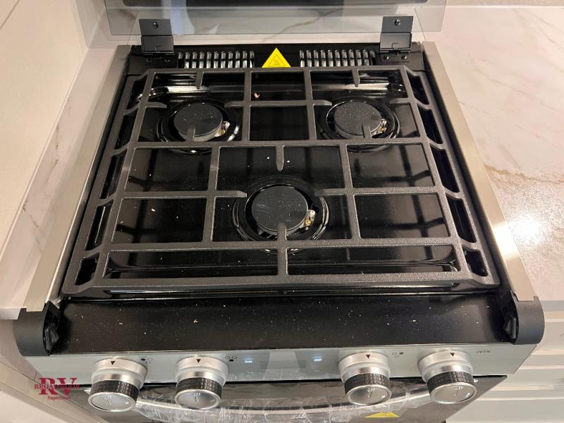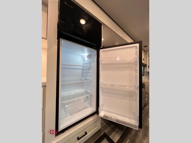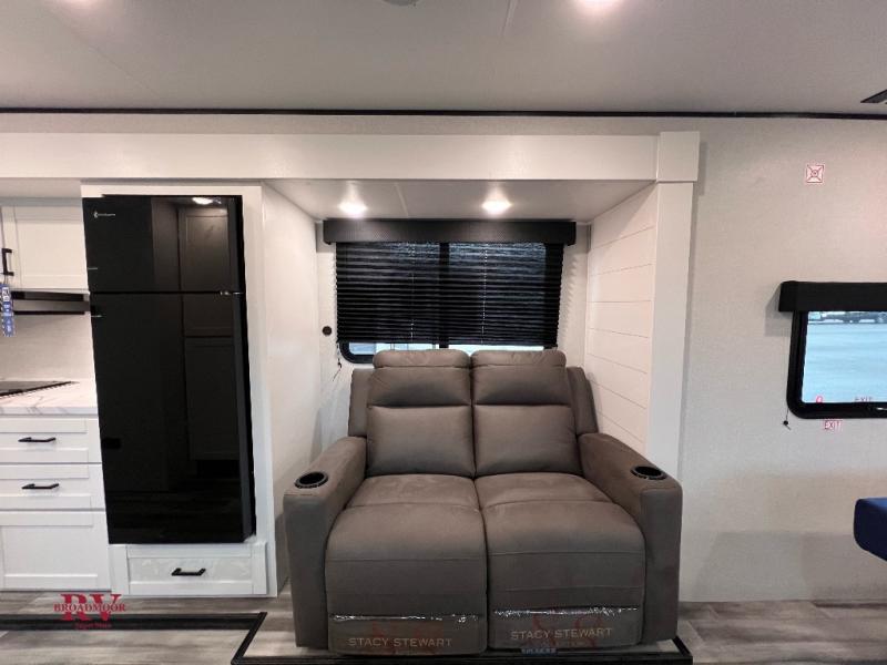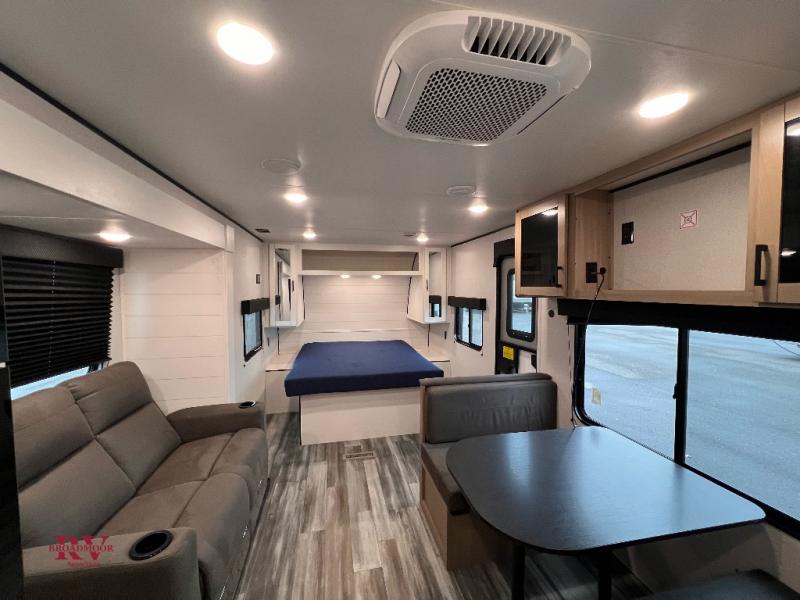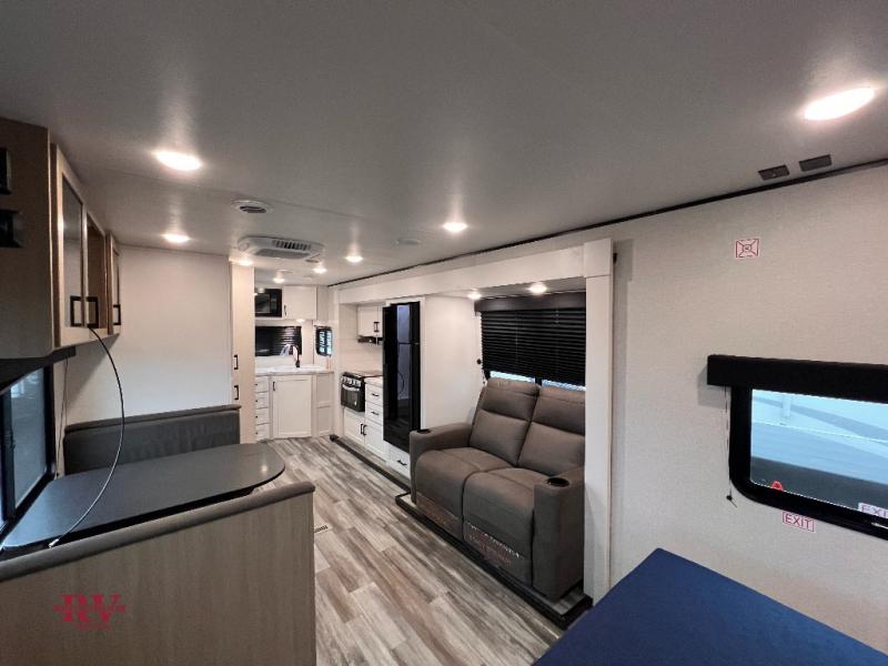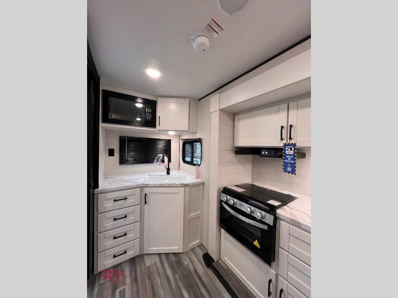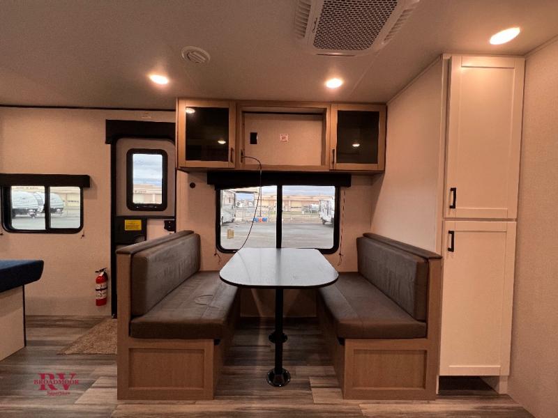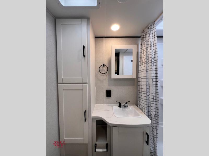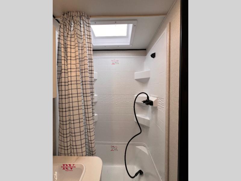 You will have a comfortable camping trip in this travel trailer! It offers full kitchen amenities including a pantry for snacks and such, plus a full rear corner bathroom for privacy and includes a shower. When you need a break, the semi-private bedroom up front offers a queen bed, dual wardrobes and a curtain to close, and the booth dinette can transform into a sleeping space as well. There is a 18' power awning with LED lights for you to enjoy this outdoor space into the night, plus exterior storage for your outdoor games and gear.