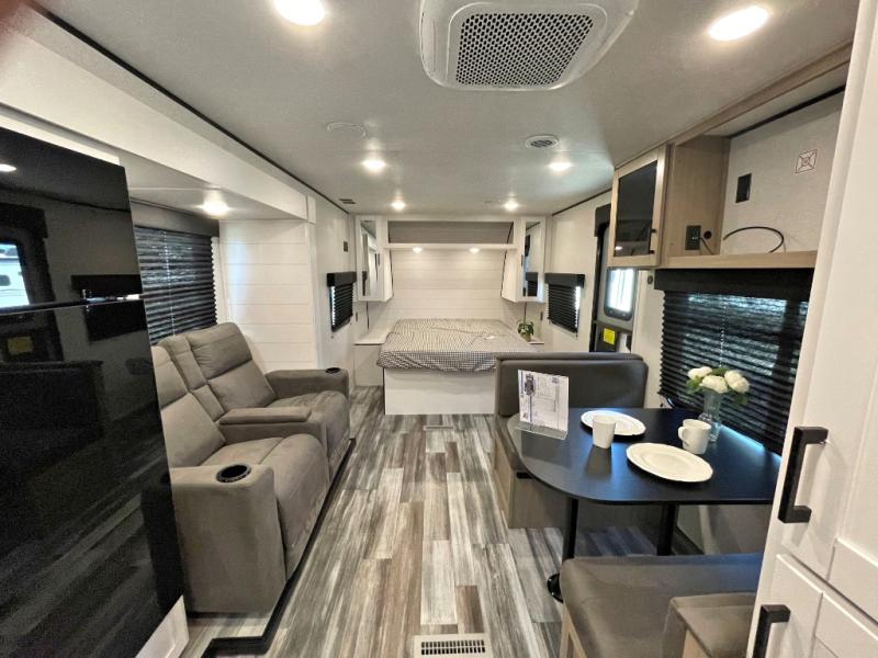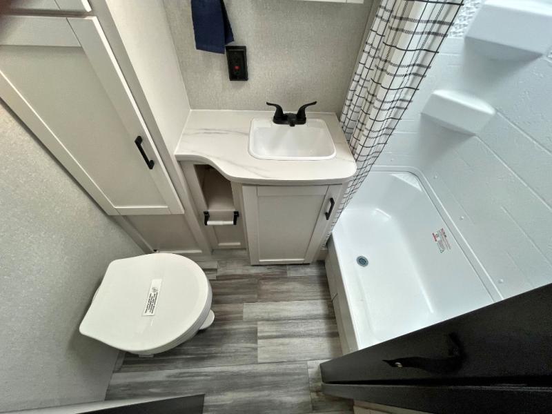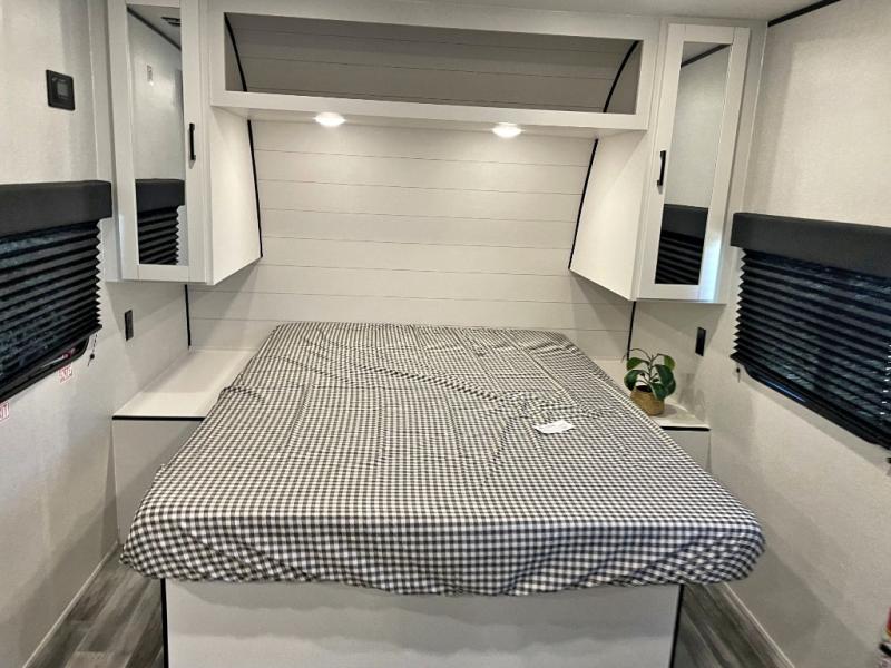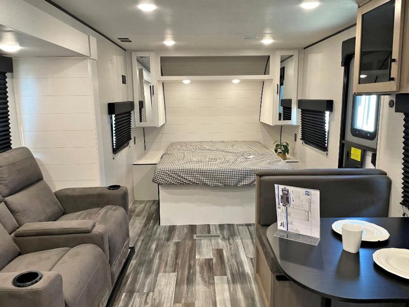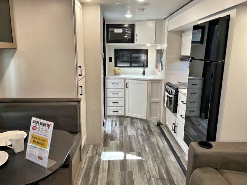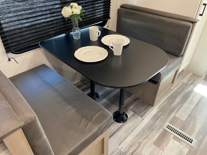 You will have a comfortable camping trip in this travel trailer! It offers full kitchen amenities including a pantry for snacks and such, plus a full rear corner bathroom for privacy and includes a shower. When you need a break, the semi-private bedroom up front offers a queen bed, dual wardrobes and a curtain to close, and the booth dinette can transform into a sleeping space as well. There is a 18' power awning with LED lights for you to enjoy this outdoor space into the night, plus exterior storage for your outdoor games and gear.