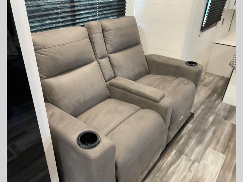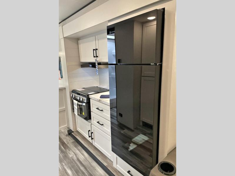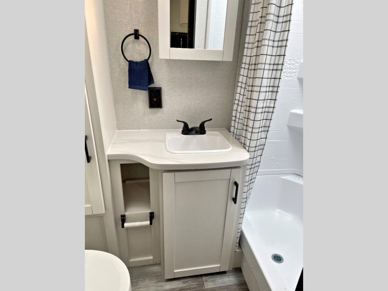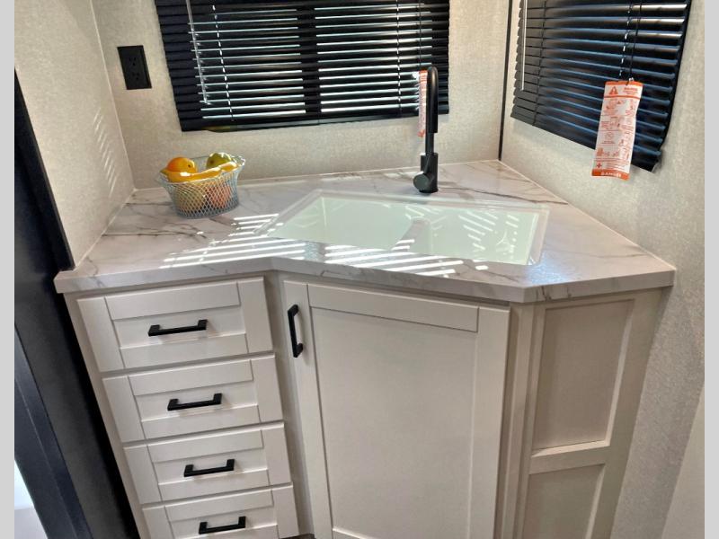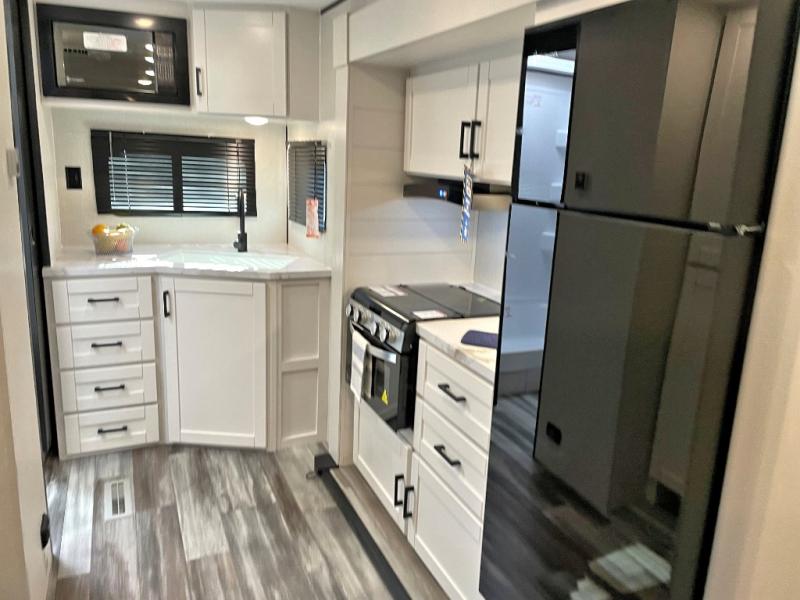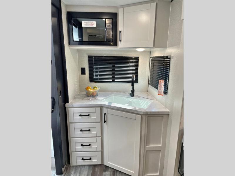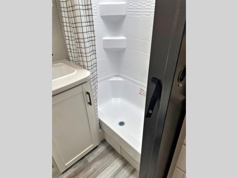 You will have a comfortable camping trip in this travel trailer! It offers full kitchen amenities including a pantry for snacks and such, plus a full rear corner bathroom for privacy and includes a shower. When you need a break, the semi-private bedroom up front offers a queen bed, dual wardrobes and a curtain to close, and the booth dinette can transform into a sleeping space as well. There is a 18' power awning with LED lights for you to enjoy this outdoor space into the night, plus exterior storage for your outdoor games and gear.