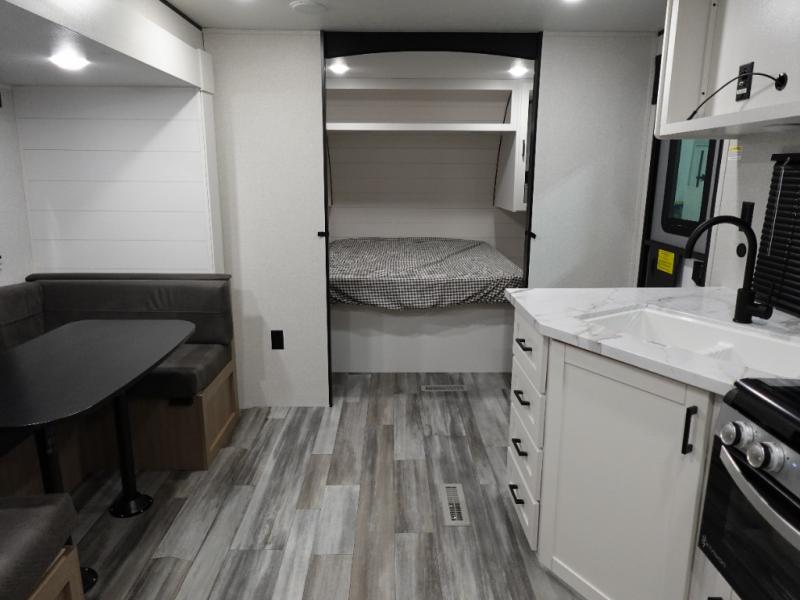 You can comfortably sleep eight people in this travel trailer thanks to the double-size bunks in back, the 60" x 80" queen bed in the front bedroom, plus the U-shaped dinette within the slide out! The chef of your crew will have a three burner cooktop and microwave oven to prepare meals, and everyone can store their favorite drinks in the 12V refrigerator inside or in the exterior refrigerator! This unit also includes ample storage space, including a large pantry and dual bedside wardrobes.