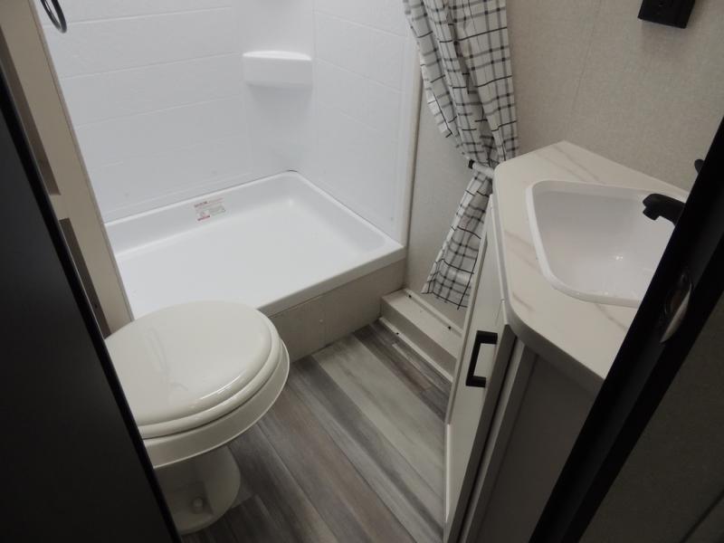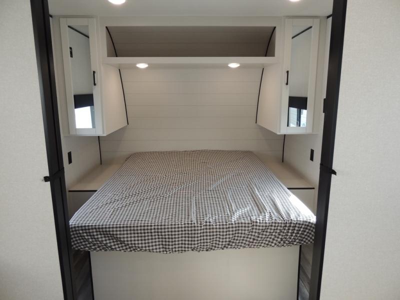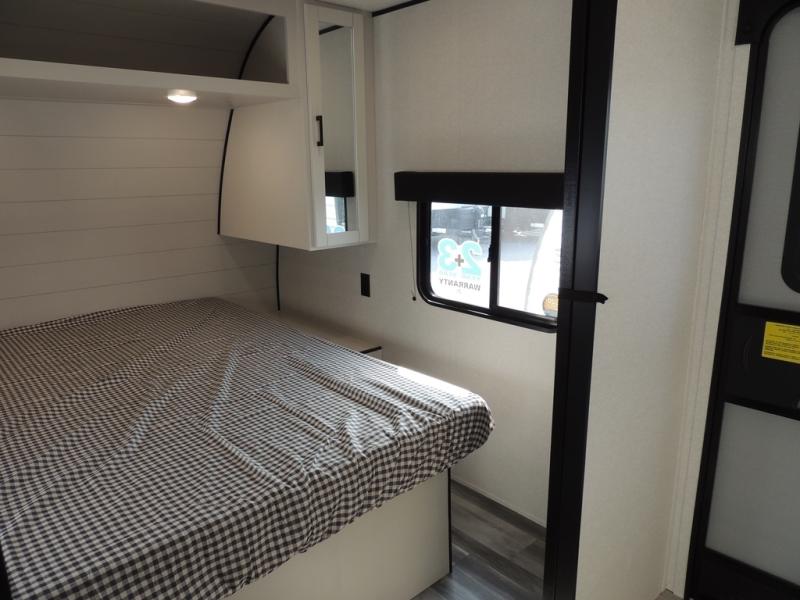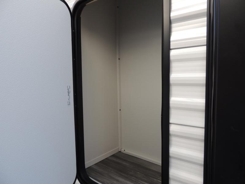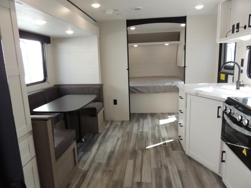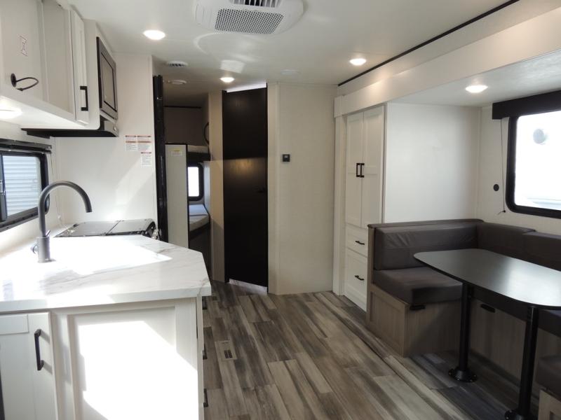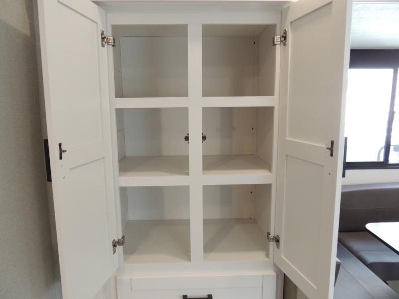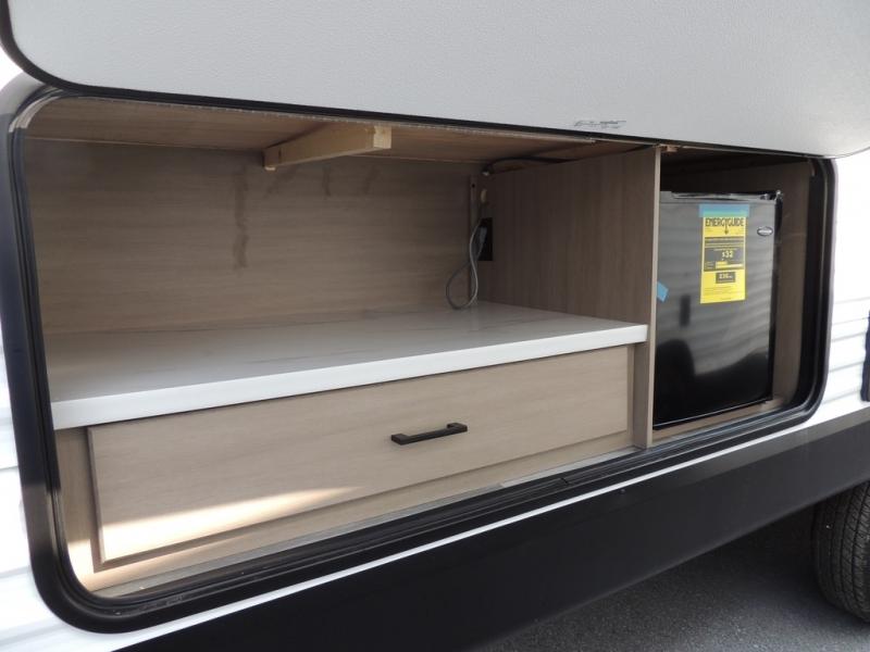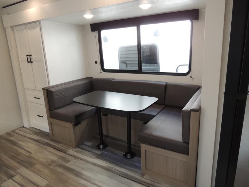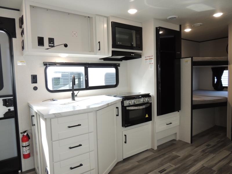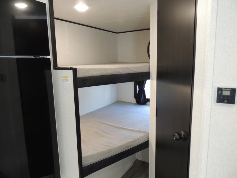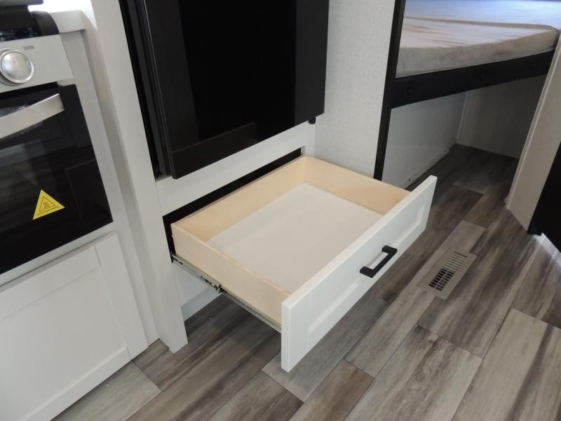 You can comfortably sleep eight people in this travel trailer thanks to the double-size bunks in back, the 60" x 80" queen bed in the front bedroom, plus the U-shaped dinette within the slide out! The chef of your crew will have a three burner cooktop and microwave oven to prepare meals, and everyone can store their favorite drinks in the 12V refrigerator inside or in the exterior refrigerator! This unit also includes ample storage space, including a large pantry and dual bedside wardrobes.
