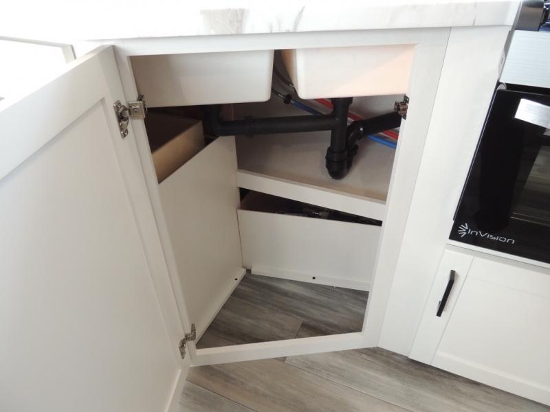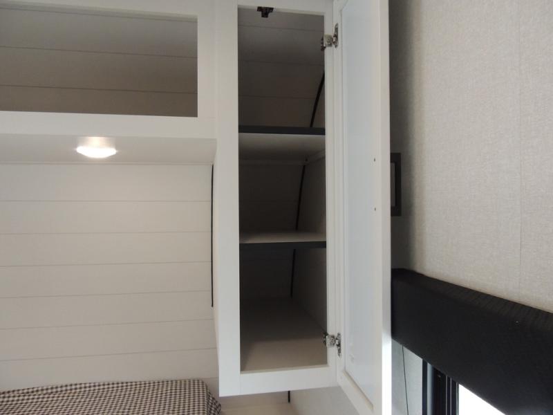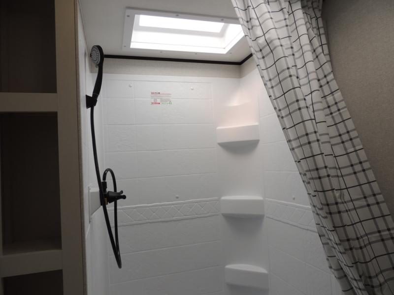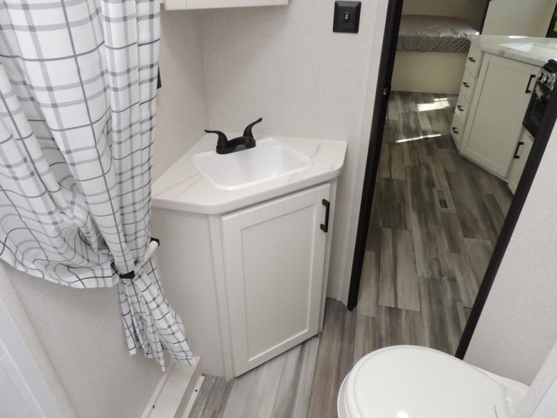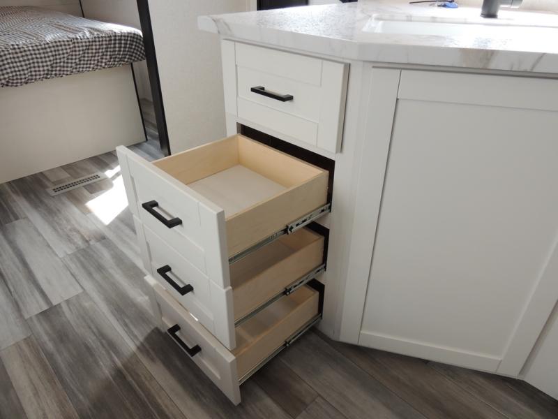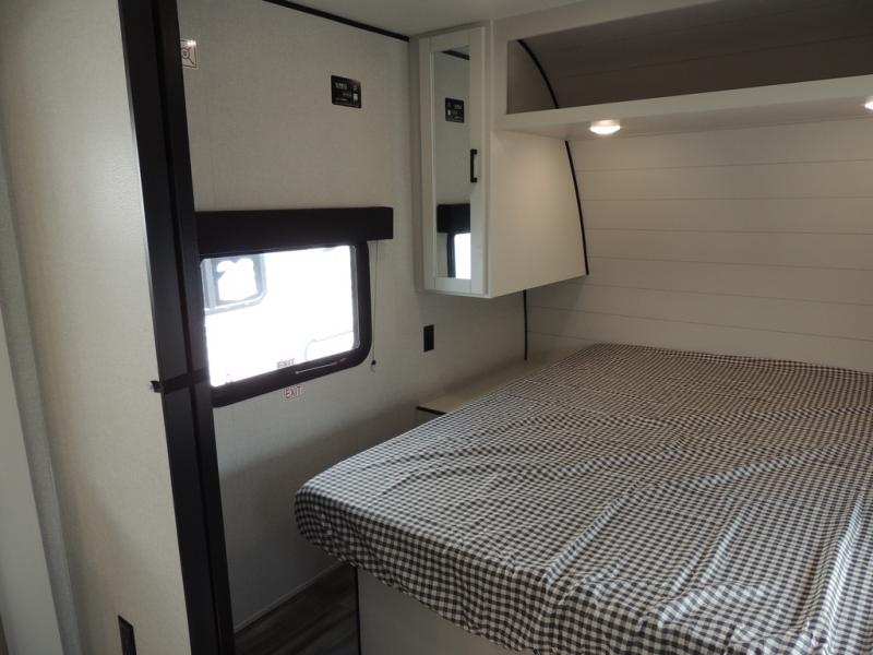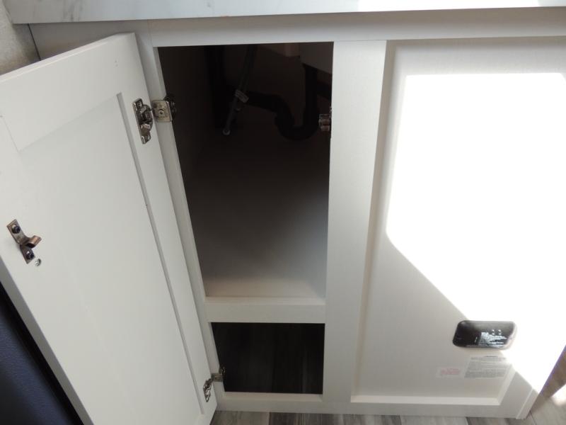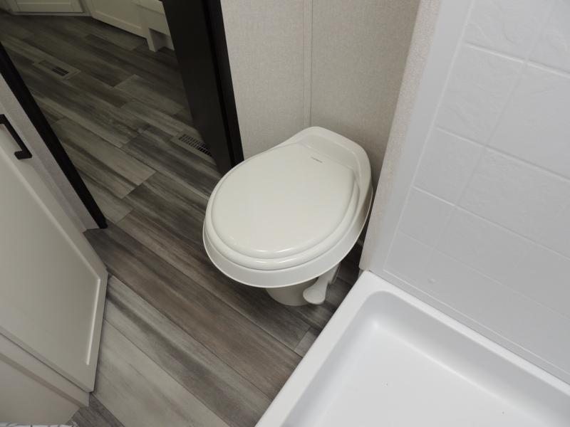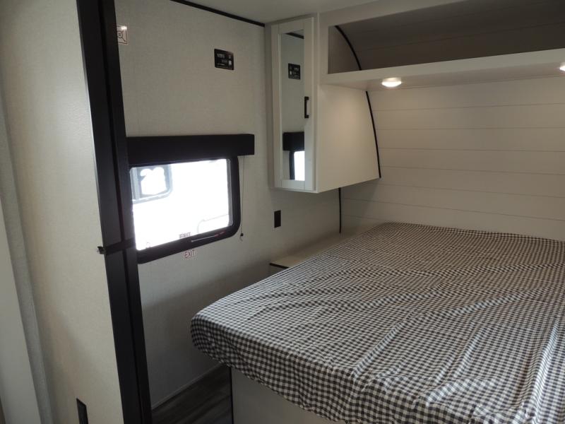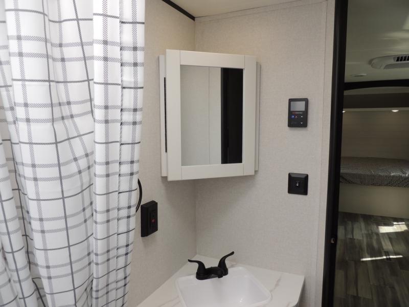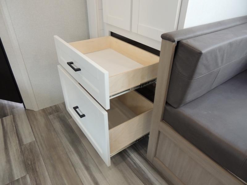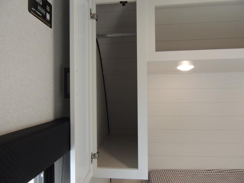 You can comfortably sleep eight people in this travel trailer thanks to the double-size bunks in back, the 60" x 80" queen bed in the front bedroom, plus the U-shaped dinette within the slide out! The chef of your crew will have a three burner cooktop and microwave oven to prepare meals, and everyone can store their favorite drinks in the 12V refrigerator inside or in the exterior refrigerator! This unit also includes ample storage space, including a large pantry and dual bedside wardrobes.