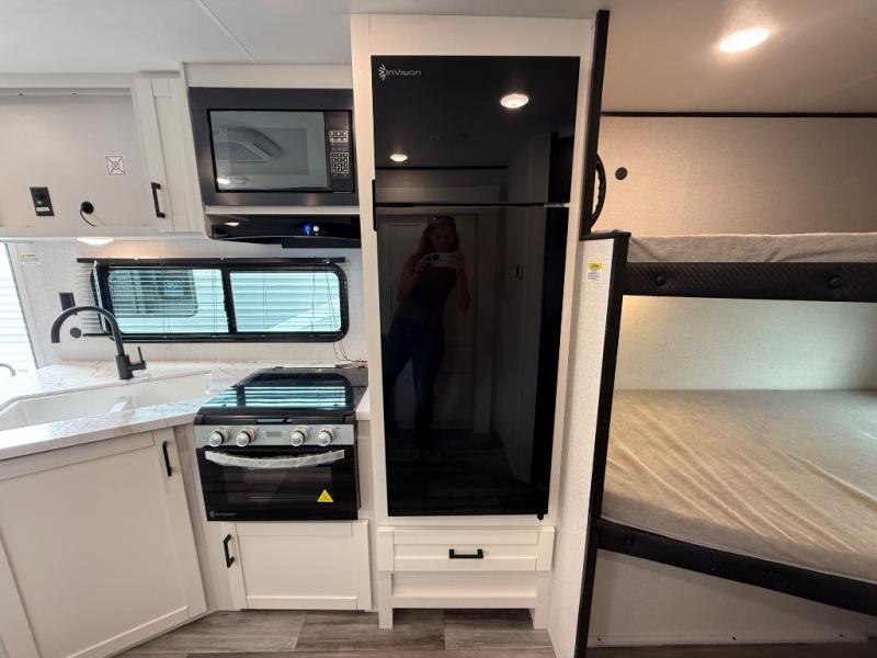 You can comfortably sleep eight people in this travel trailer thanks to the double-size bunks in back, the 60" x 80" queen bed in the front bedroom, plus the U-shaped dinette within the slide out! The chef of your crew will have a three burner cooktop and microwave oven to prepare meals, and everyone can store their favorite drinks in the 12V refrigerator inside or in the exterior refrigerator! This unit also includes ample storage space, including a large pantry and dual bedside wardrobes.