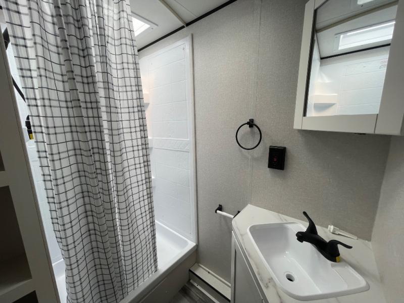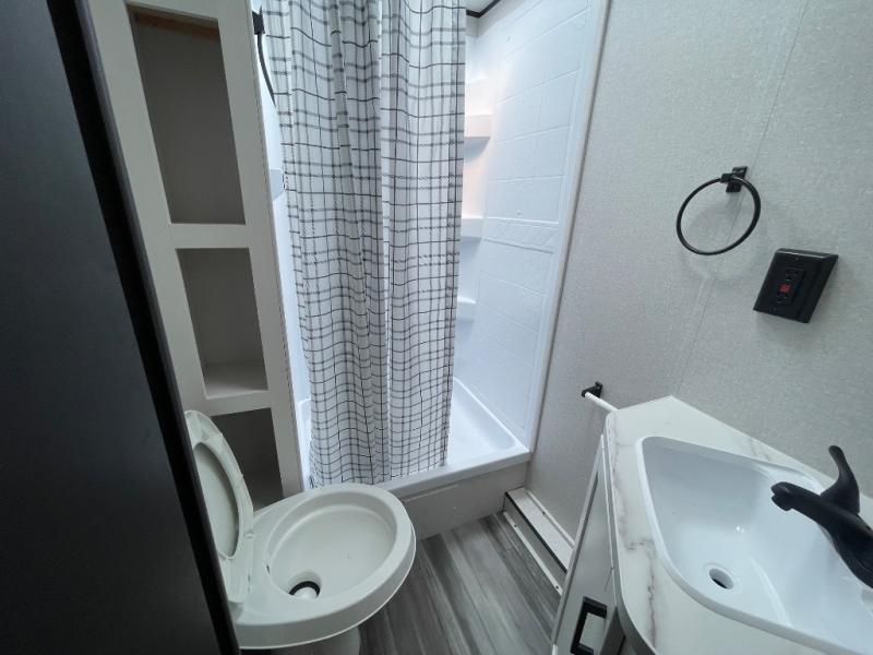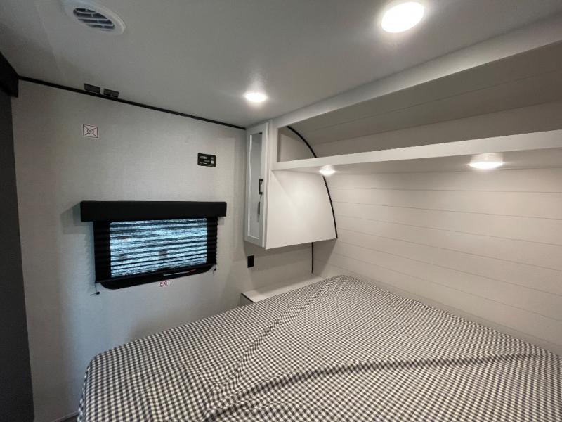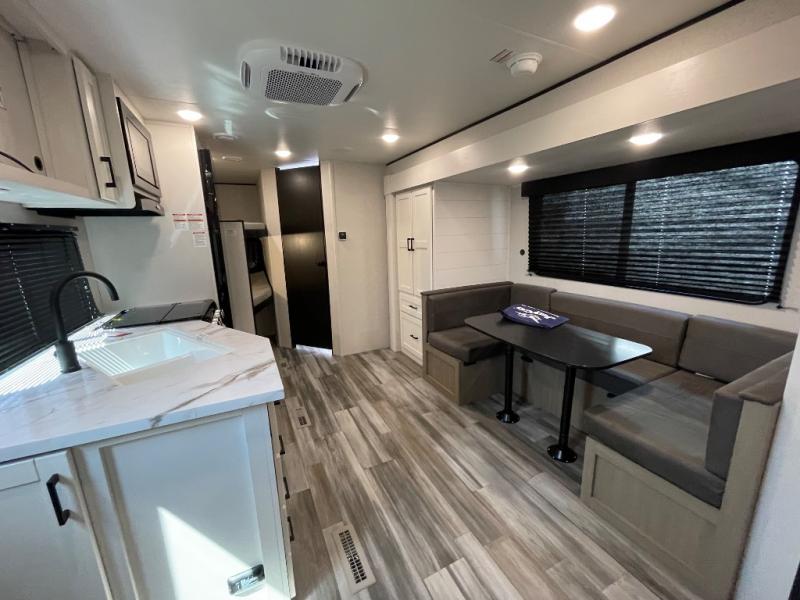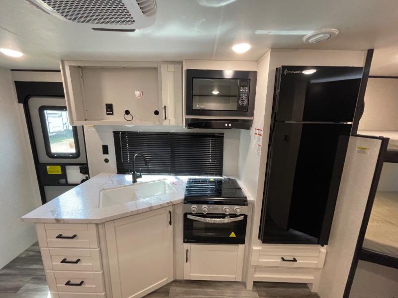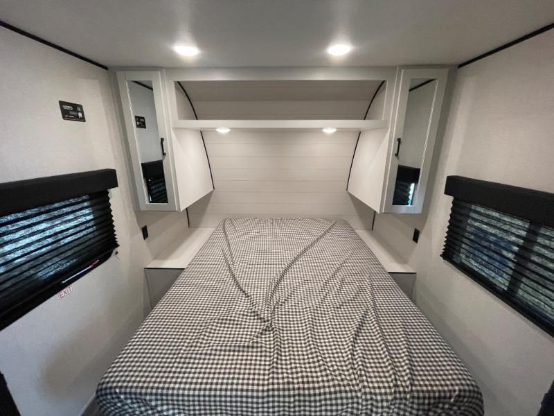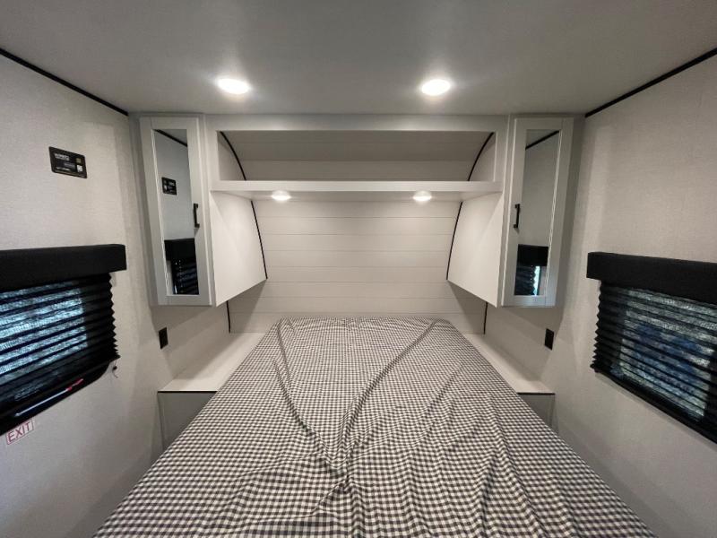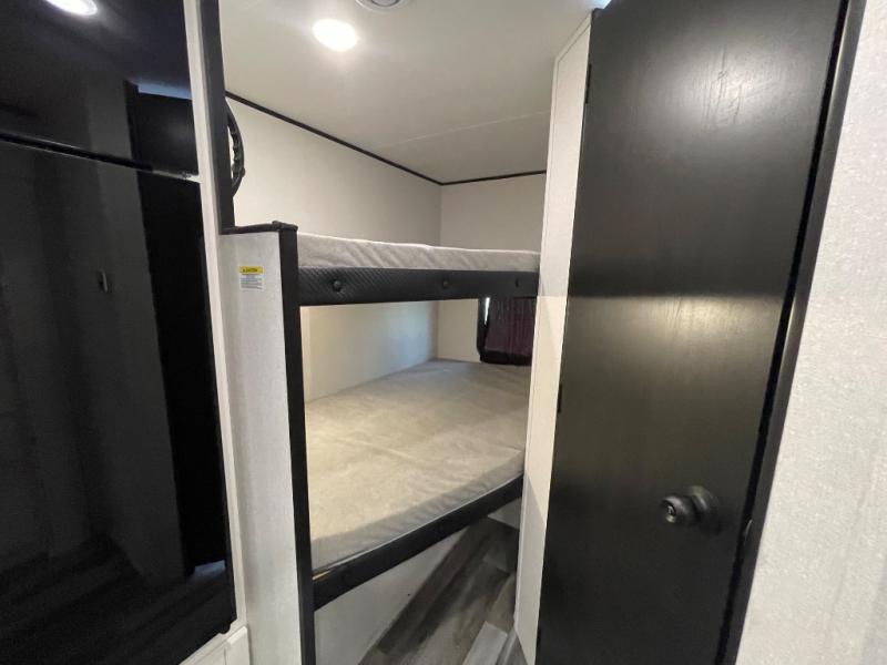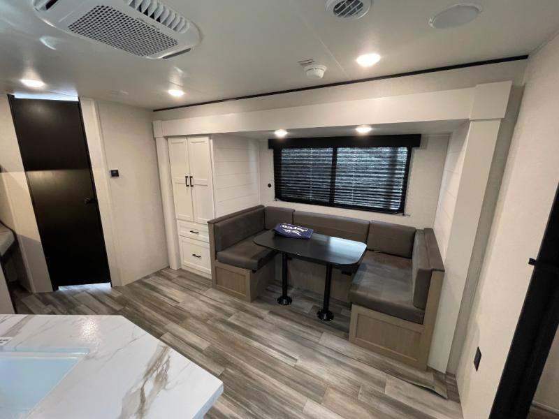 You can comfortably sleep eight people in this travel trailer thanks to the double-size bunks in back, the 60" x 80" queen bed in the front bedroom, plus the U-shaped dinette within the slide out! The chef of your crew will have a three burner cooktop and microwave oven to prepare meals, and everyone can store their favorite drinks in the 12V refrigerator inside or in the exterior refrigerator! This unit also includes ample storage space, including a large pantry and dual bedside wardrobes.