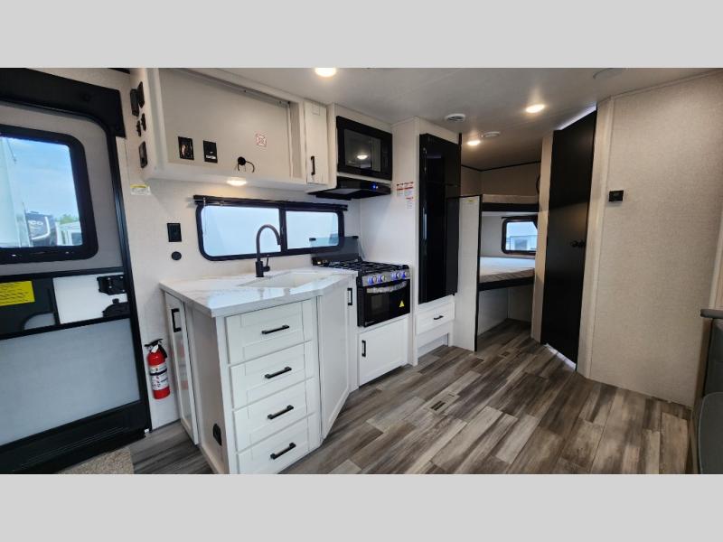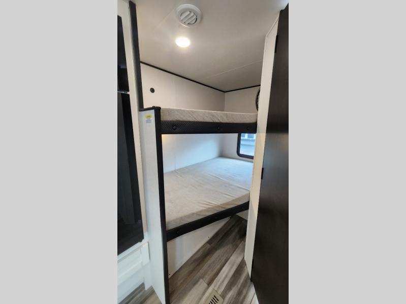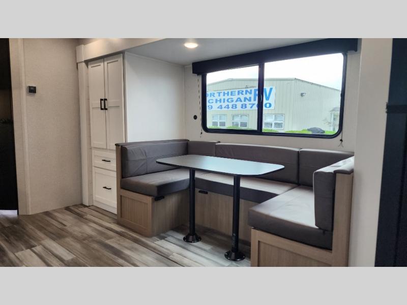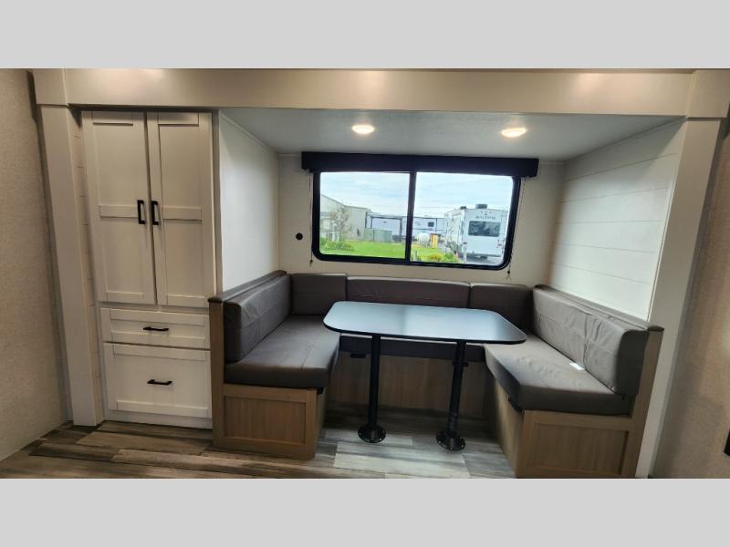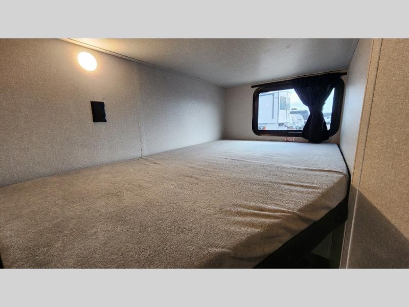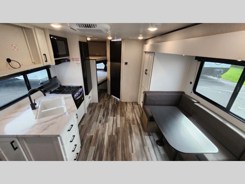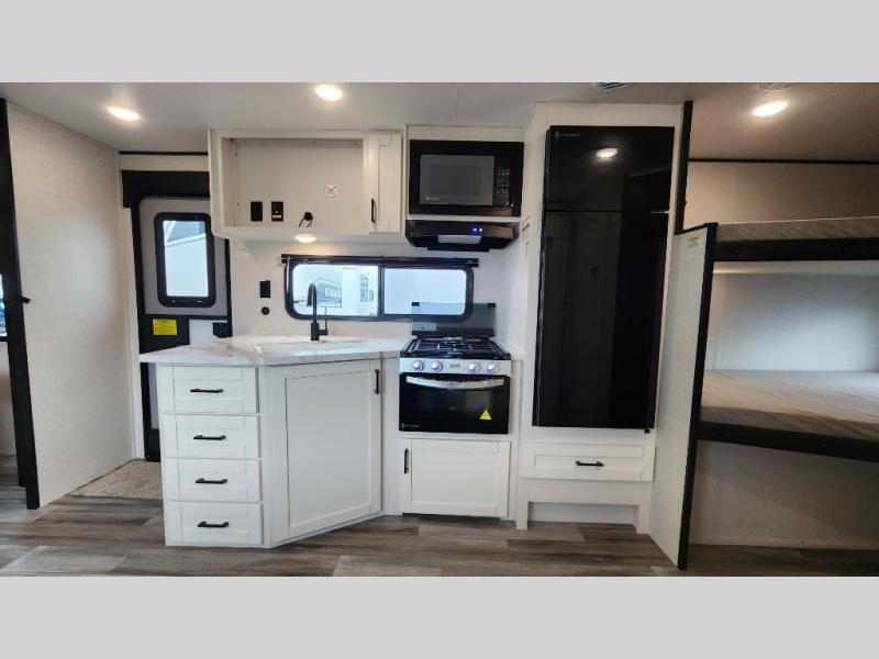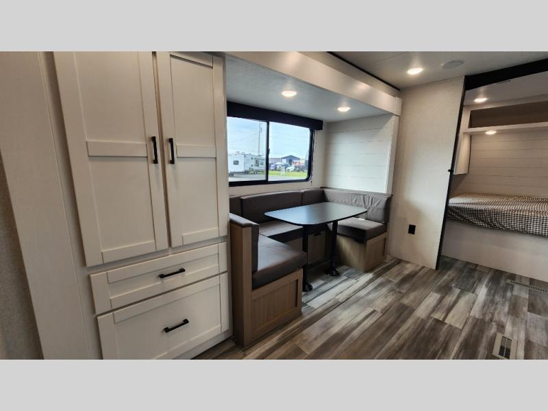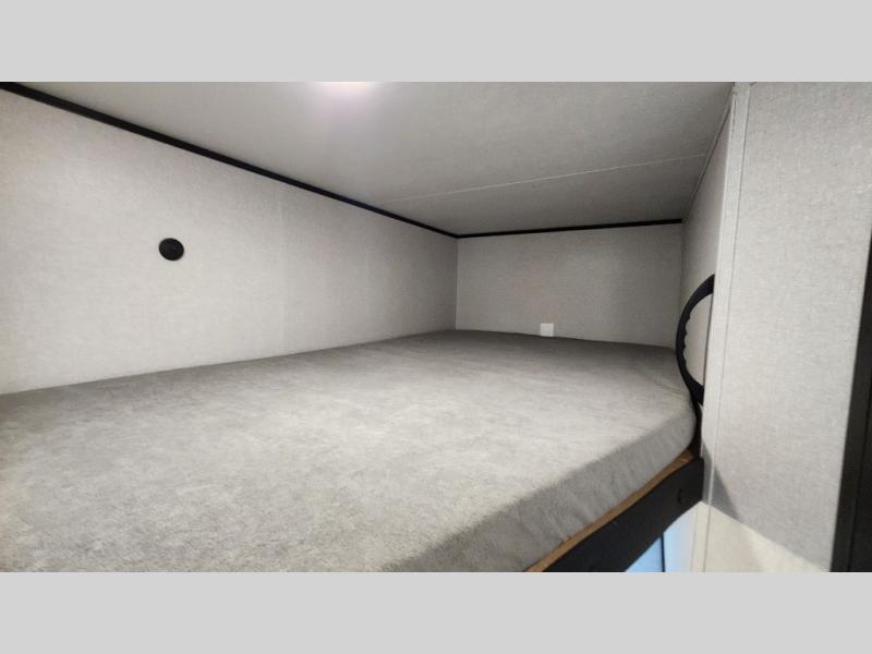 You can comfortably sleep eight people in this travel trailer thanks to the double-size bunks in back, the 60" x 80" queen bed in the front bedroom, plus the U-shaped dinette within the slide out! The chef of your crew will have a three burner cooktop and microwave oven to prepare meals, and everyone can store their favorite drinks in the 12V refrigerator inside or in the exterior refrigerator! This unit also includes ample storage space, including a large pantry and dual bedside wardrobes.