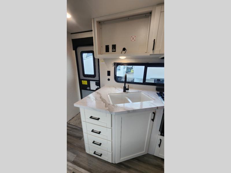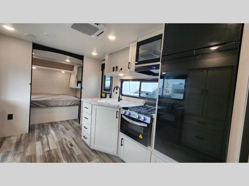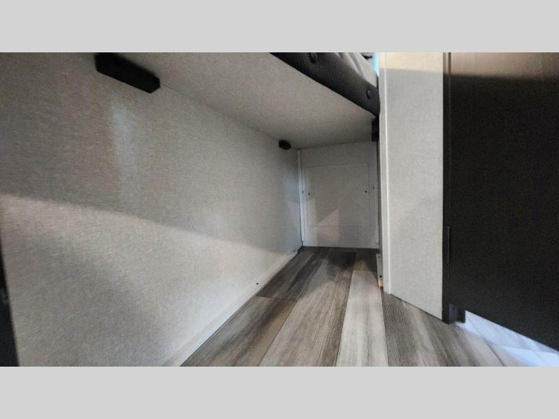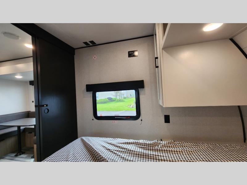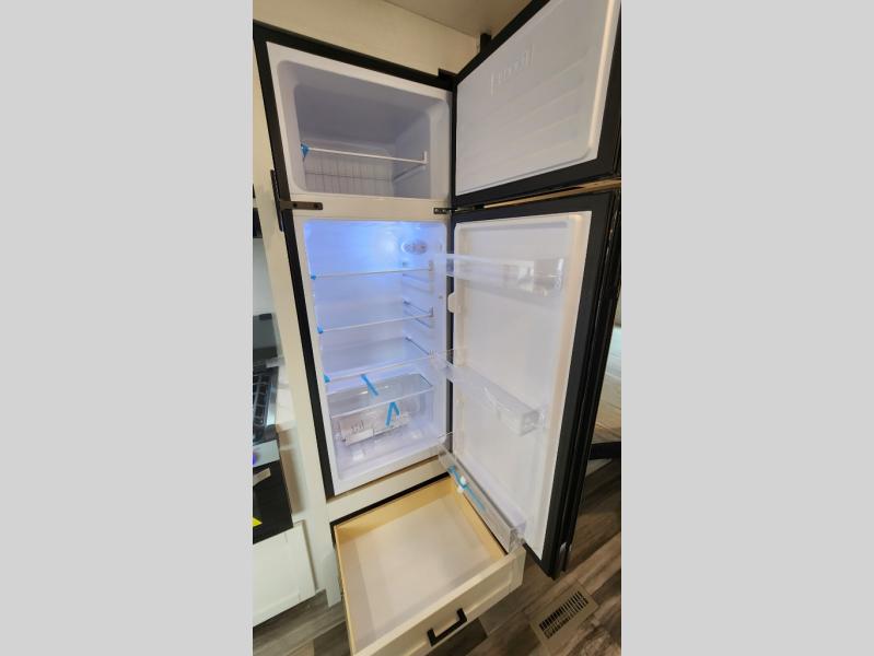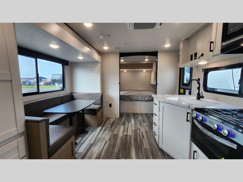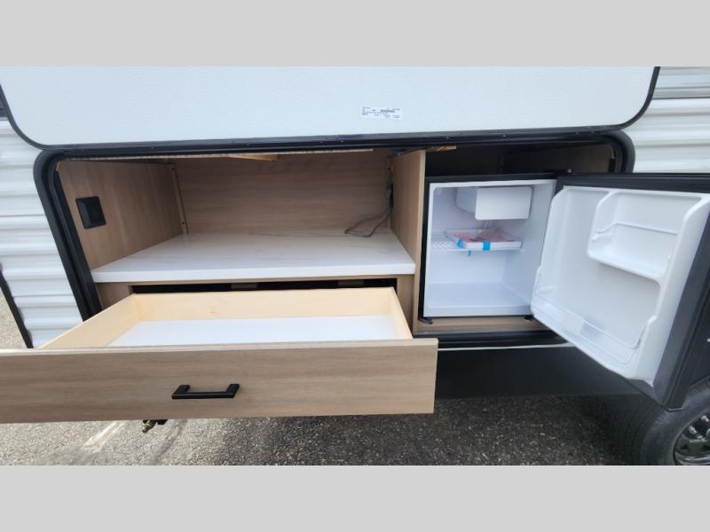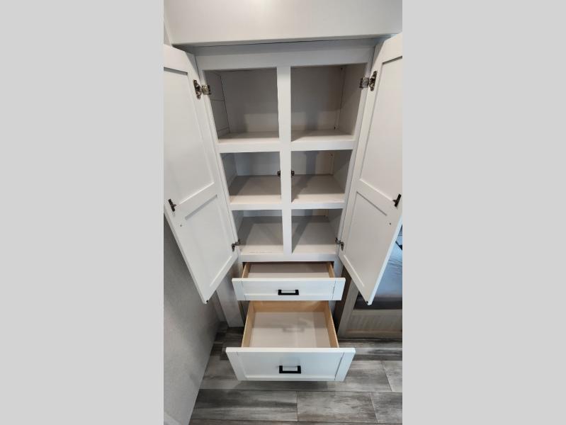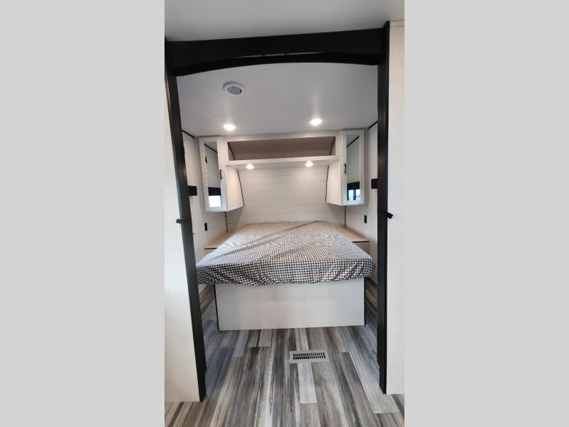 You can comfortably sleep eight people in this travel trailer thanks to the double-size bunks in back, the 60" x 80" queen bed in the front bedroom, plus the U-shaped dinette within the slide out! The chef of your crew will have a three burner cooktop and microwave oven to prepare meals, and everyone can store their favorite drinks in the 12V refrigerator inside or in the exterior refrigerator! This unit also includes ample storage space, including a large pantry and dual bedside wardrobes.