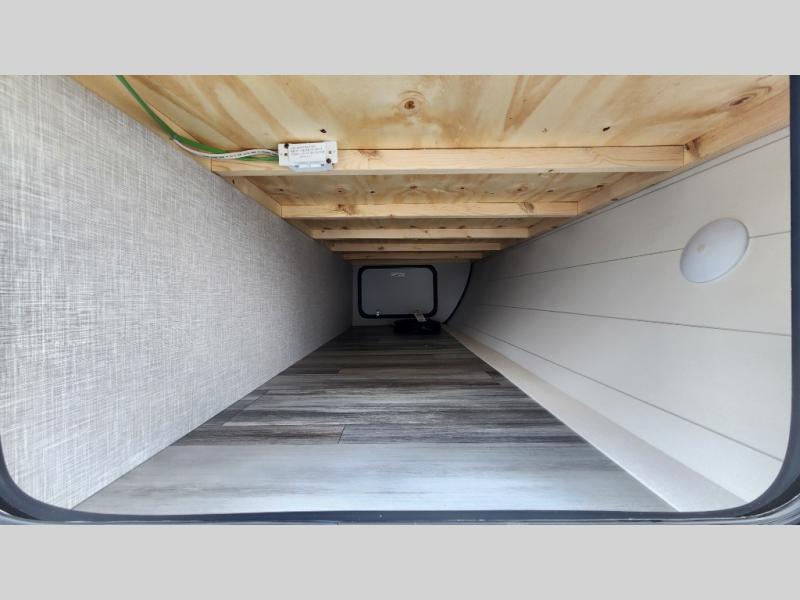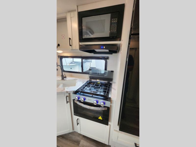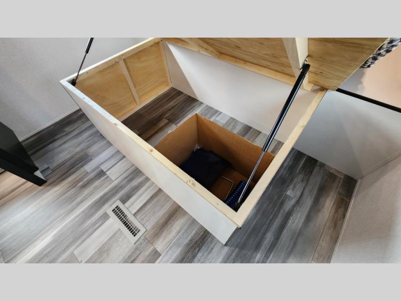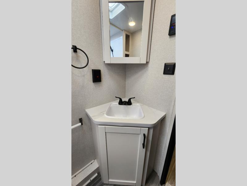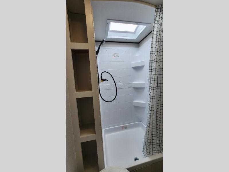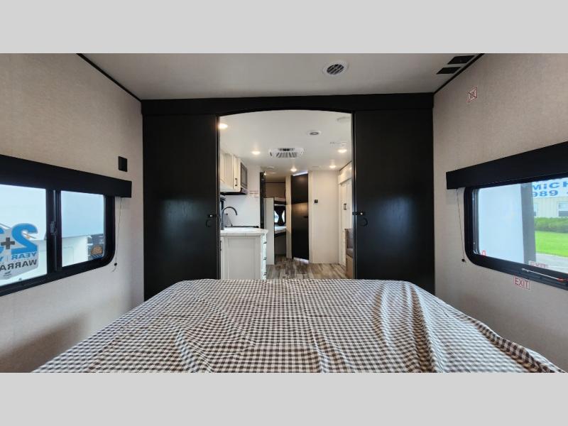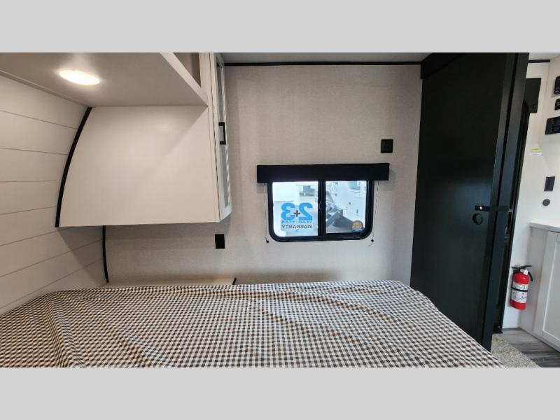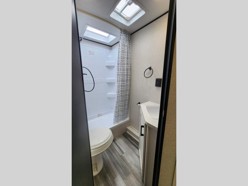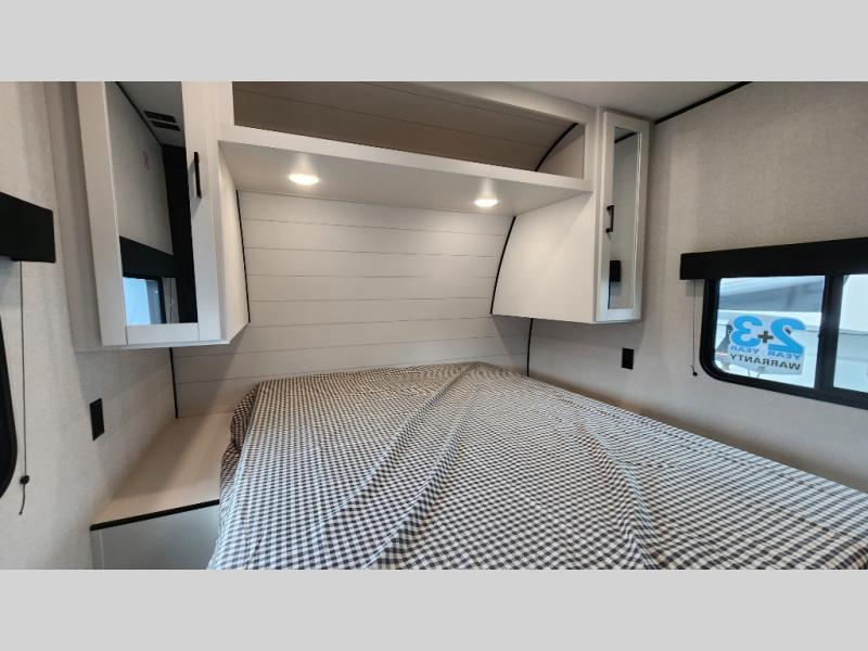 You can comfortably sleep eight people in this travel trailer thanks to the double-size bunks in back, the 60" x 80" queen bed in the front bedroom, plus the U-shaped dinette within the slide out! The chef of your crew will have a three burner cooktop and microwave oven to prepare meals, and everyone can store their favorite drinks in the 12V refrigerator inside or in the exterior refrigerator! This unit also includes ample storage space, including a large pantry and dual bedside wardrobes.
