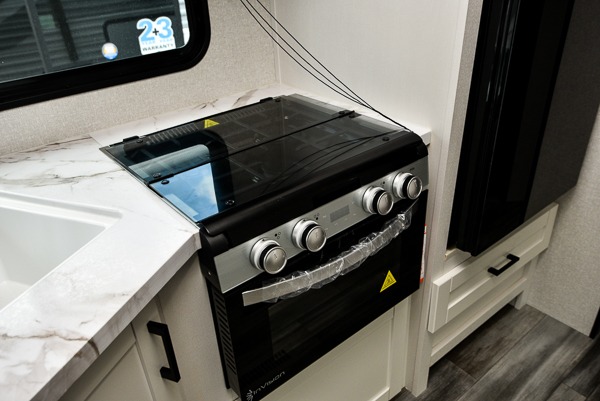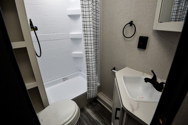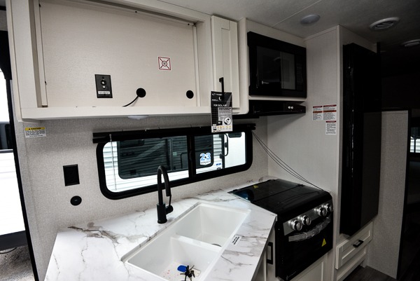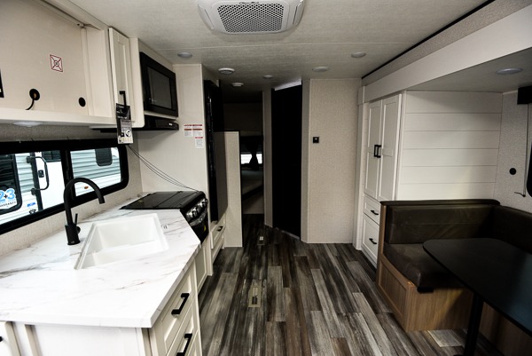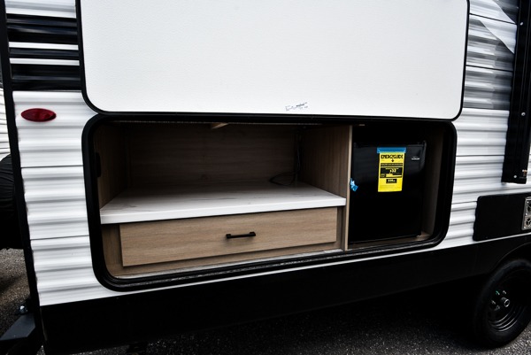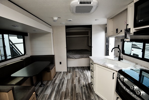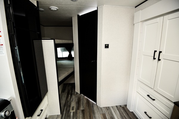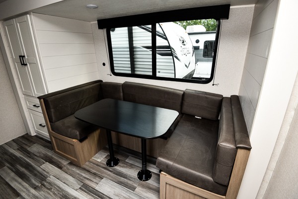 You can comfortably sleep eight people in this travel trailer thanks to the double-size bunks in back, the 60" x 80" queen bed in the front bedroom, plus the U-shaped dinette within the slide out! The chef of your crew will have a three burner cooktop and microwave oven to prepare meals, and everyone can store their favorite drinks in the 12V refrigerator inside or in the exterior refrigerator! This unit also includes ample storage space, including a large pantry and dual bedside wardrobes.
