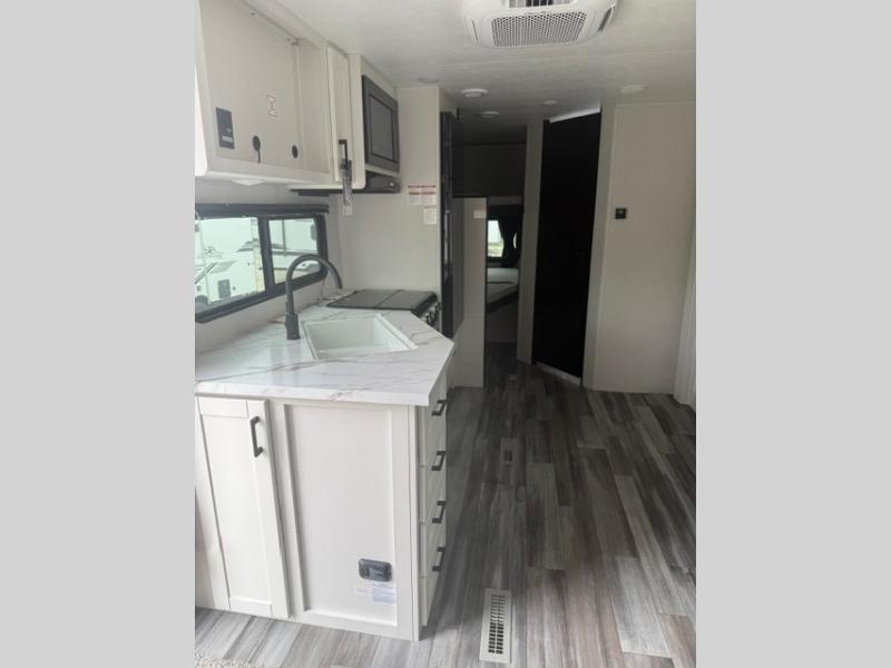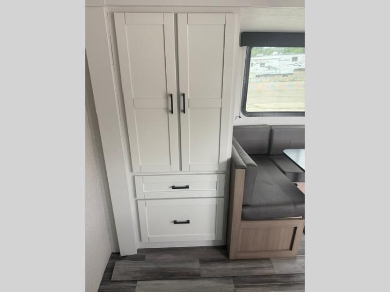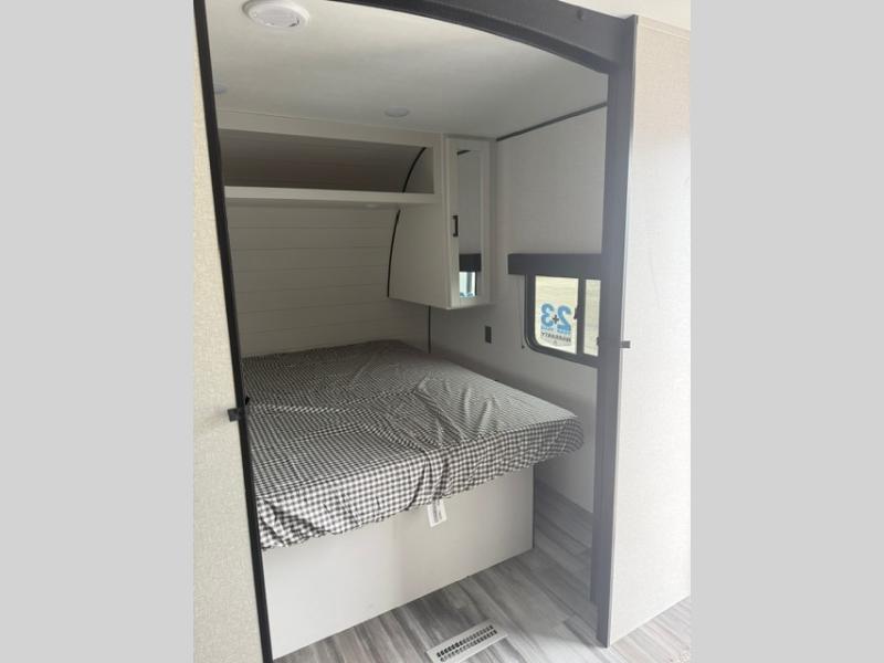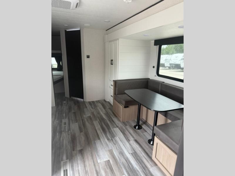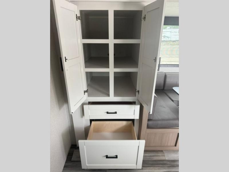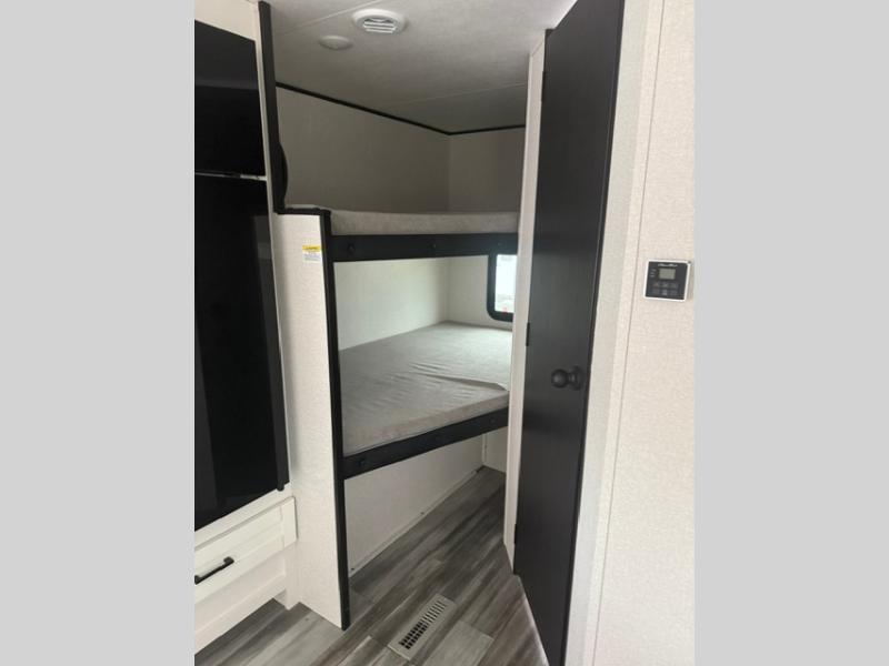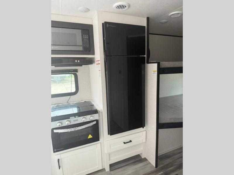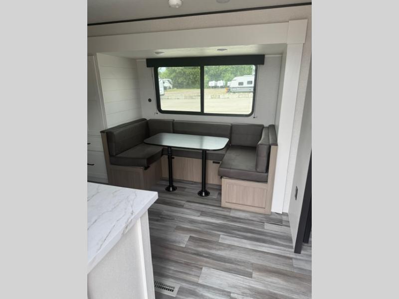 You can comfortably sleep eight people in this travel trailer thanks to the double-size bunks in back, the 60" x 80" queen bed in the front bedroom, plus the U-shaped dinette within the slide out! The chef of your crew will have a three burner cooktop and microwave oven to prepare meals, and everyone can store their favorite drinks in the 12V refrigerator inside or in the exterior refrigerator! This unit also includes ample storage space, including a large pantry and dual bedside wardrobes.