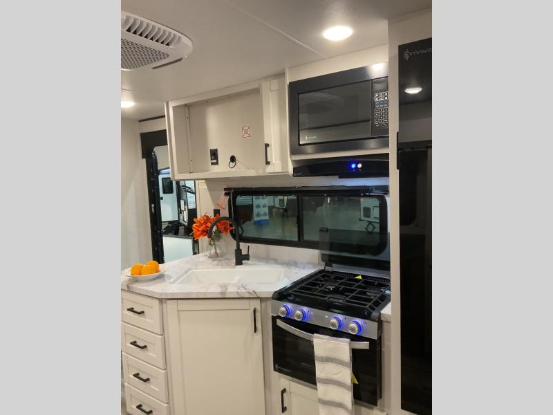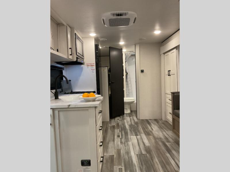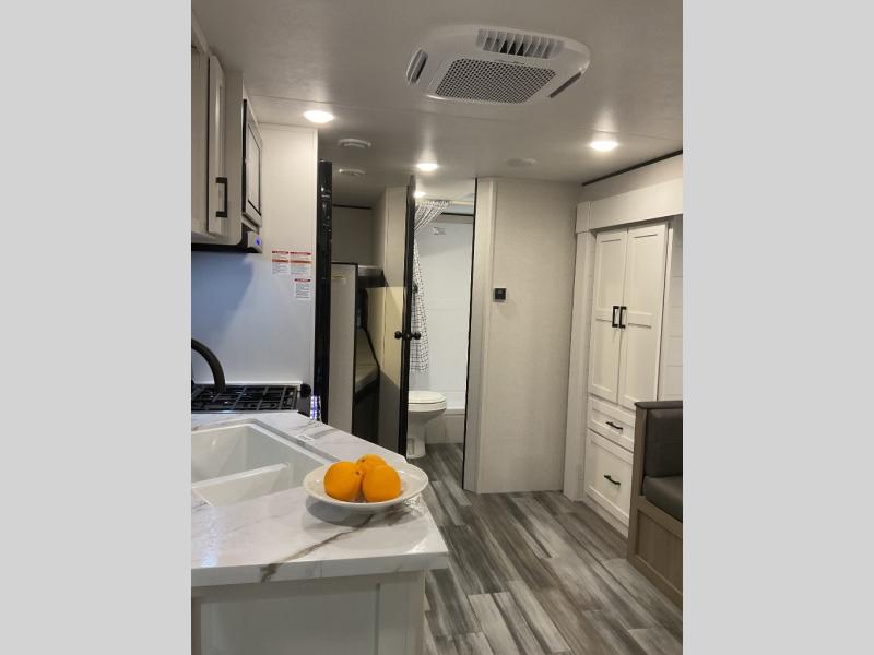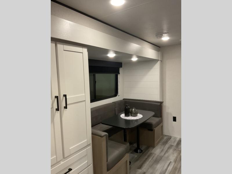 You can comfortably sleep eight people in this travel trailer thanks to the double-size bunks in back, the 60" x 80" queen bed in the front bedroom, plus the U-shaped dinette within the slide out! The chef of your crew will have a three burner cooktop and microwave oven to prepare meals, and everyone can store their favorite drinks in the 12V refrigerator inside or in the exterior refrigerator! This unit also includes ample storage space, including a large pantry and dual bedside wardrobes.