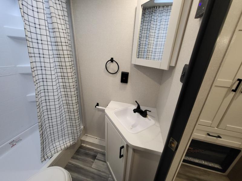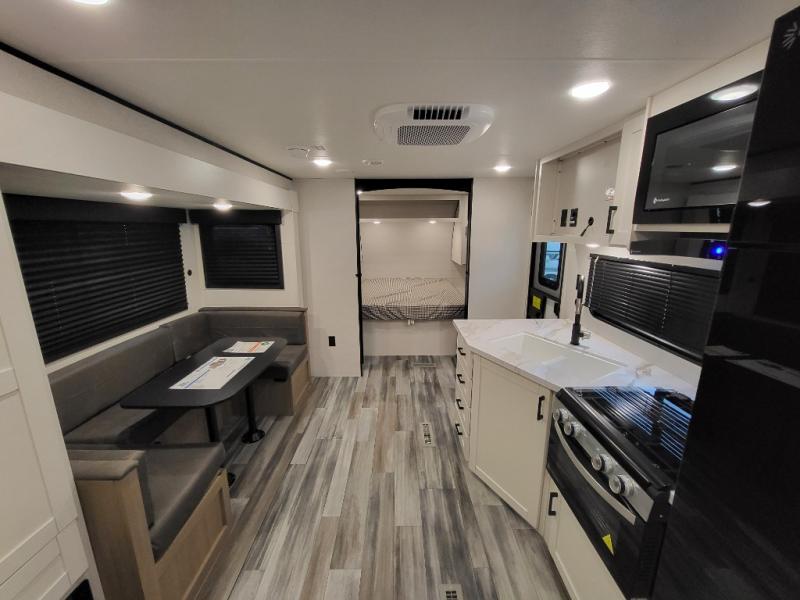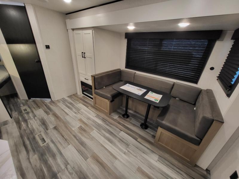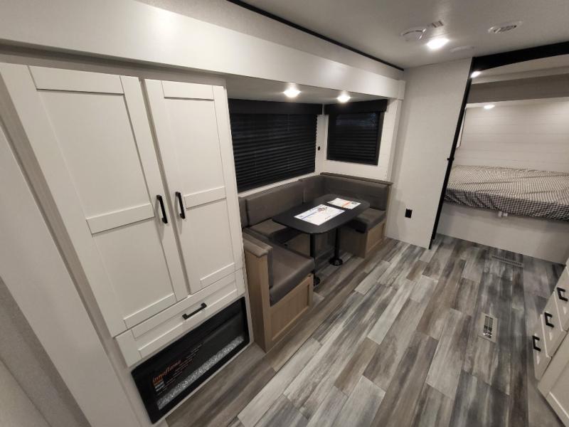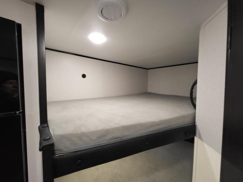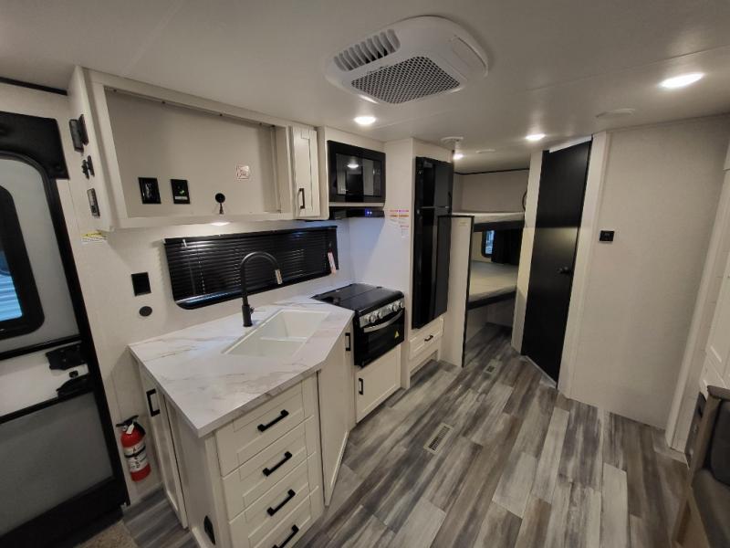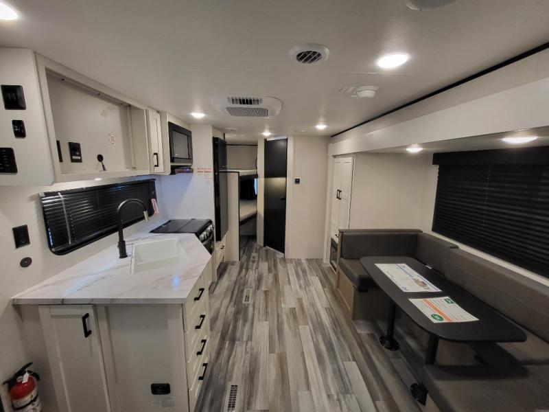 You can comfortably sleep eight people in this travel trailer thanks to the double-size bunks in back, the 60" x 80" queen bed in the front bedroom, plus the U-shaped dinette within the slide out! The chef of your crew will have a three burner cooktop and microwave oven to prepare meals, and everyone can store their favorite drinks in the 12V refrigerator inside or in the exterior refrigerator! This unit also includes ample storage space, including a large pantry and dual bedside wardrobes.