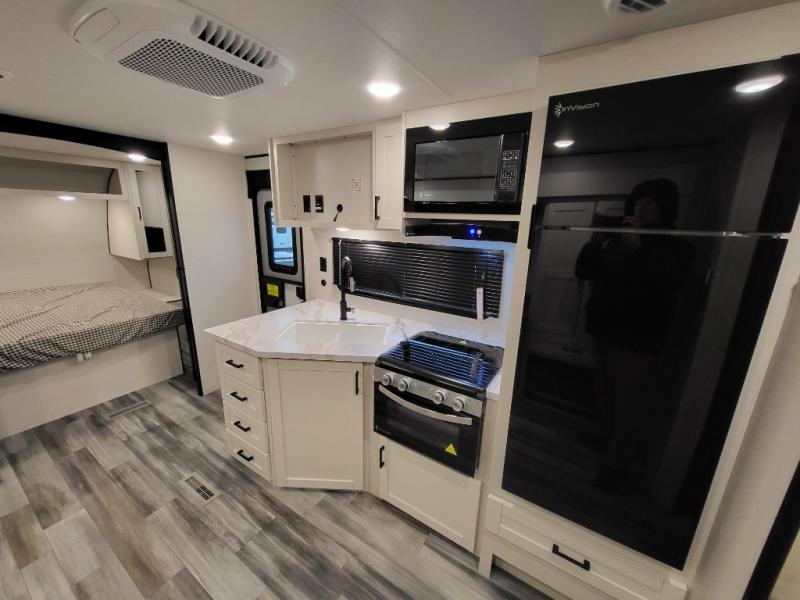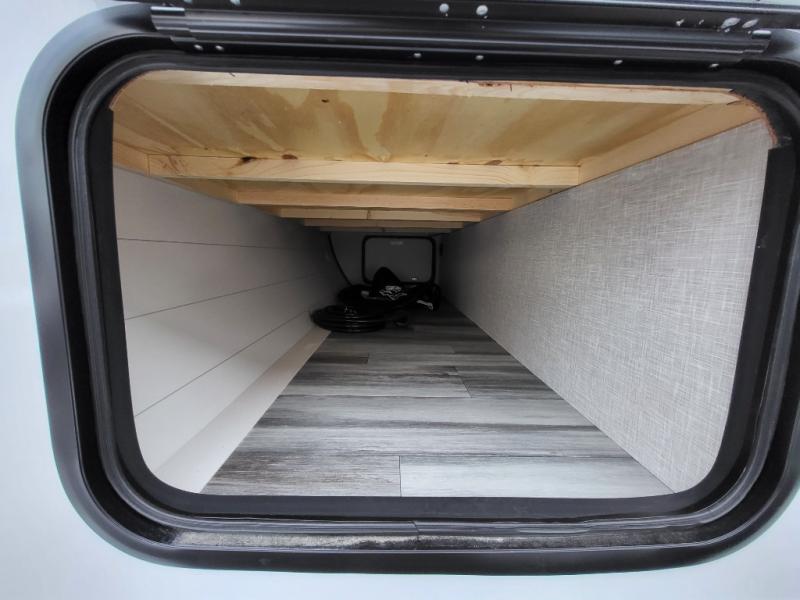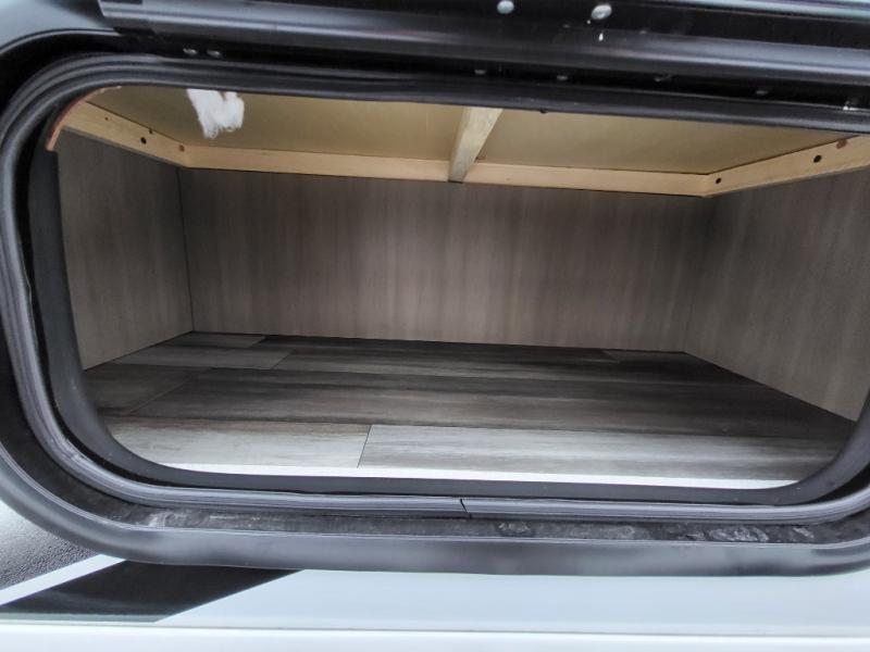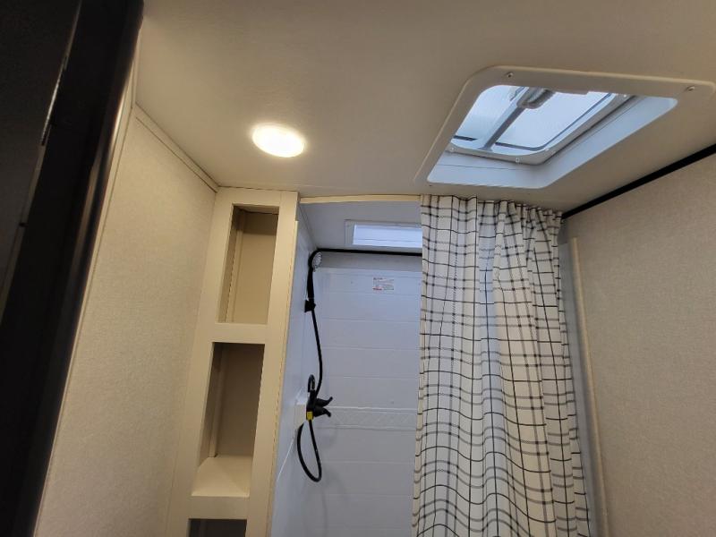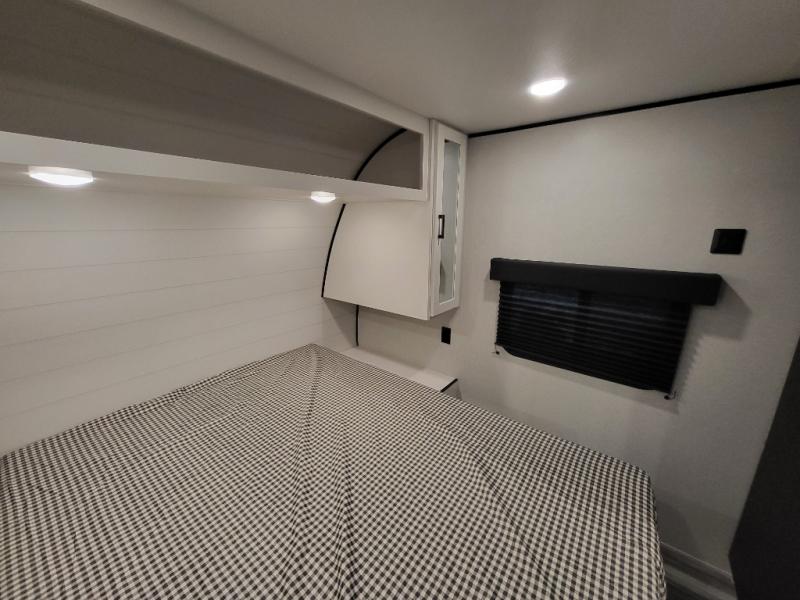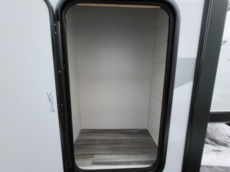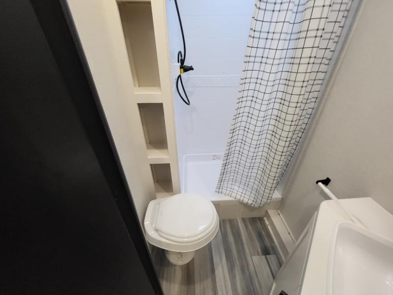 You can comfortably sleep eight people in this travel trailer thanks to the double-size bunks in back, the 60" x 80" queen bed in the front bedroom, plus the U-shaped dinette within the slide out! The chef of your crew will have a three burner cooktop and microwave oven to prepare meals, and everyone can store their favorite drinks in the 12V refrigerator inside or in the exterior refrigerator! This unit also includes ample storage space, including a large pantry and dual bedside wardrobes.
