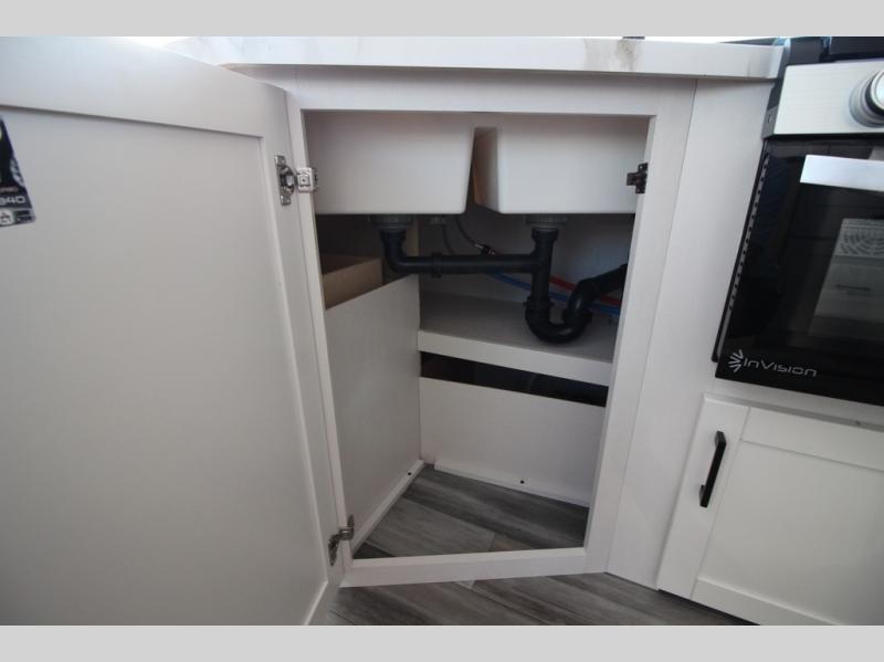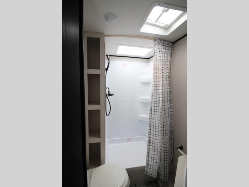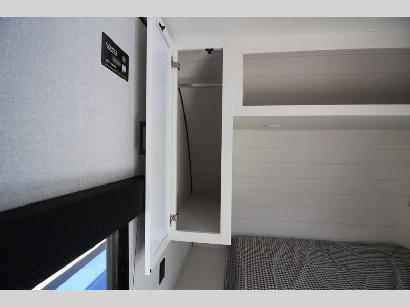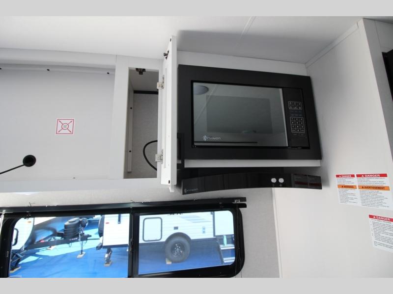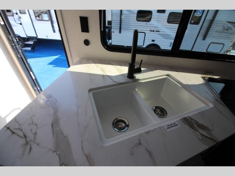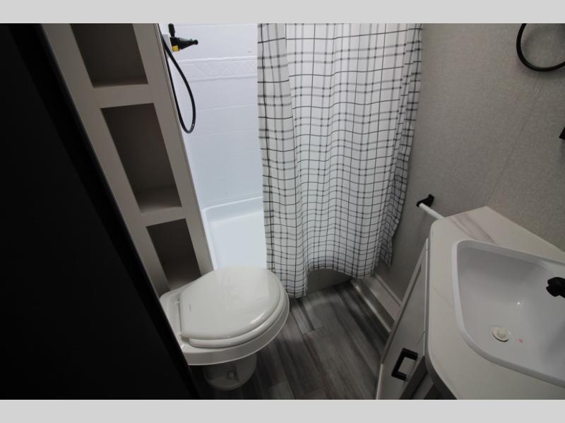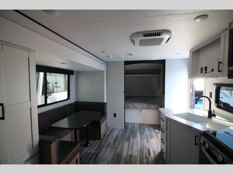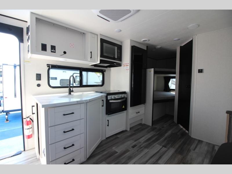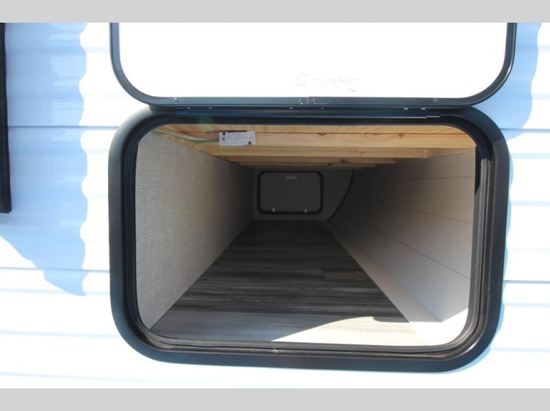You can comfortably sleep eight people in this travel trailer thanks to the double-size bunks in back, the 60" x 80" queen bed in the front bedroom, plus the U-shaped dinette within the slide out! The chef of your crew will have a three burner cooktop and microwave oven to prepare meals, and everyone can store their favorite drinks in the 12V refrigerator inside or in the exterior refrigerator! This unit also includes ample storage space, including a large pantry and dual bedside wardrobes.