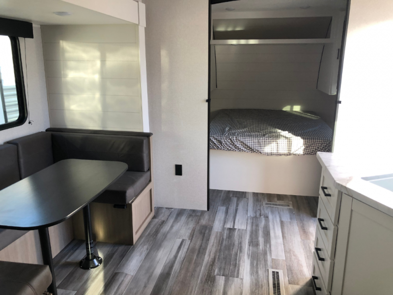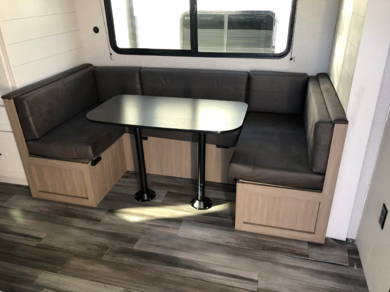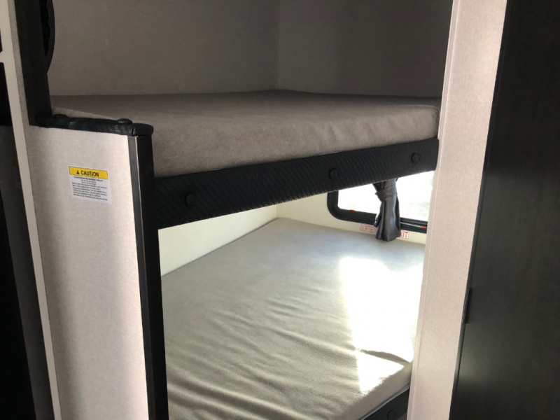 You can comfortably sleep eight people in this travel trailer thanks to the double-size bunks in back, the 60" x 80" queen bed in the front bedroom, plus the U-shaped dinette within the slide out! The chef of your crew will have a three burner cooktop and microwave oven to prepare meals, and everyone can store their favorite drinks in the 12V refrigerator inside or in the exterior refrigerator! This unit also includes ample storage space, including a large pantry and dual bedside wardrobes.