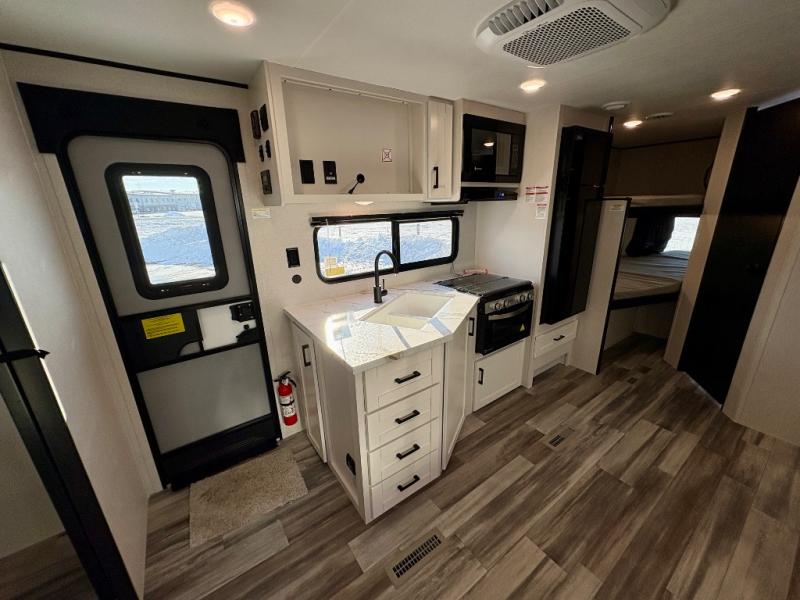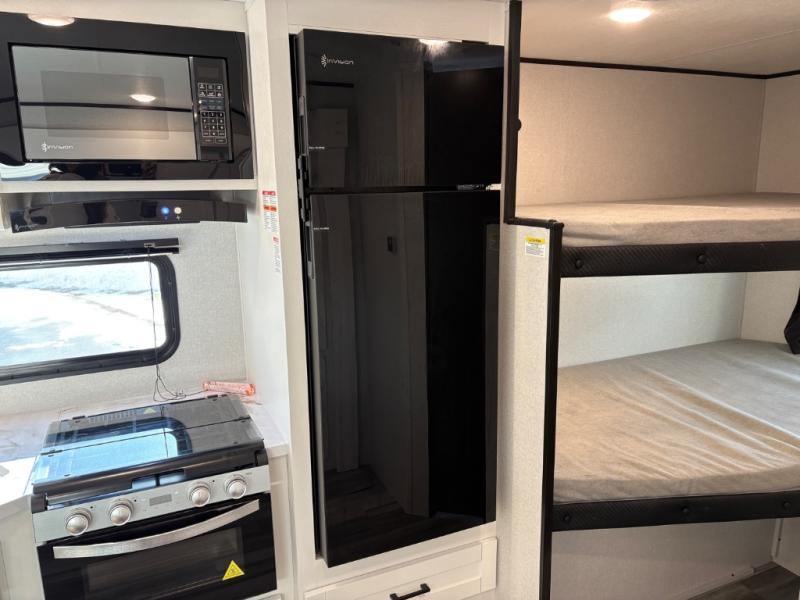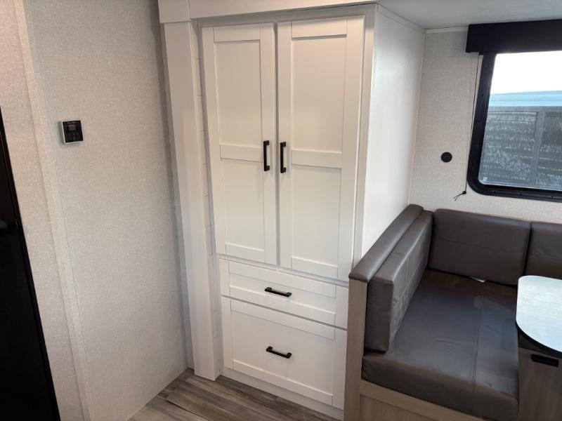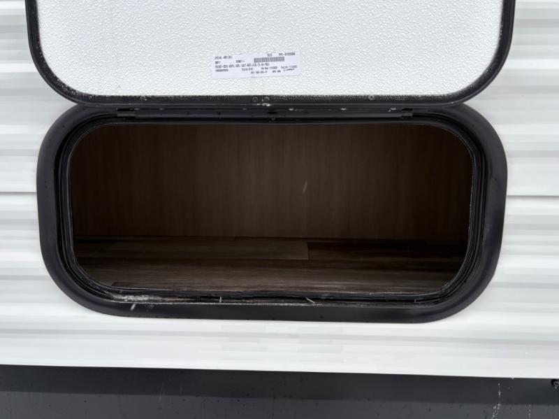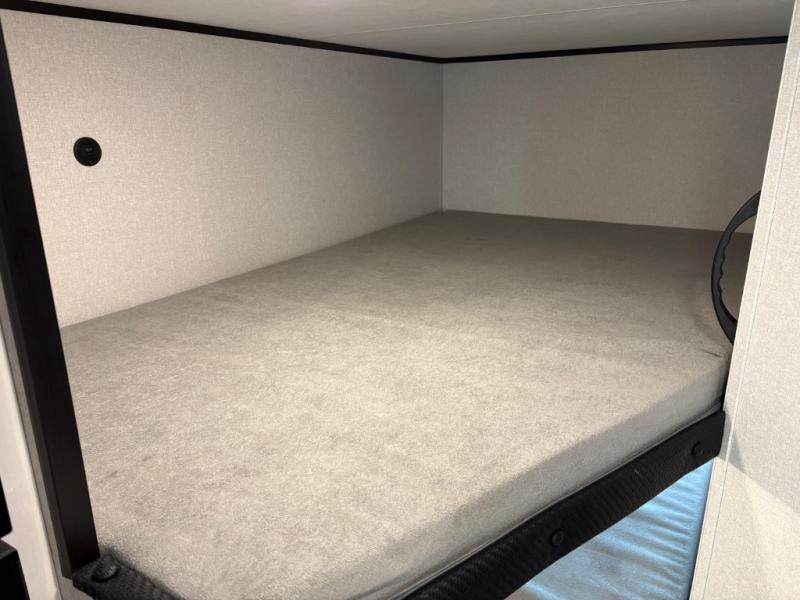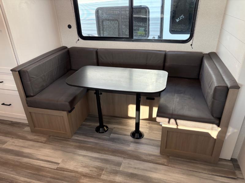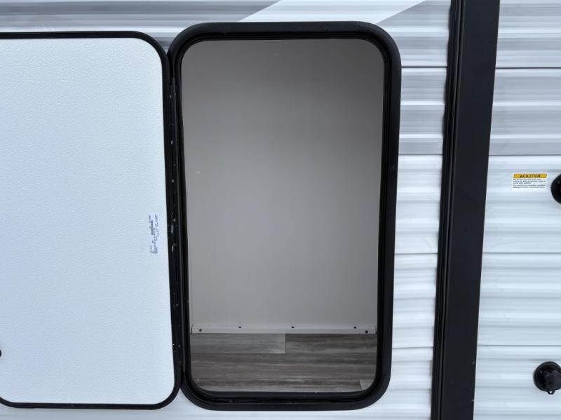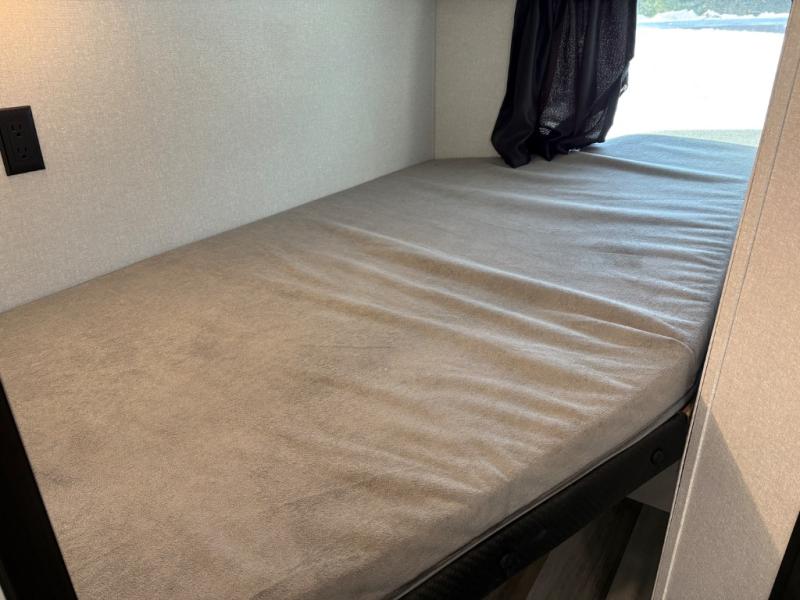 You can comfortably sleep eight people in this travel trailer thanks to the double-size bunks in back, the 60" x 80" queen bed in the front bedroom, plus the U-shaped dinette within the slide out! The chef of your crew will have a three burner cooktop and microwave oven to prepare meals, and everyone can store their favorite drinks in the 12V refrigerator inside or in the exterior refrigerator! This unit also includes ample storage space, including a large pantry and dual bedside wardrobes.