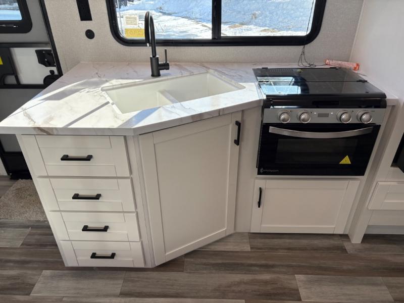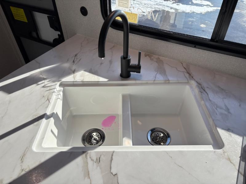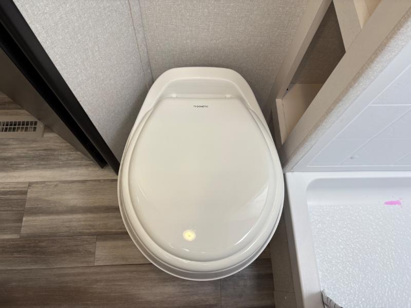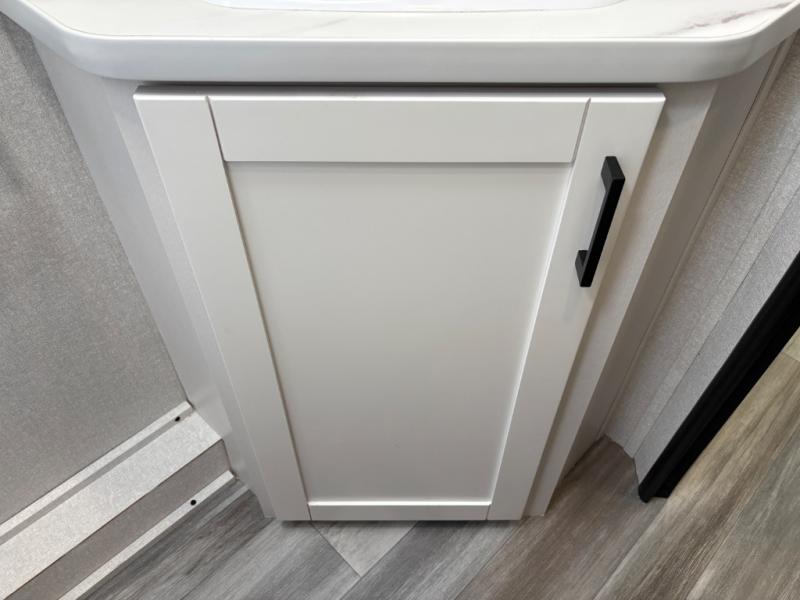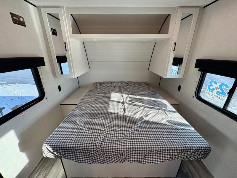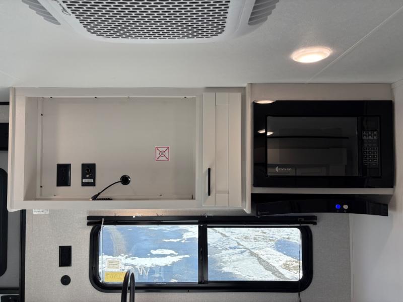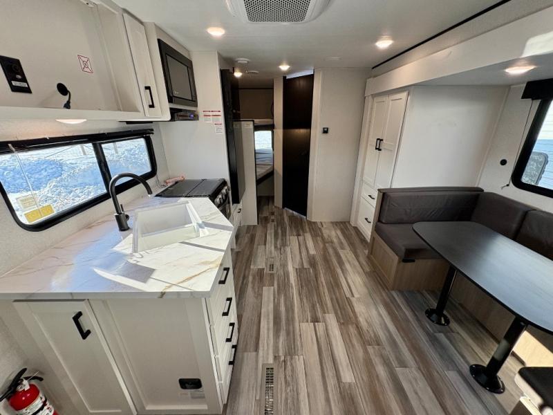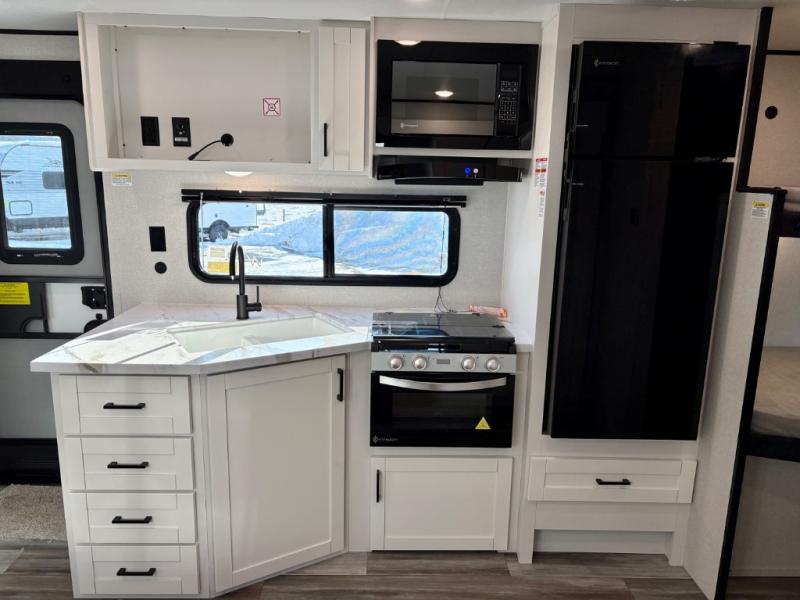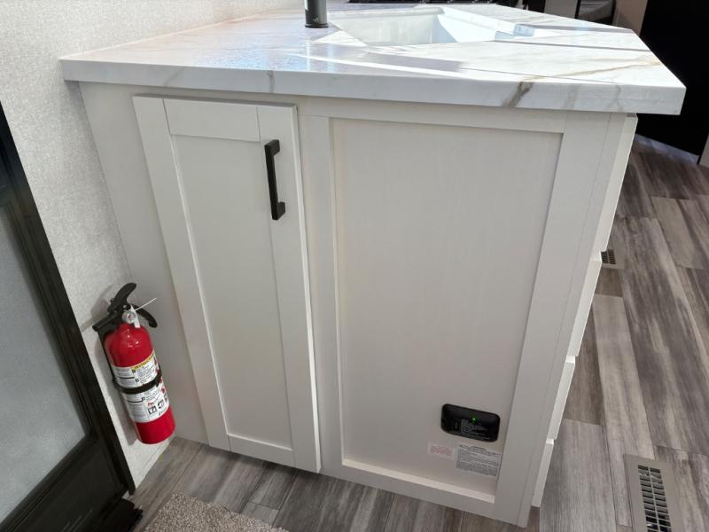 You can comfortably sleep eight people in this travel trailer thanks to the double-size bunks in back, the 60" x 80" queen bed in the front bedroom, plus the U-shaped dinette within the slide out! The chef of your crew will have a three burner cooktop and microwave oven to prepare meals, and everyone can store their favorite drinks in the 12V refrigerator inside or in the exterior refrigerator! This unit also includes ample storage space, including a large pantry and dual bedside wardrobes.