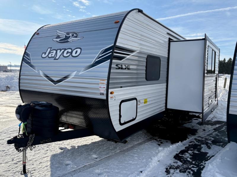The Jayco Jay Flight SLX travel trailer is quite easy to own because it is lightweight for an easier towing experience. Built on a fully integrated A-frame with galvanized-steel, impact-resistant wheel wells, the Jay Flight SLX has quality at its very foundation. That quality continues on to the electric self-adjusting brakes, easy-lube hubs, Magnum Truss roof system, and LP quick connect. Some of what the mandatory Customer Value Package includes is backup camera prep, Keyed-Alike entry and baggage doors, and an on-demand tankless water heater.