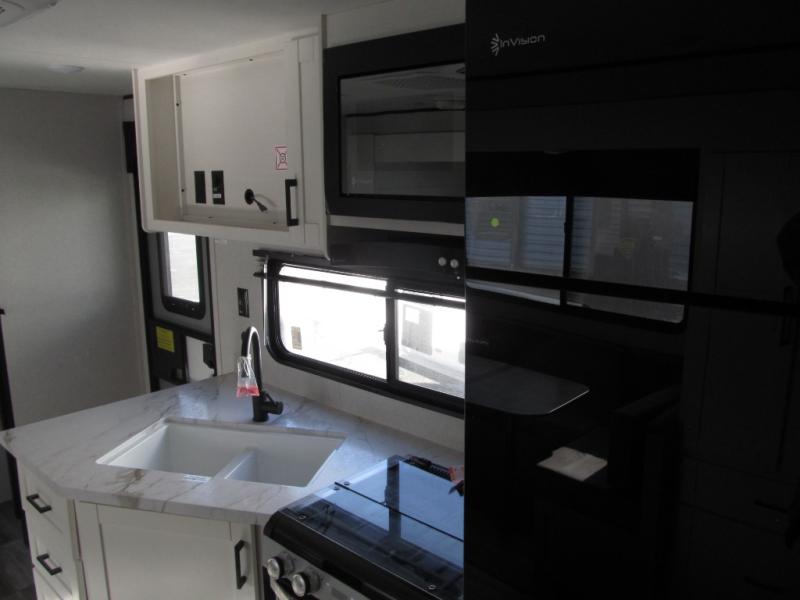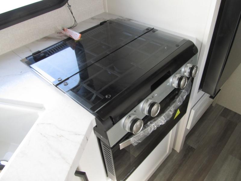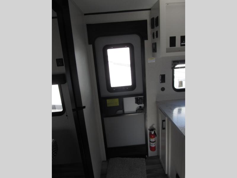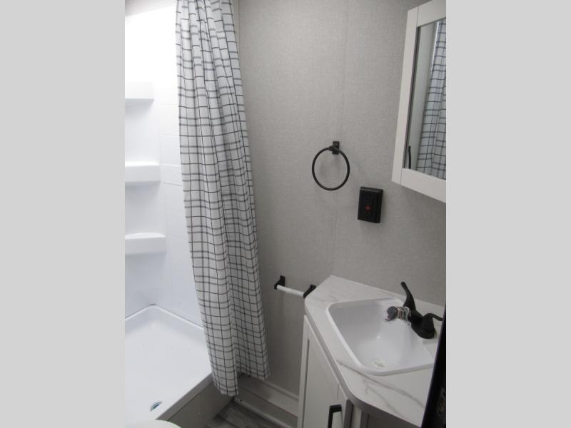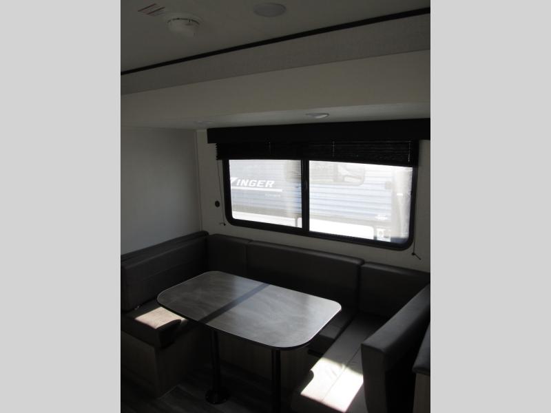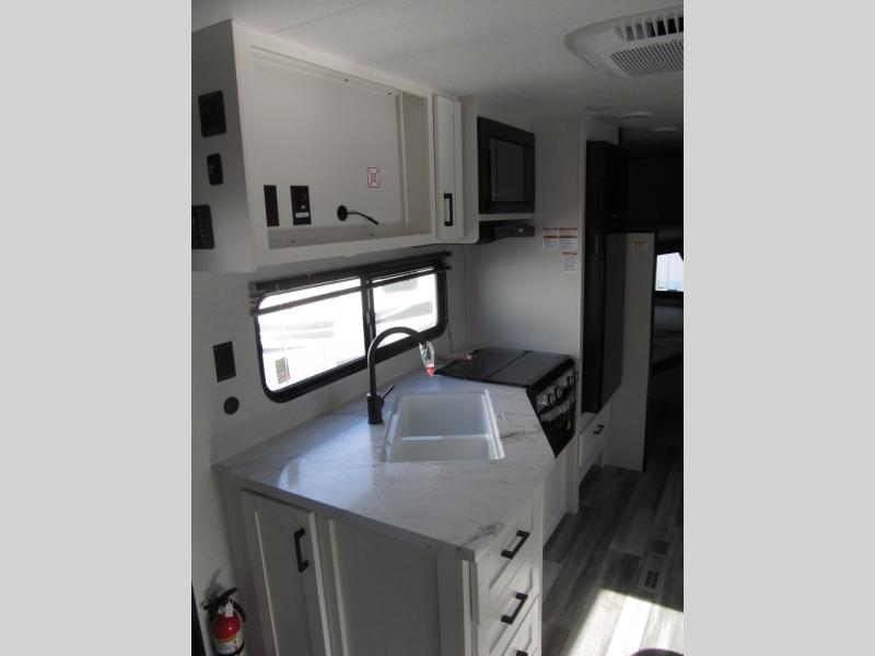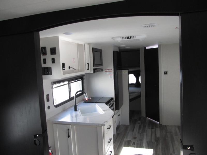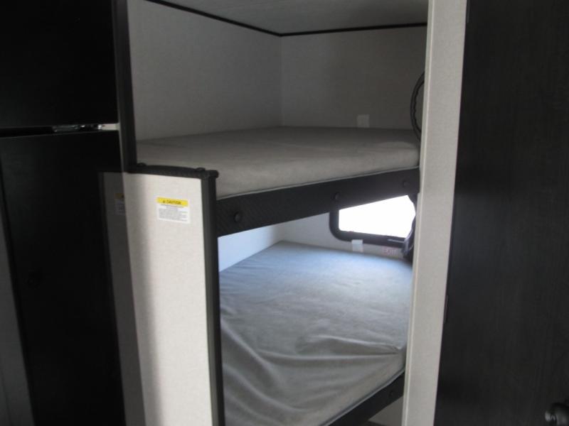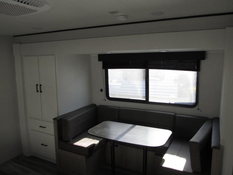 You can comfortably sleep eight people in this travel trailer thanks to the double-size bunks in back, the 60" x 80" queen bed in the front bedroom, plus the U-shaped dinette within the slide out! The chef of your crew will have a three burner cooktop and microwave oven to prepare meals, and everyone can store their favorite drinks in the 12V refrigerator inside or in the exterior refrigerator! This unit also includes ample storage space, including a large pantry and dual bedside wardrobes.