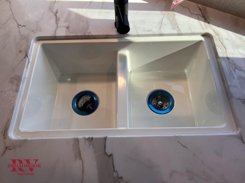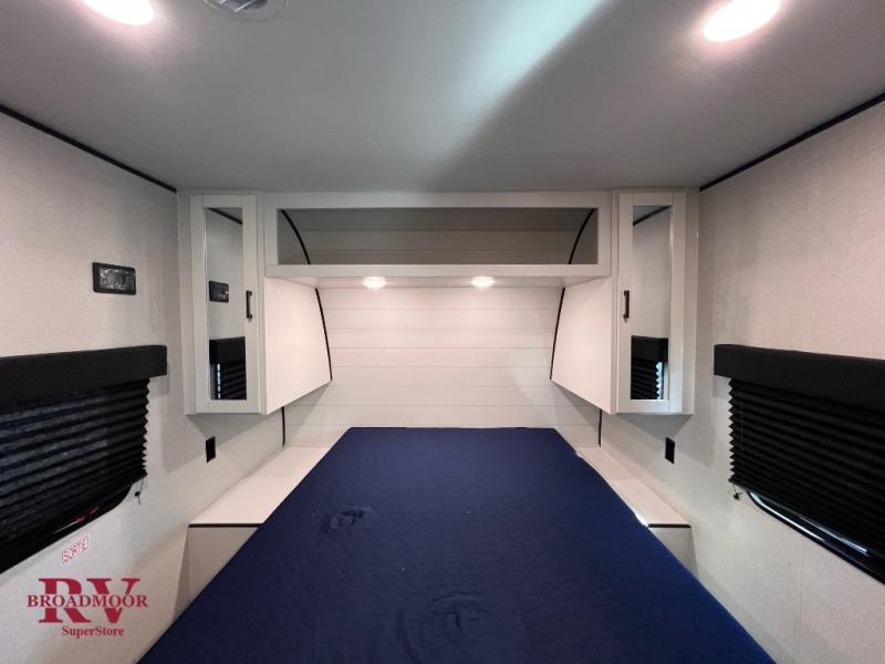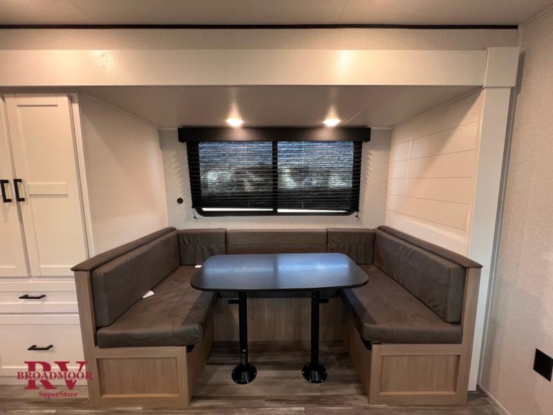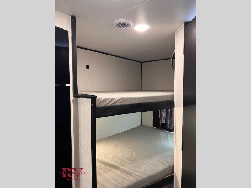 You can comfortably sleep eight people in this trailer thanks to the double-size bunks in back, the 60" x 80" queen bed in the front bedroom, plus the U-shaped dinette within the slide out! The chef of your crew will have a three burner cooktop and microwave oven to prepare meals, and everyone can store their favorite drinks in the 12V refrigerator inside or in the exterior refrigerator! This unit also includes ample storage space, including a large pantry and dual bedside wardrobes.