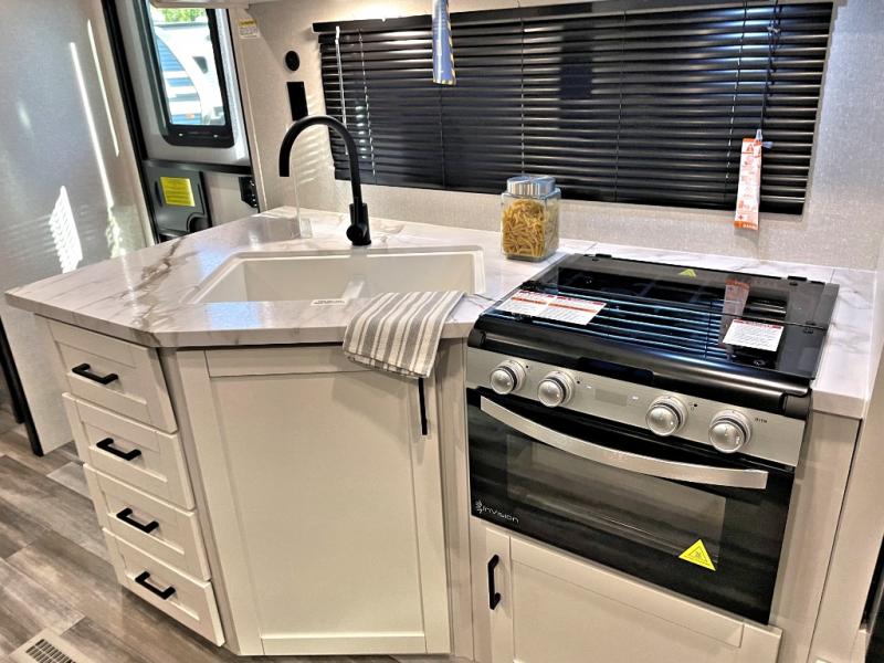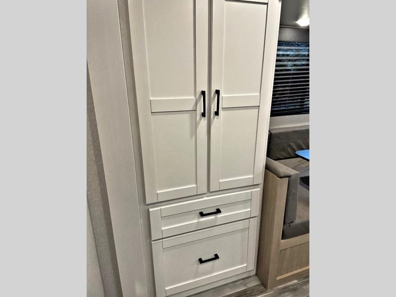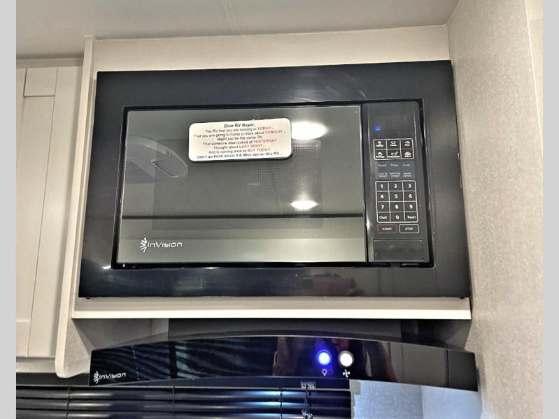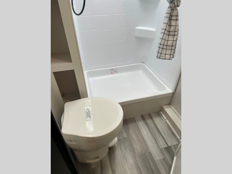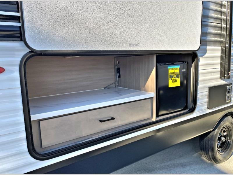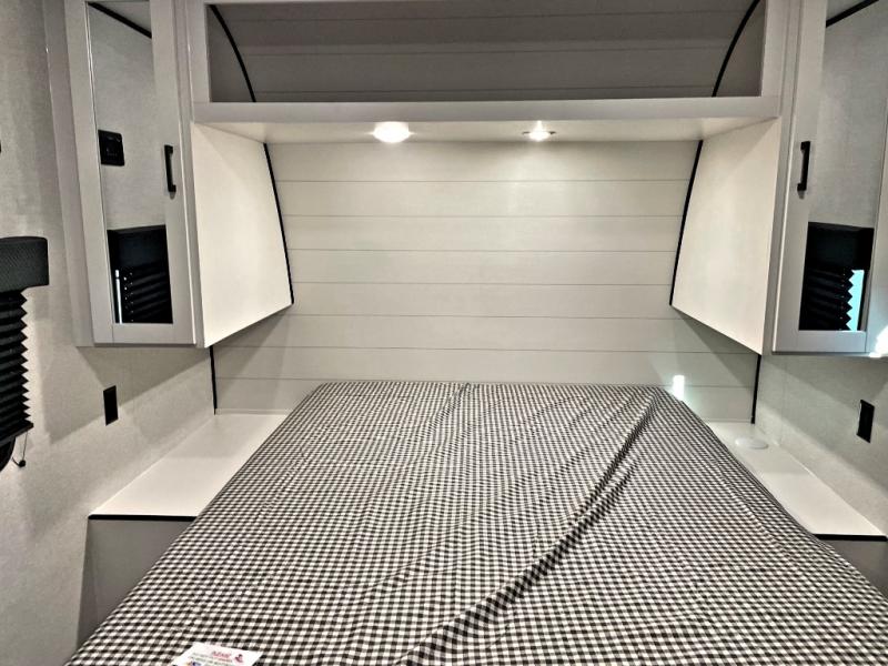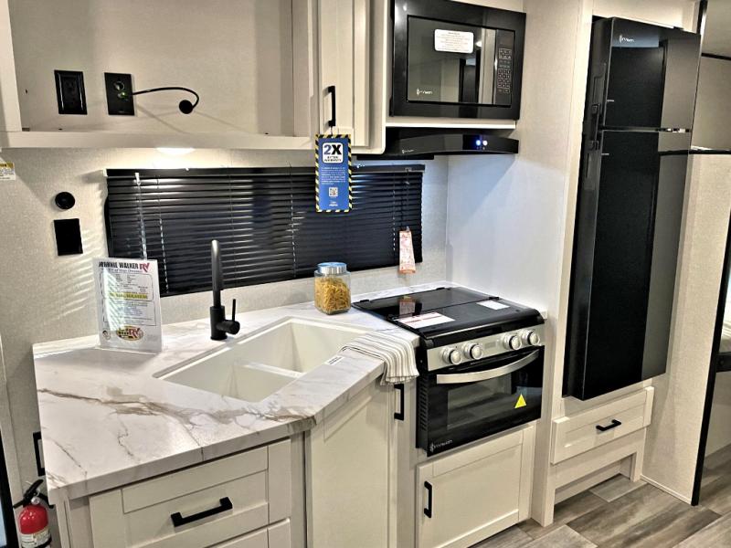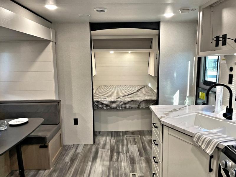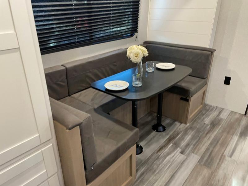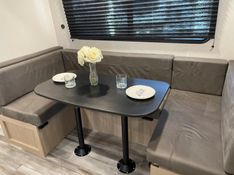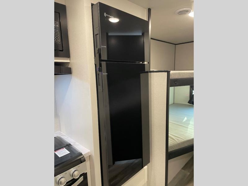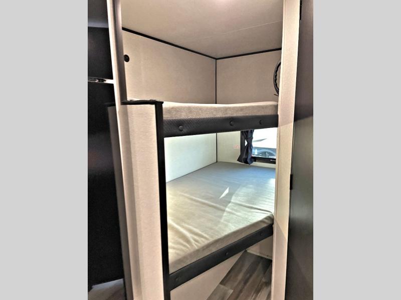 You can comfortably sleep eight people in this trailer thanks to the double-size bunks in back, the 60" x 80" queen bed in the front bedroom, plus the U-shaped dinette within the slide out! The chef of your crew will have a three burner cooktop and microwave oven to prepare meals, and everyone can store their favorite drinks in the 12V refrigerator inside or in the exterior refrigerator! This unit also includes ample storage space, including a large pantry and dual bedside wardrobes.