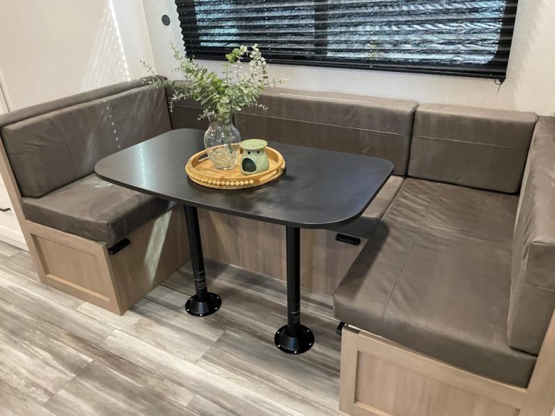You can comfortably sleep eight people in this trailer thanks to the double-size bunks in back, the 60" x 80" queen bed in the front bedroom, plus the U-shaped dinette within the slide out! The chef of your crew will have a three burner cooktop and microwave oven to prepare meals, and everyone can store their favorite drinks in the 12V refrigerator inside or in the exterior refrigerator! This unit also includes ample storage space, including a large pantry and dual bedside wardrobes.