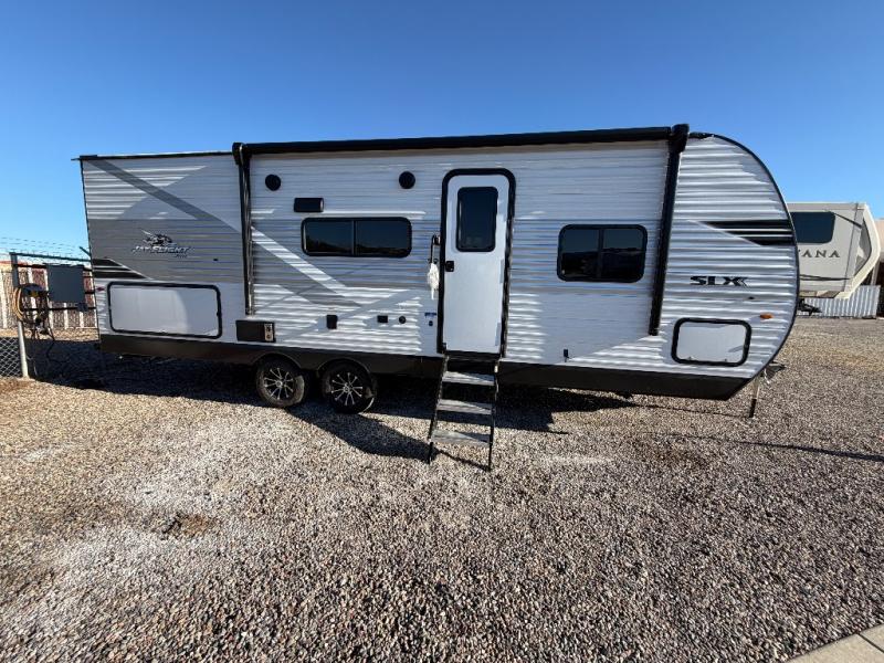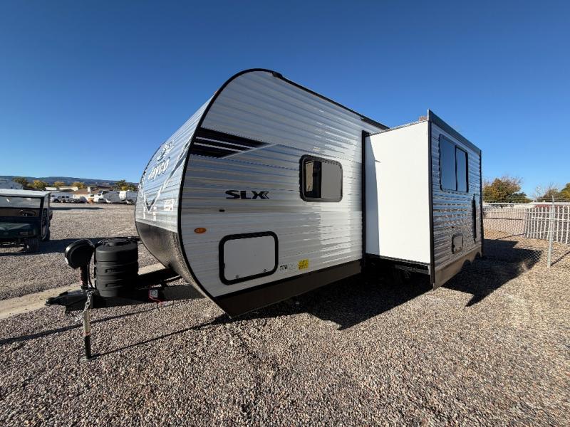 The Jayco Jay Flight SLX travel trailer is quite easy to own because it is lightweight for an easier towing experience. Built on a fully integrated A-frame with galvanized-steel, impact-resistant wheel wells, the Jay Flight SLX has quality at its very foundation. That quality continues on to the electric self-adjusting brakes, easy-lube hubs, Magnum Truss roof system, and LP quick connect. Some of what the mandatory Customer Value Package includes is backup camera prep, Keyed-Alike entry and baggage doors, and an on-demand tankless water heater.