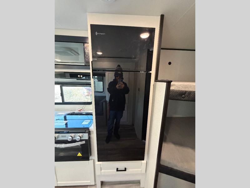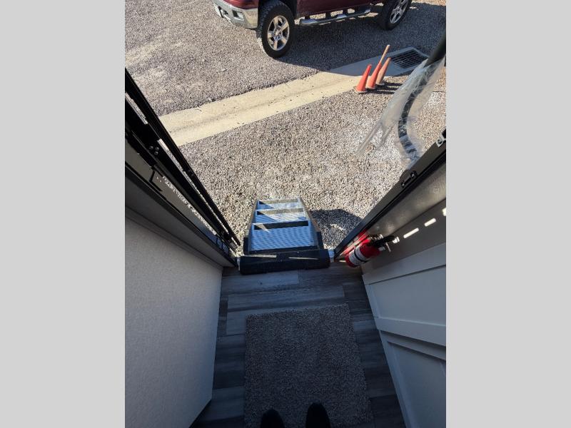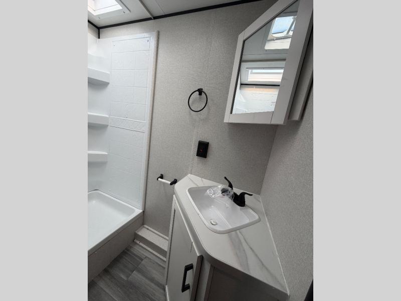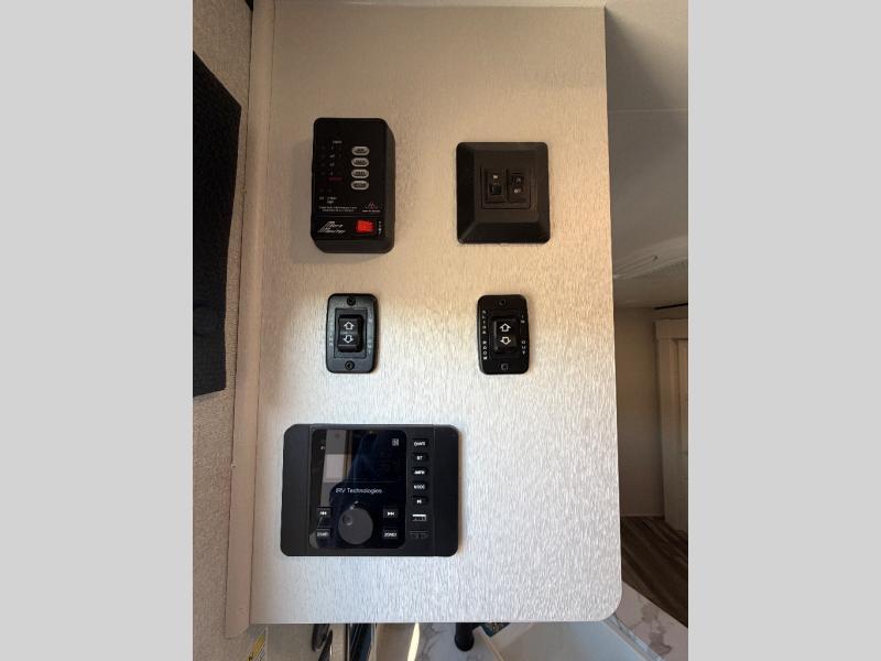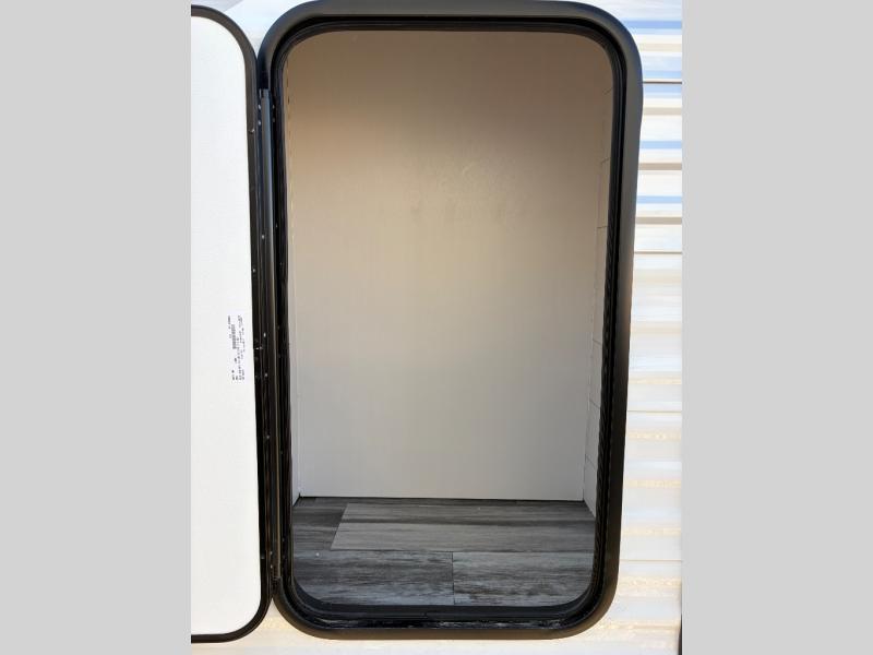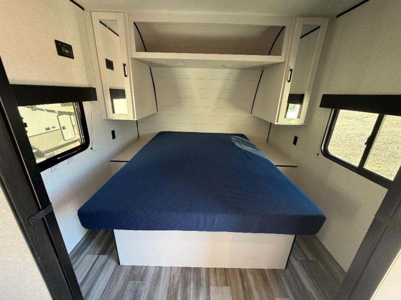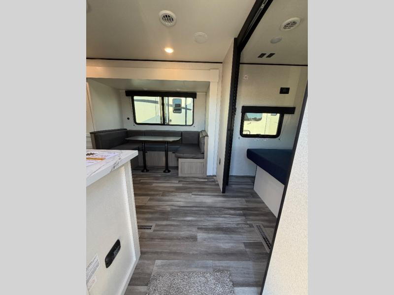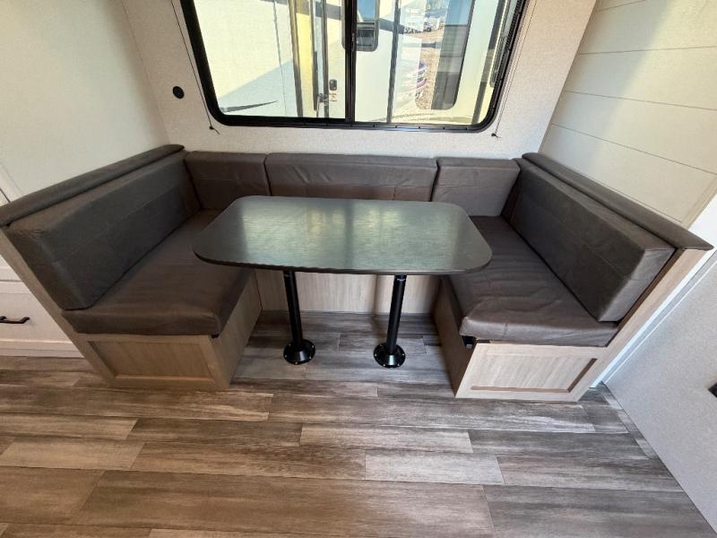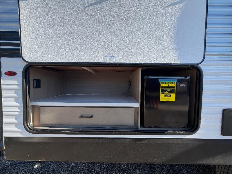 You can comfortably sleep eight people in this trailer thanks to the double-size bunks in back, the 60" x 80" queen bed in the front bedroom, plus the U-shaped dinette within the slide out! The chef of your crew will have a three burner cooktop and microwave oven to prepare meals, and everyone can store their favorite drinks in the 12V refrigerator inside or in the exterior refrigerator! This unit also includes ample storage space, including a large pantry and dual bedside wardrobes.