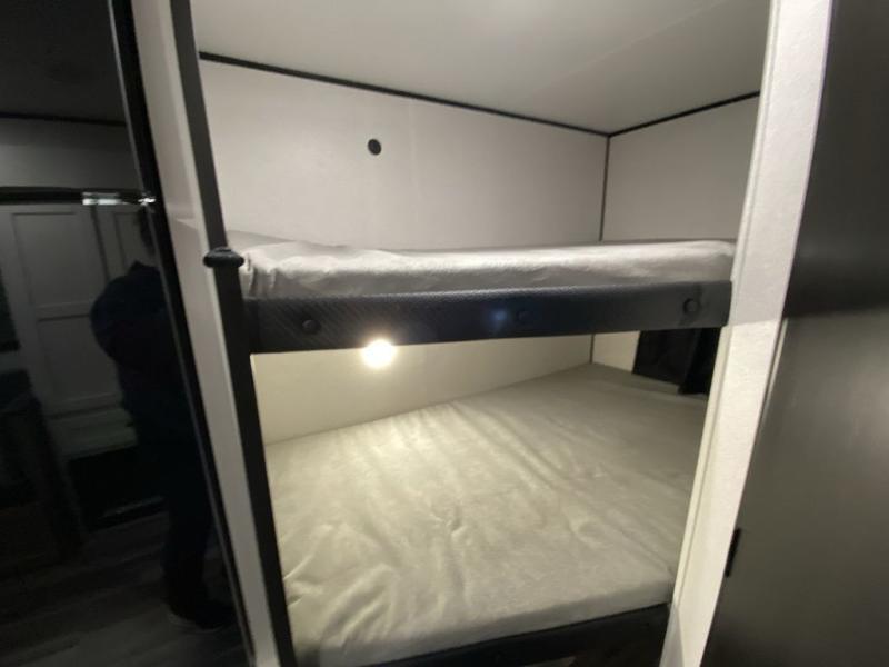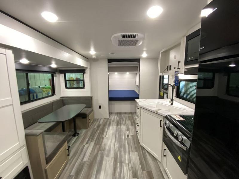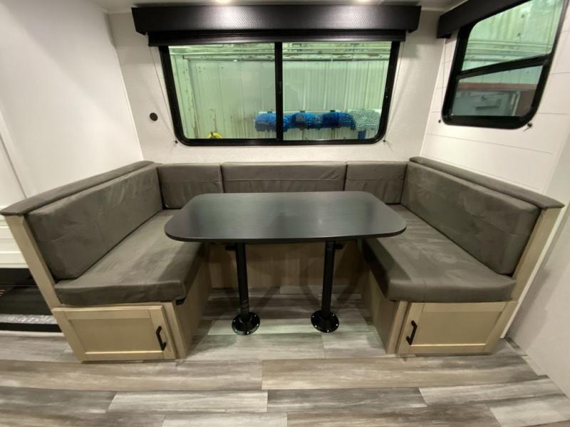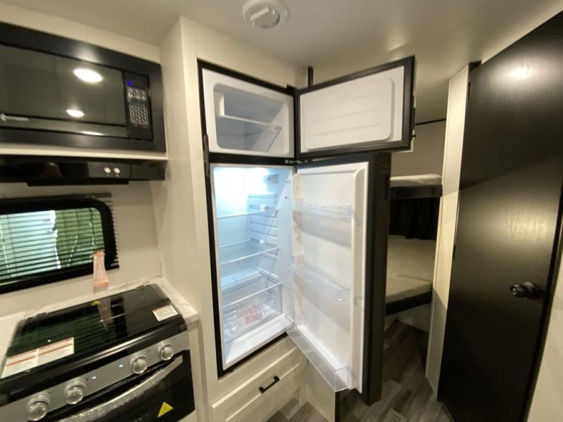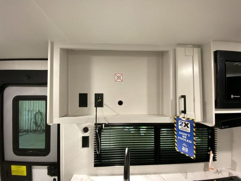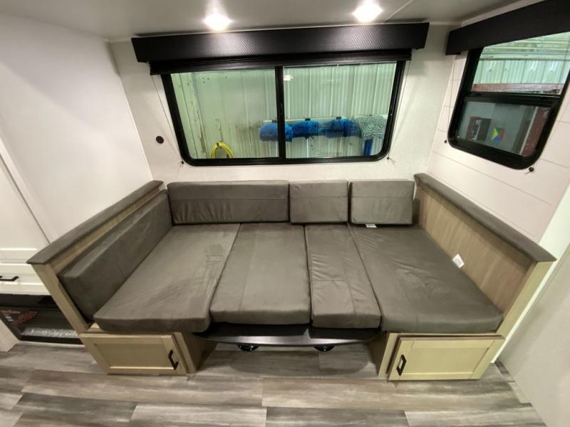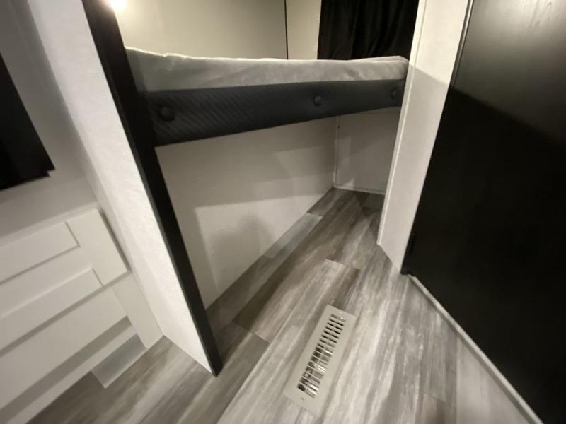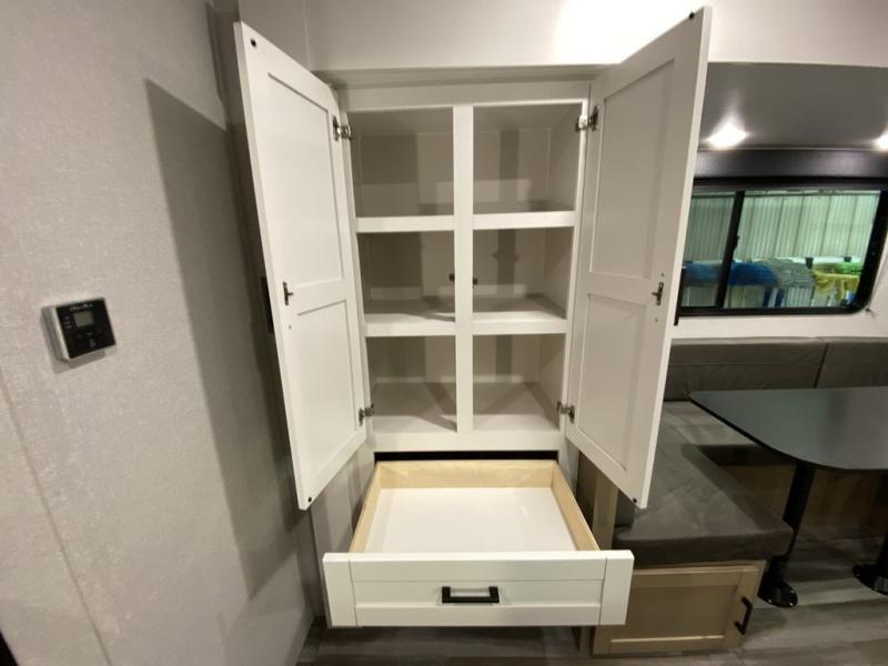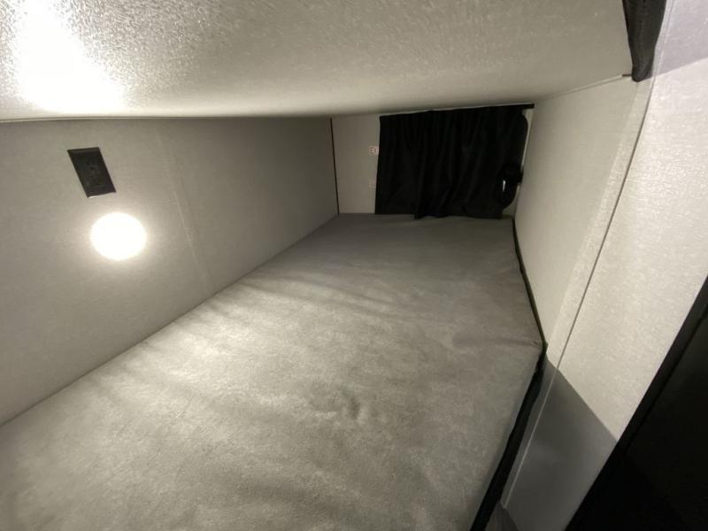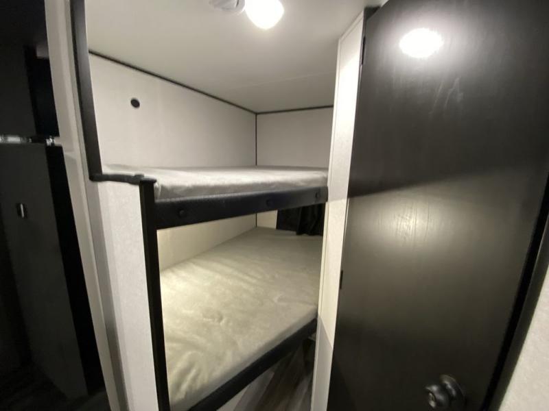 You can comfortably sleep eight people in this trailer thanks to the double-size bunks in back, the 60" x 80" queen bed in the front bedroom, plus the U-shaped dinette within the slide out! The chef of your crew will have a three burner cooktop and microwave oven to prepare meals, and everyone can store their favorite drinks in the 12V refrigerator inside or in the exterior refrigerator! This unit also includes ample storage space, including a large pantry and dual bedside wardrobes.