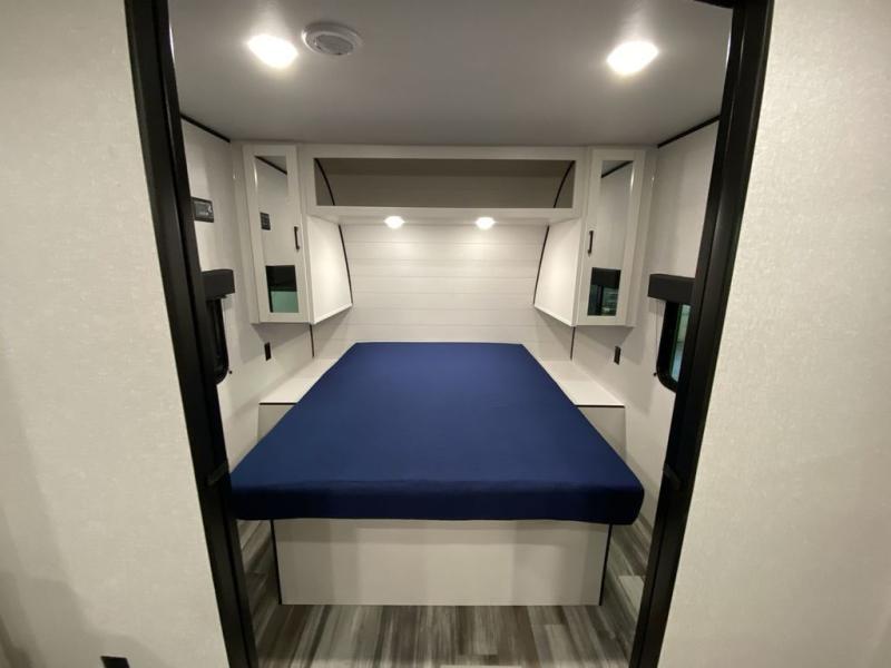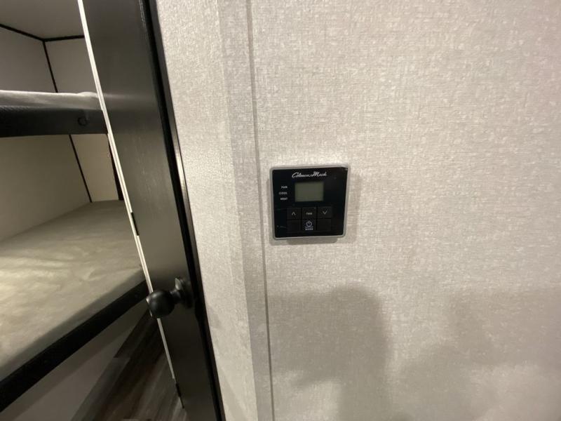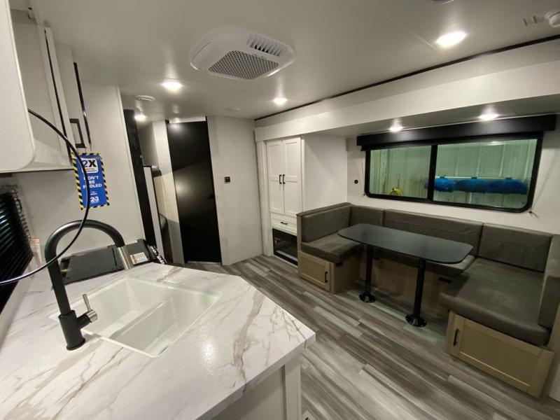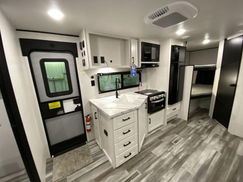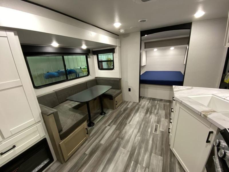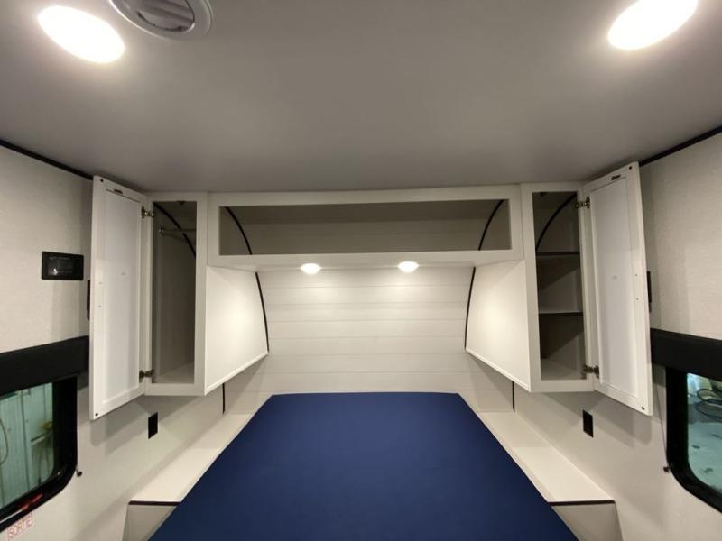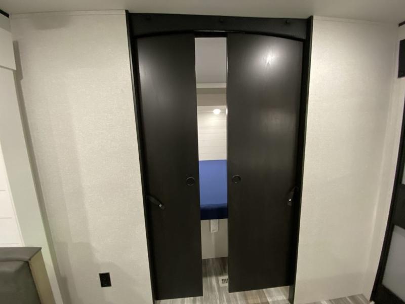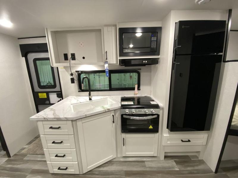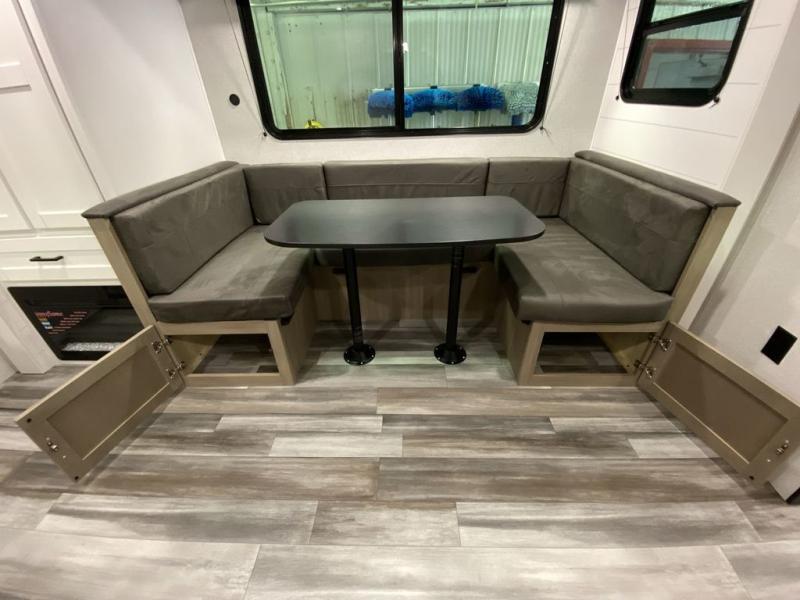 You can comfortably sleep eight people in this trailer thanks to the double-size bunks in back, the 60" x 80" queen bed in the front bedroom, plus the U-shaped dinette within the slide out! The chef of your crew will have a three burner cooktop and microwave oven to prepare meals, and everyone can store their favorite drinks in the 12V refrigerator inside or in the exterior refrigerator! This unit also includes ample storage space, including a large pantry and dual bedside wardrobes.