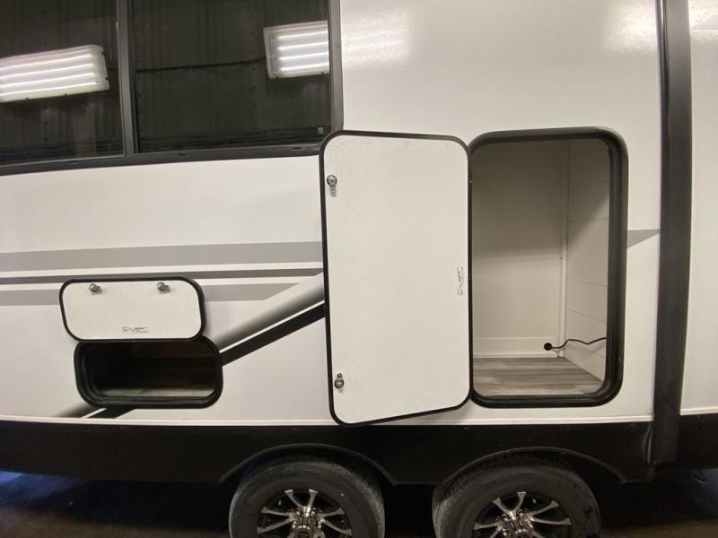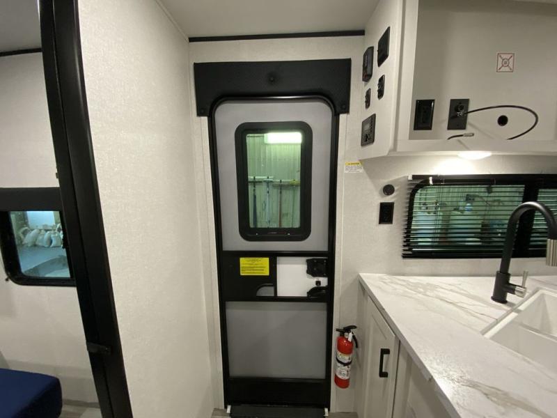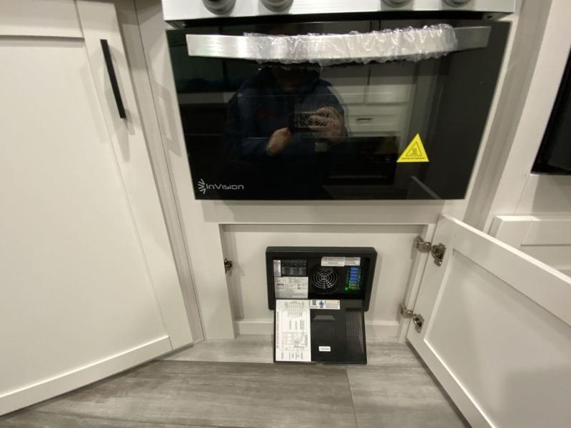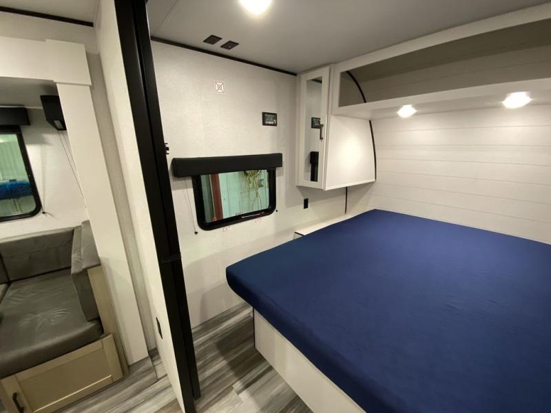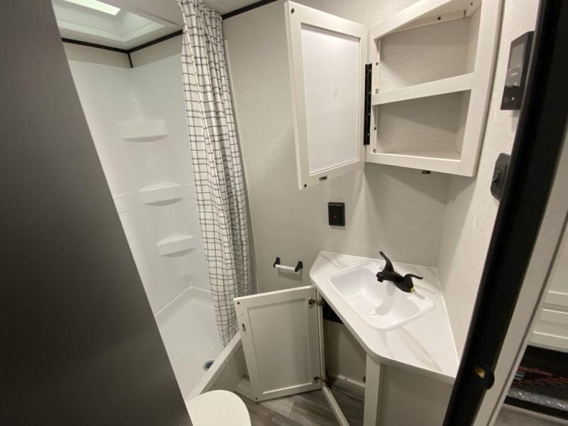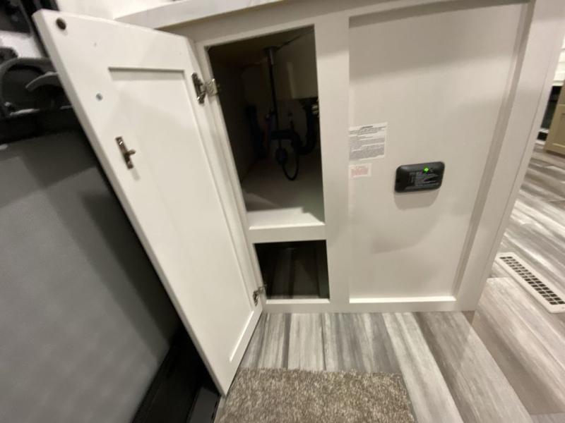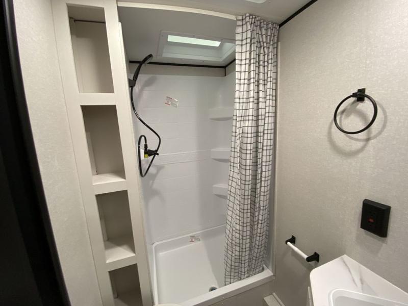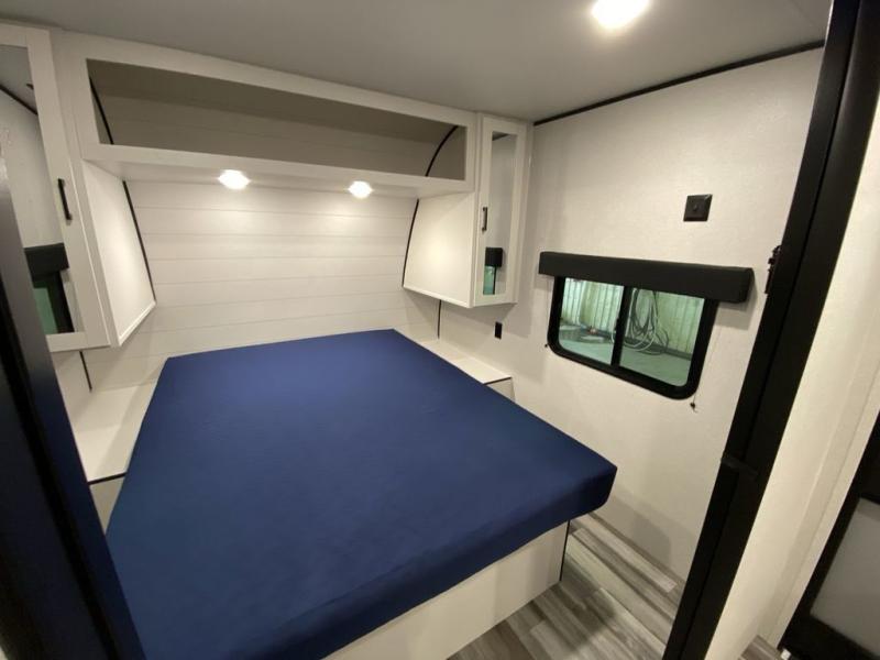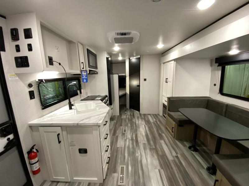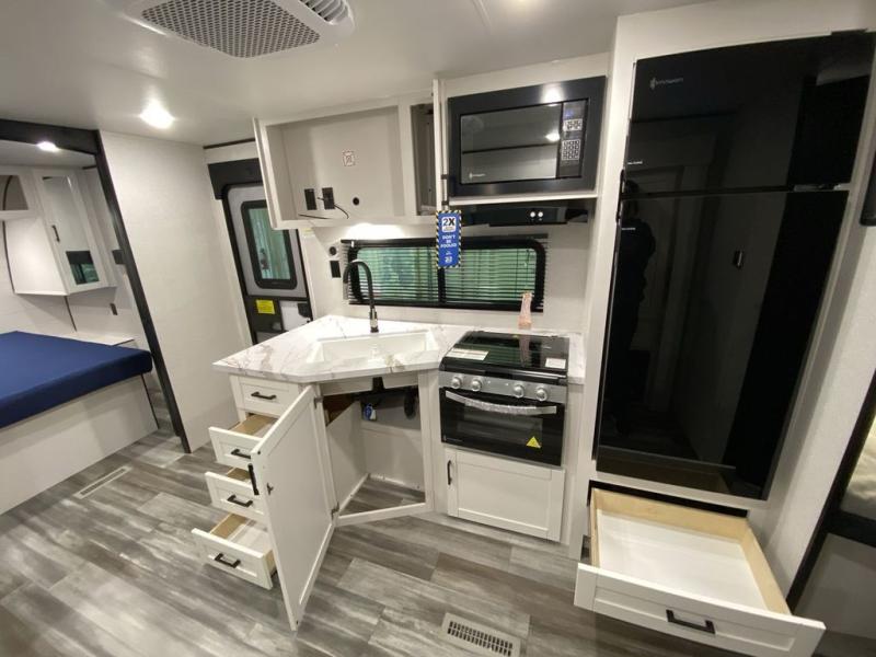 You can comfortably sleep eight people in this trailer thanks to the double-size bunks in back, the 60" x 80" queen bed in the front bedroom, plus the U-shaped dinette within the slide out! The chef of your crew will have a three burner cooktop and microwave oven to prepare meals, and everyone can store their favorite drinks in the 12V refrigerator inside or in the exterior refrigerator! This unit also includes ample storage space, including a large pantry and dual bedside wardrobes.