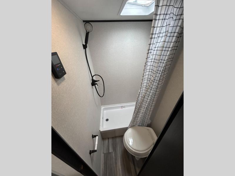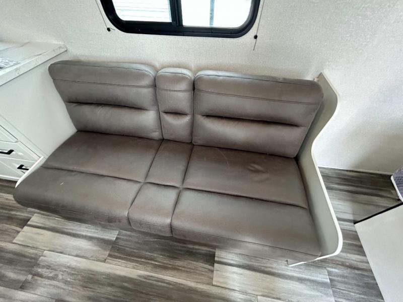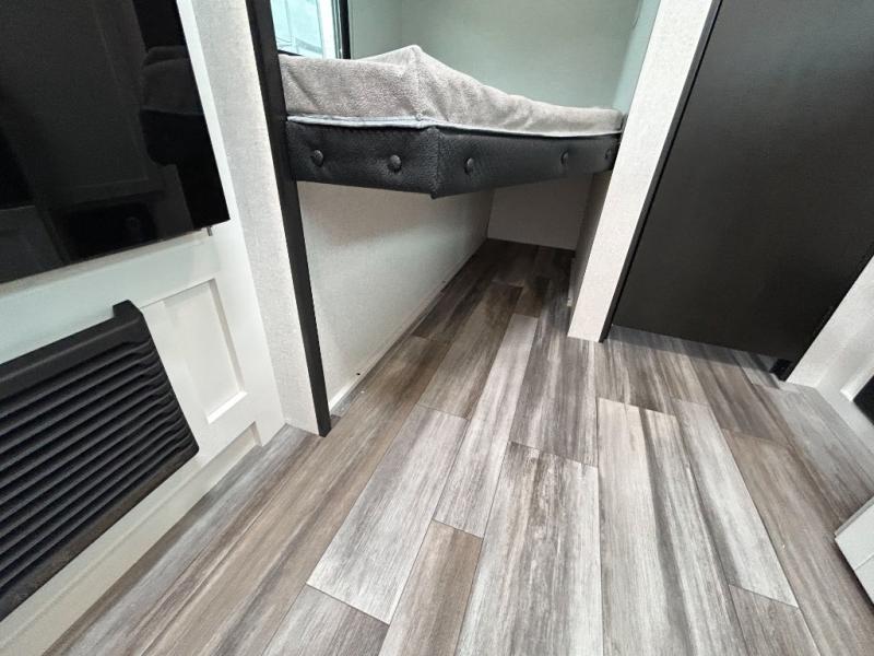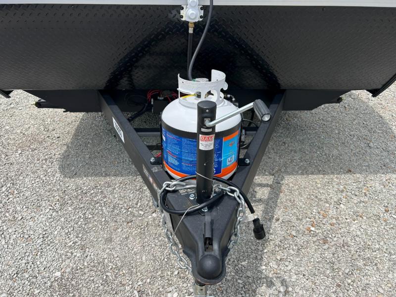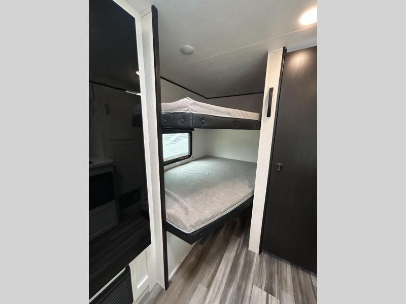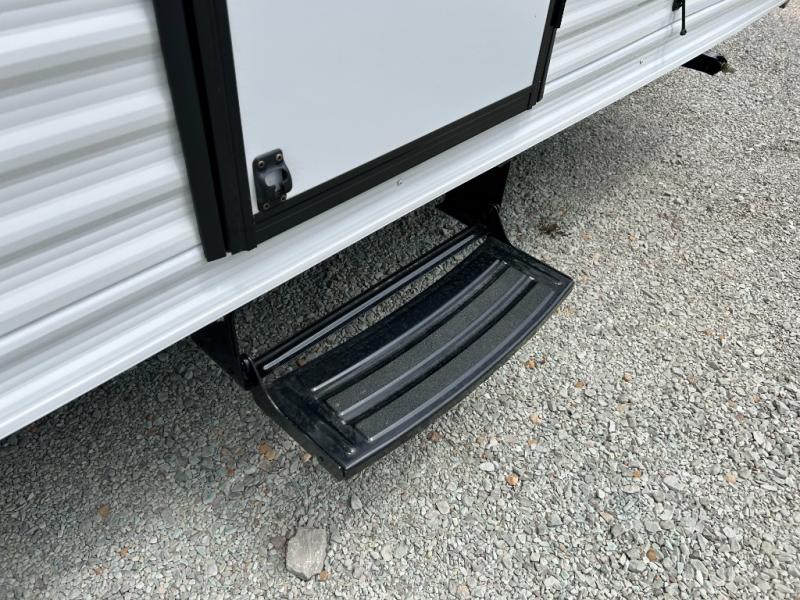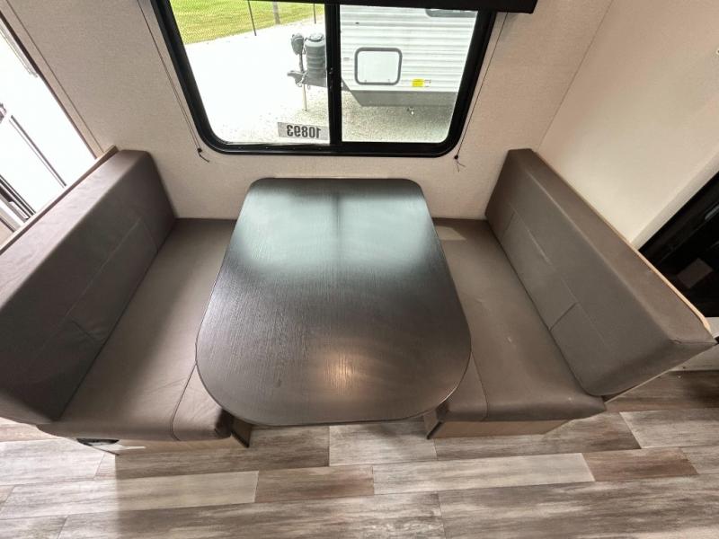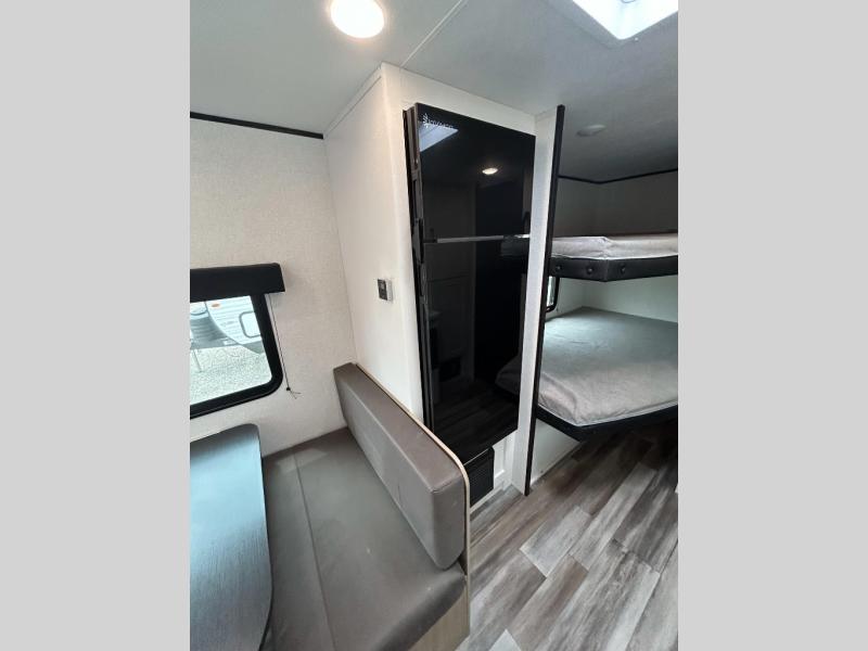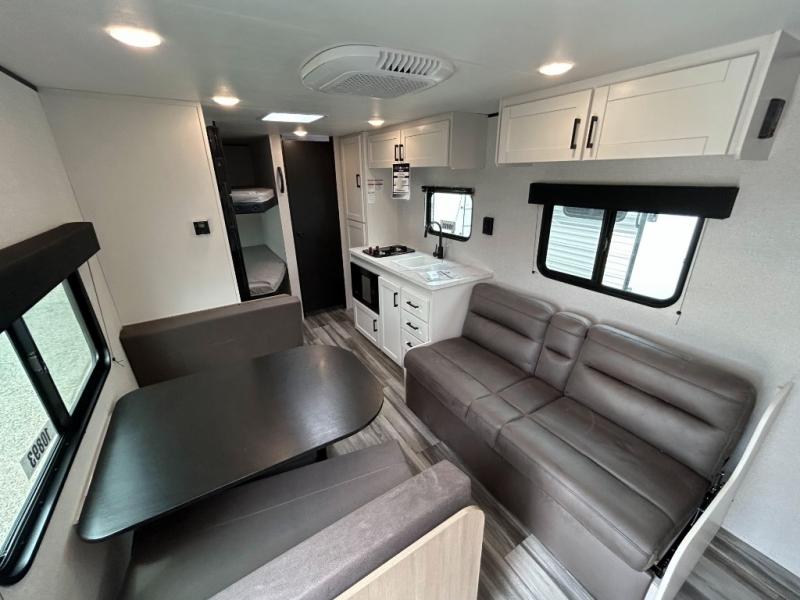 You can comfortably sleep eight to ten people in this trailer thanks to the double-size bunks, the 60" x 80" queen bed in the front bedroom, plus the booth dinette and jack-knife sofa in the main living area! The chef of your crew will have a two burner cooktop and microwave oven to prepare meals, and everyone can store their favorite drinks in the 12V refrigerator. The bathroom includes a 40" shower and a toilet, with the sink just outside of this room so others can brush their teeth if one is taking a shower before bed. The outside storage will let you bring along fishing poles and the 12' power awning will create a nice place to gather in the evenings!