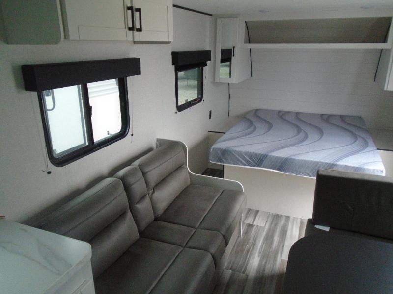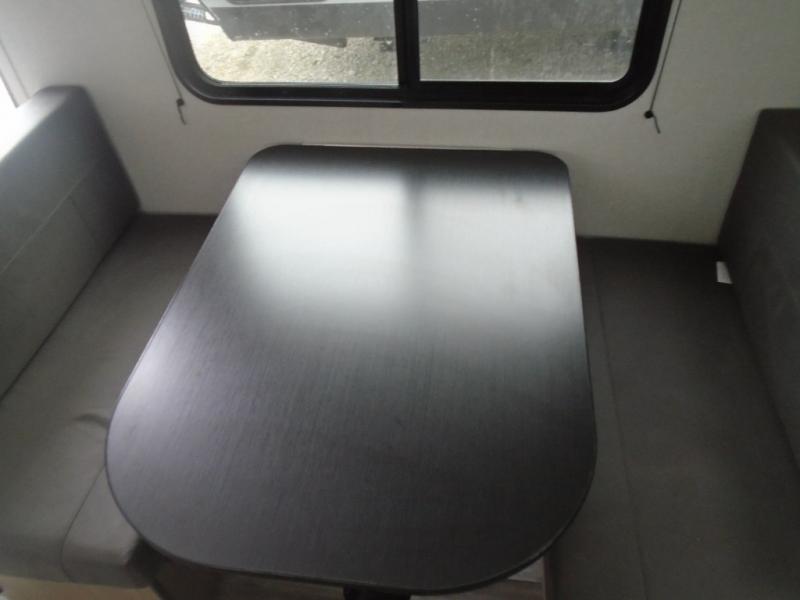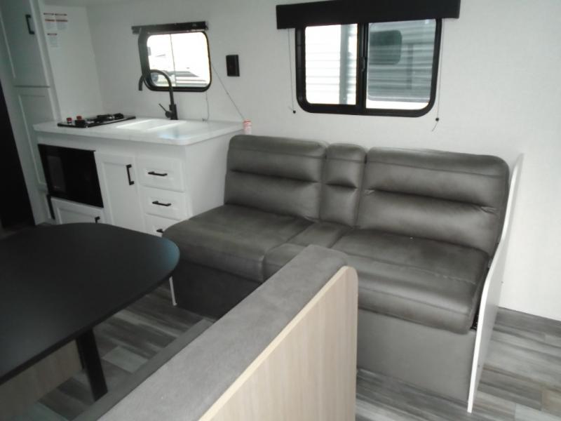 You can comfortably sleep eight to ten people in this trailer thanks to the double-size bunks, the 60" x 80" queen bed in the front bedroom, plus the booth dinette and jack-knife sofa in the main living area! The chef of your crew will have a two burner cooktop and microwave oven to prepare meals, and everyone can store their favorite drinks in the 12V refrigerator. The bathroom includes a 40" shower and a toilet, with the sink just outside of this room so others can brush their teeth if one is taking a shower before bed. The outside storage will let you bring along fishing poles and the 12' power awning will create a nice place to gather in the evenings!