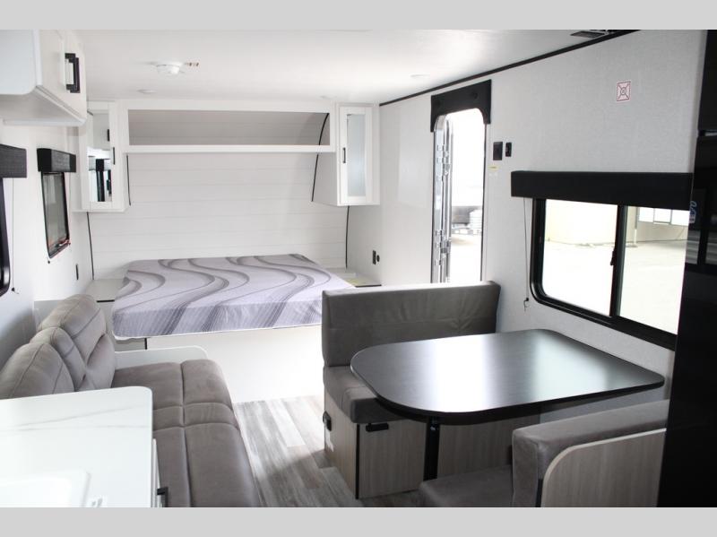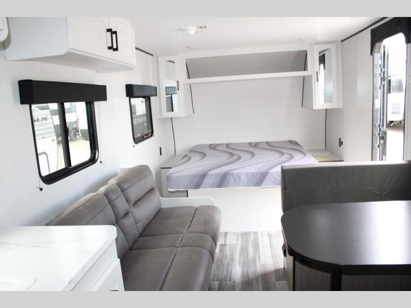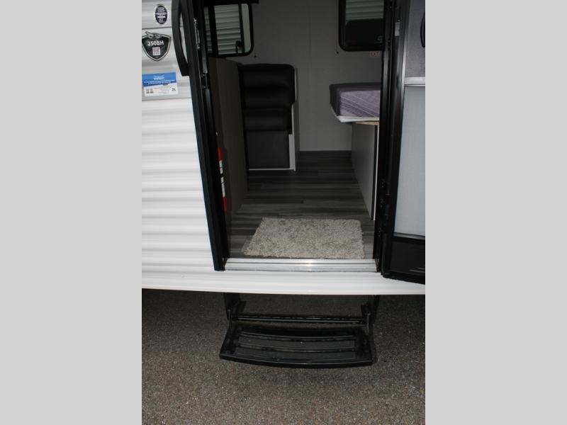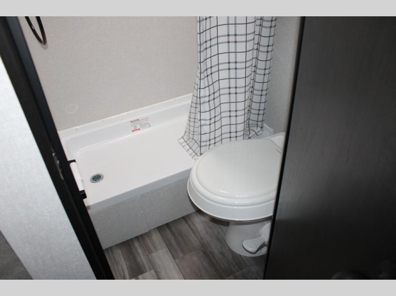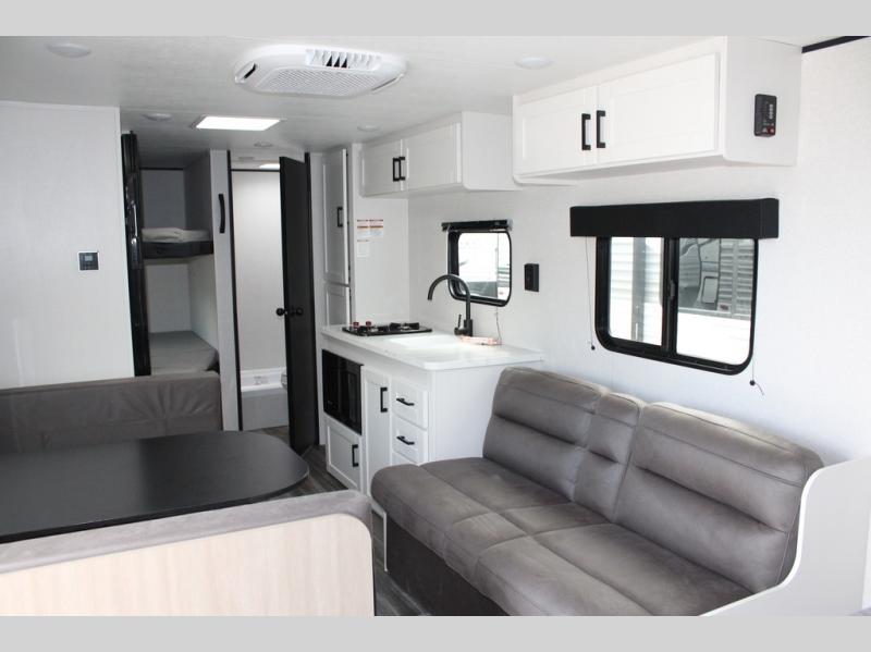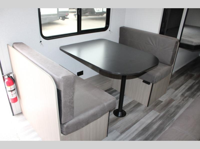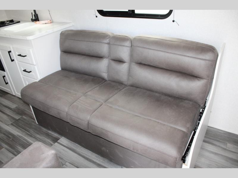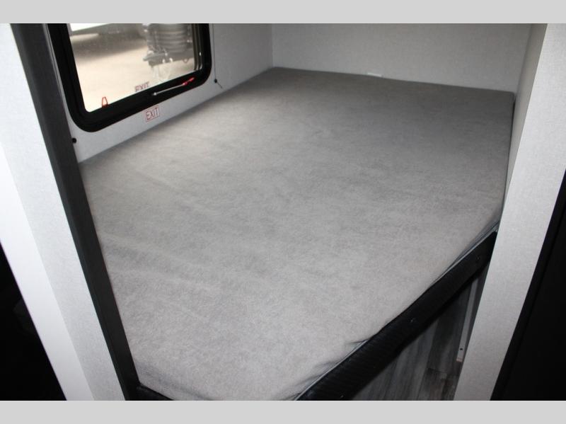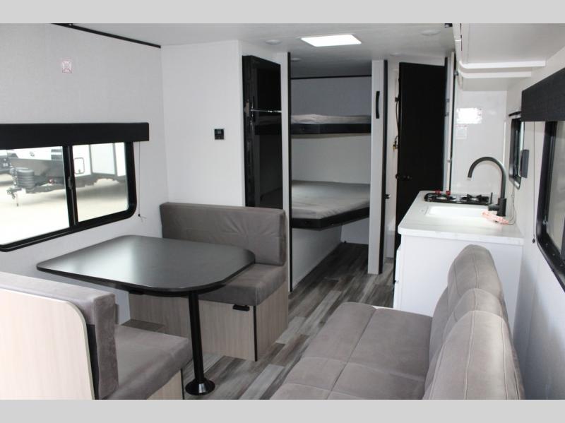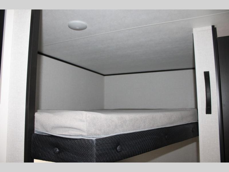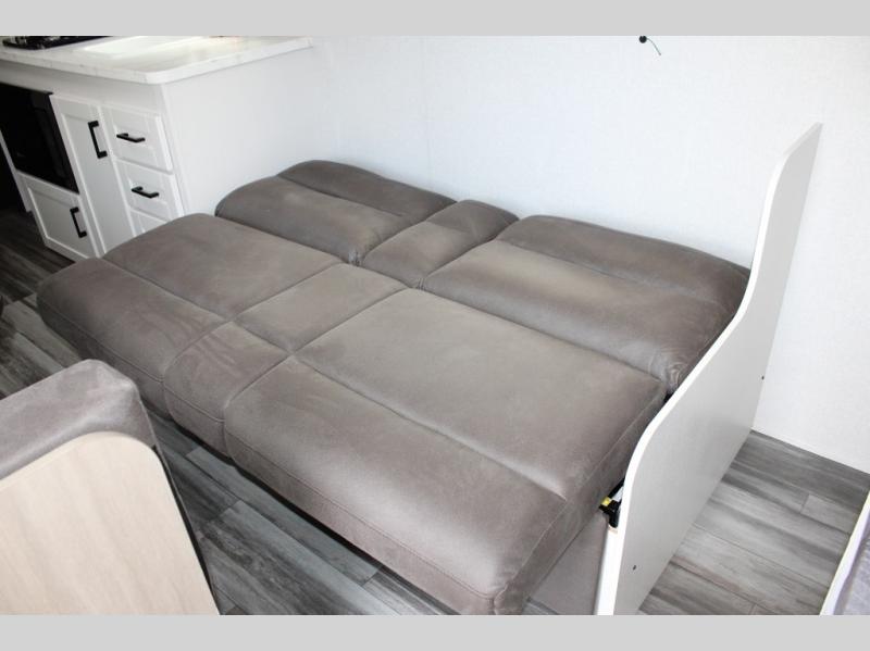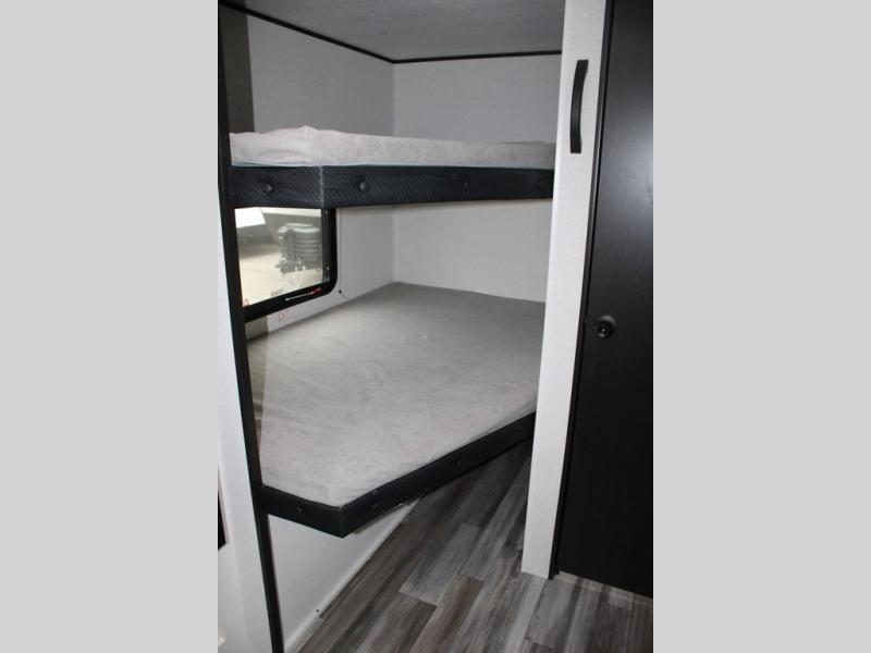 You can comfortably sleep eight to ten people in this trailer thanks to the double-size bunks, the 60" x 80" queen bed in the front bedroom, plus the booth dinette and jack-knife sofa in the main living area! The chef of your crew will have a two burner cooktop and microwave oven to prepare meals, and everyone can store their favorite drinks in the 12V refrigerator. The bathroom includes a 40" shower and a toilet, with the sink just outside of this room so others can brush their teeth if one is taking a shower before bed. The outside storage will let you bring along fishing poles and the 12' power awning will create a nice place to gather in the evenings!