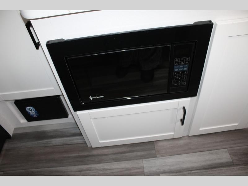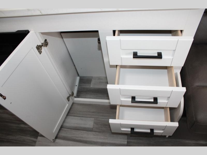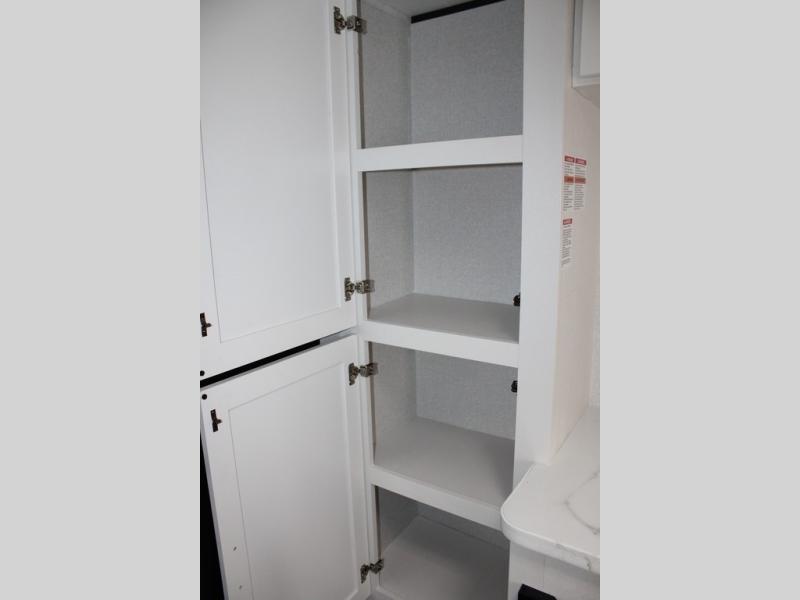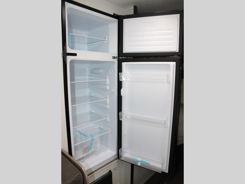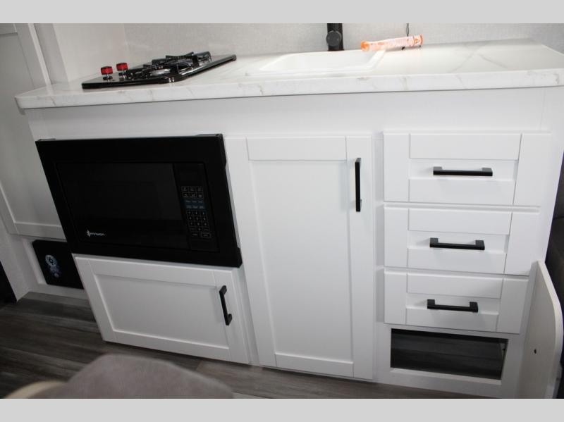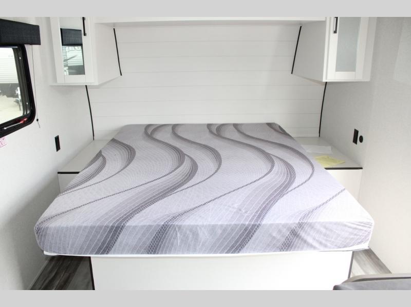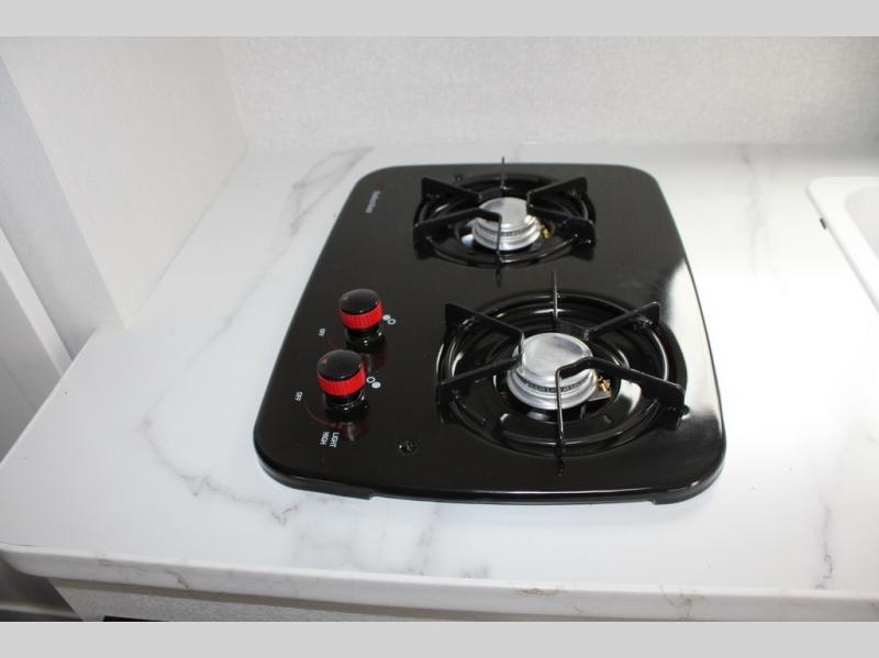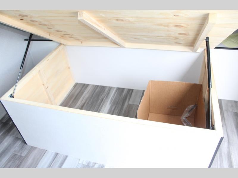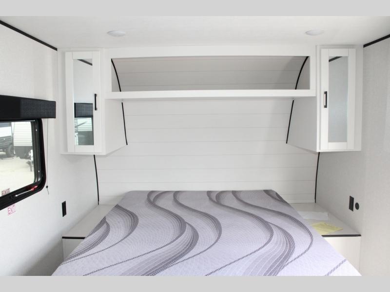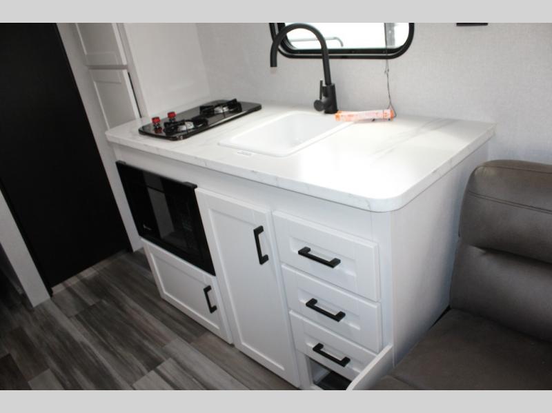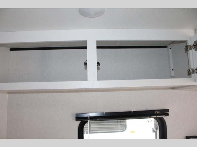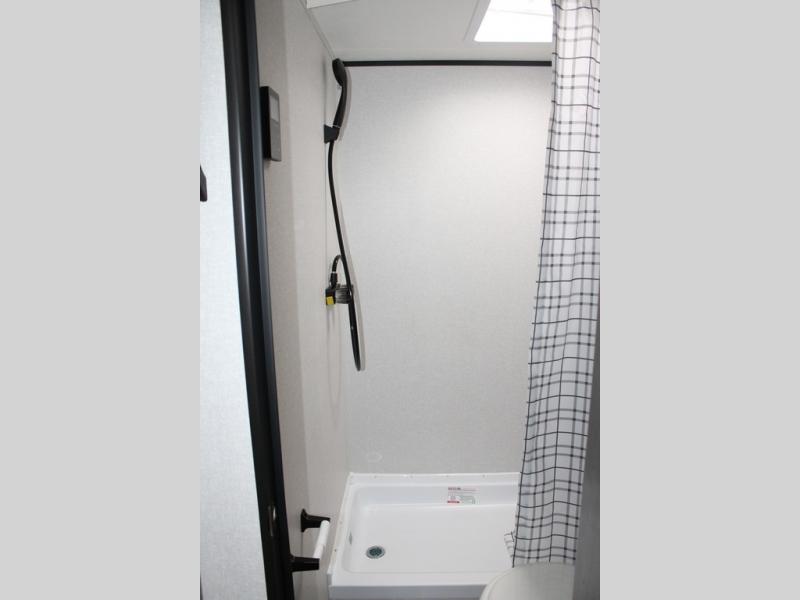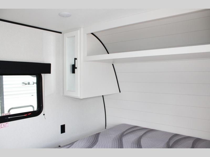 You can comfortably sleep eight to ten people in this trailer thanks to the double-size bunks, the 60" x 80" queen bed in the front bedroom, plus the booth dinette and jack-knife sofa in the main living area! The chef of your crew will have a two burner cooktop and microwave oven to prepare meals, and everyone can store their favorite drinks in the 12V refrigerator. The bathroom includes a 40" shower and a toilet, with the sink just outside of this room so others can brush their teeth if one is taking a shower before bed. The outside storage will let you bring along fishing poles and the 12' power awning will create a nice place to gather in the evenings!