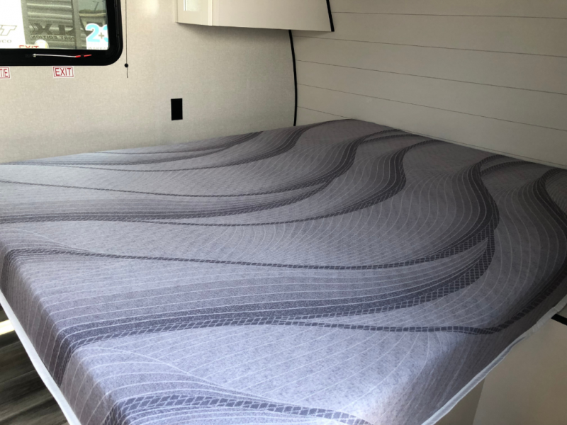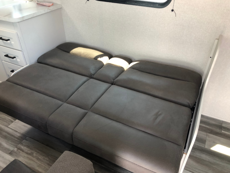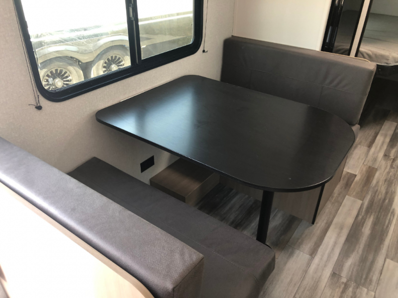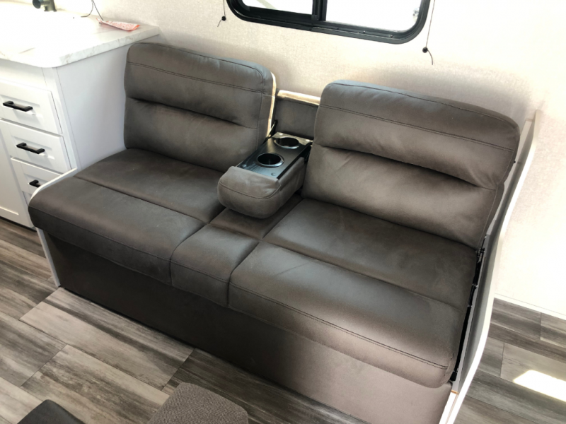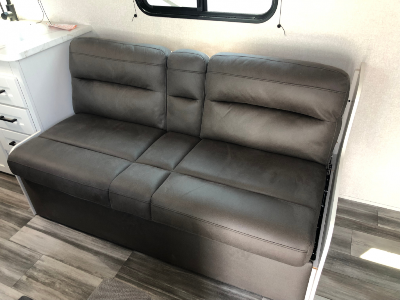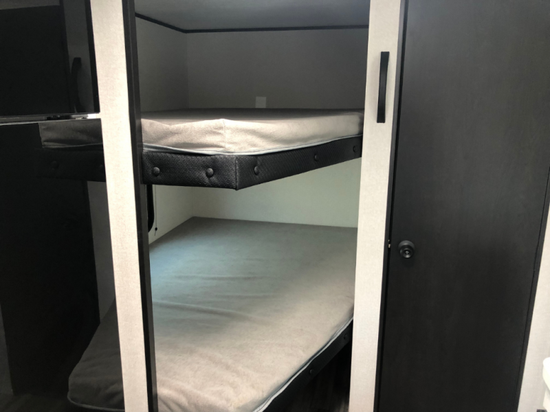 You can comfortably sleep eight to ten people in this trailer thanks to the double-size bunks, the 60" x 80" queen bed in the front bedroom, plus the booth dinette and jack-knife sofa in the main living area! The chef of your crew will have a two burner cooktop and microwave oven to prepare meals, and everyone can store their favorite drinks in the 12V refrigerator. The bathroom includes a 40" shower and a toilet, with the sink just outside of this room so others can brush their teeth if one is taking a shower before bed. The outside storage will let you bring along fishing poles and the 12' power awning will create a nice place to gather in the evenings!