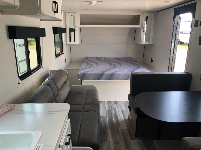 The Jayco Jay Flight SLX travel trailer is quite easy to own because it is lightweight for an easier towing experience. Built on a fully integrated A-frame with galvanized-steel, impact-resistant wheel wells, the Jay Flight SLX has quality at its very foundation. That quality continues on to the electric self-adjusting brakes, easy-lube hubs, Magnum Truss roof system, and LP quick connect. Some of what the mandatory Customer Value Package includes is backup camera prep, Keyed-Alike entry and baggage doors, and an on-demand tankless water heater.