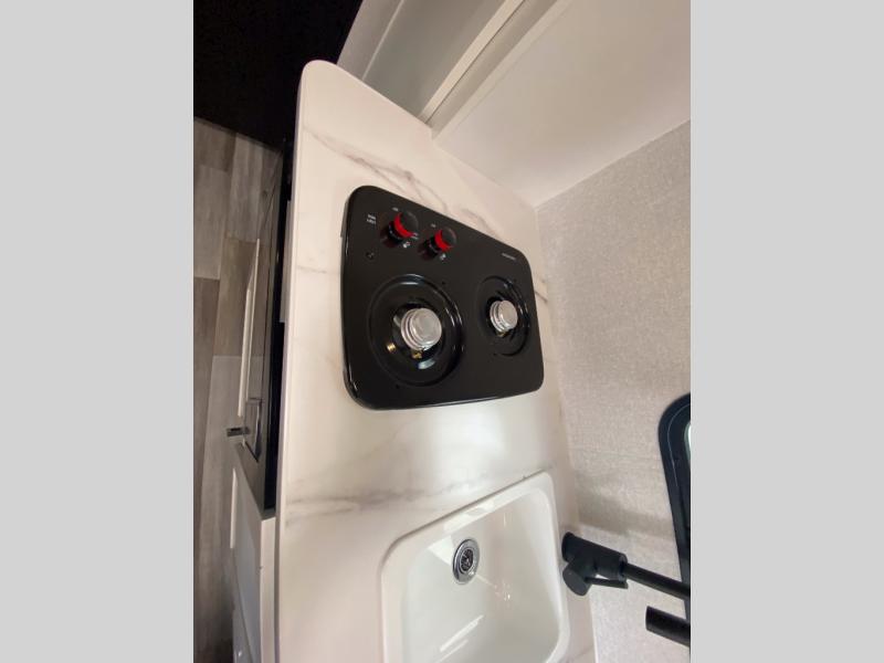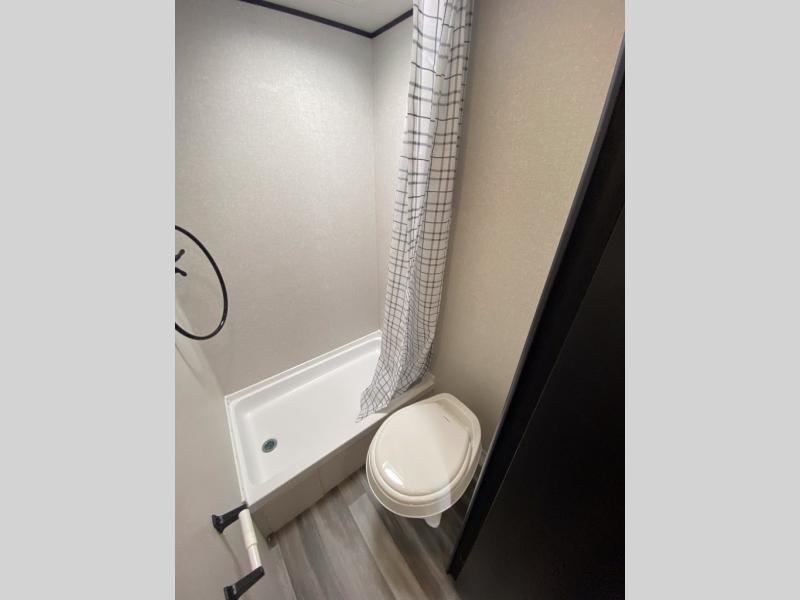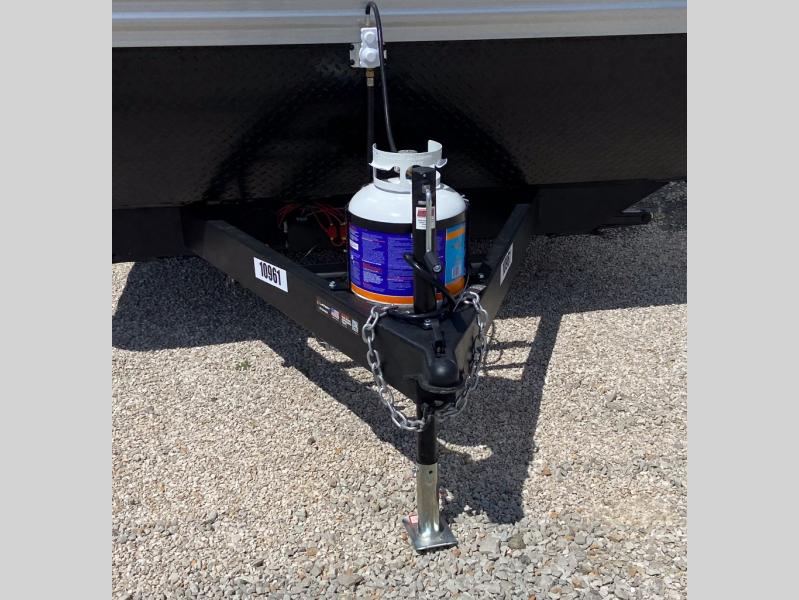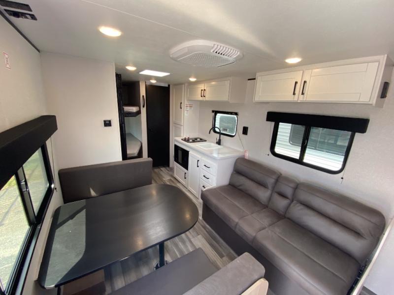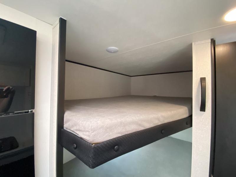 You can comfortably sleep eight to ten people in this trailer thanks to the double-size bunks, the 60" x 80" queen bed in the front bedroom, plus the booth dinette and jack-knife sofa in the main living area! The chef of your crew will have a two burner cooktop and microwave oven to prepare meals, and everyone can store their favorite drinks in the 12V refrigerator. The bathroom includes a 40" shower and a toilet, with the sink just outside of this room so others can brush their teeth if one is taking a shower before bed. The outside storage will let you bring along fishing poles and the 12' power awning will create a nice place to gather in the evenings!