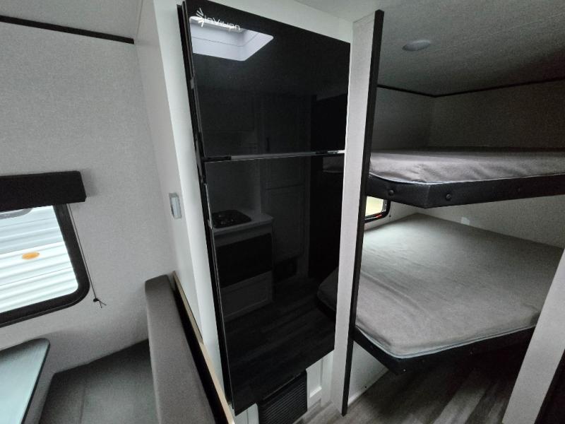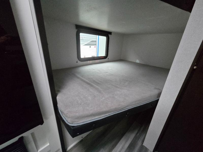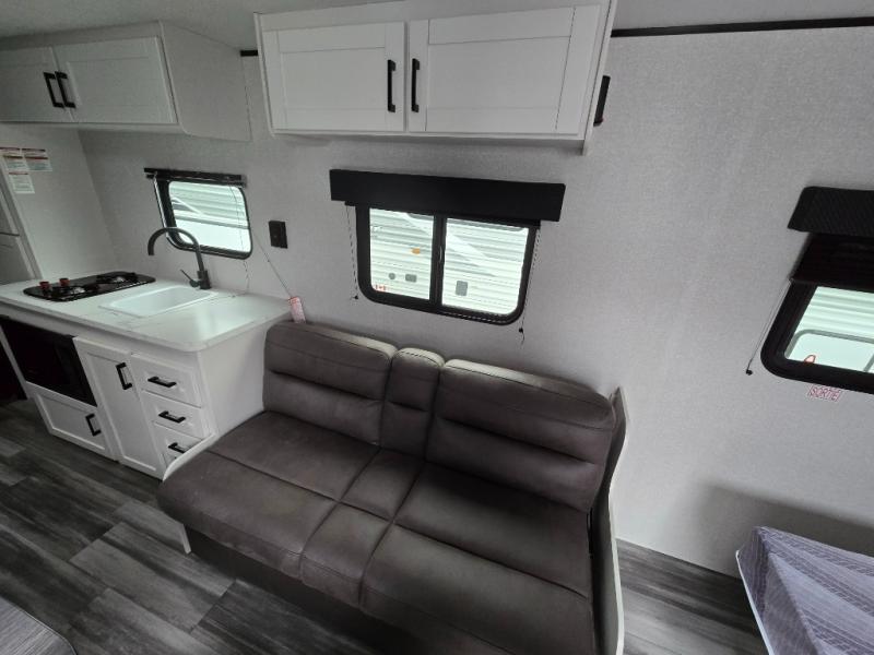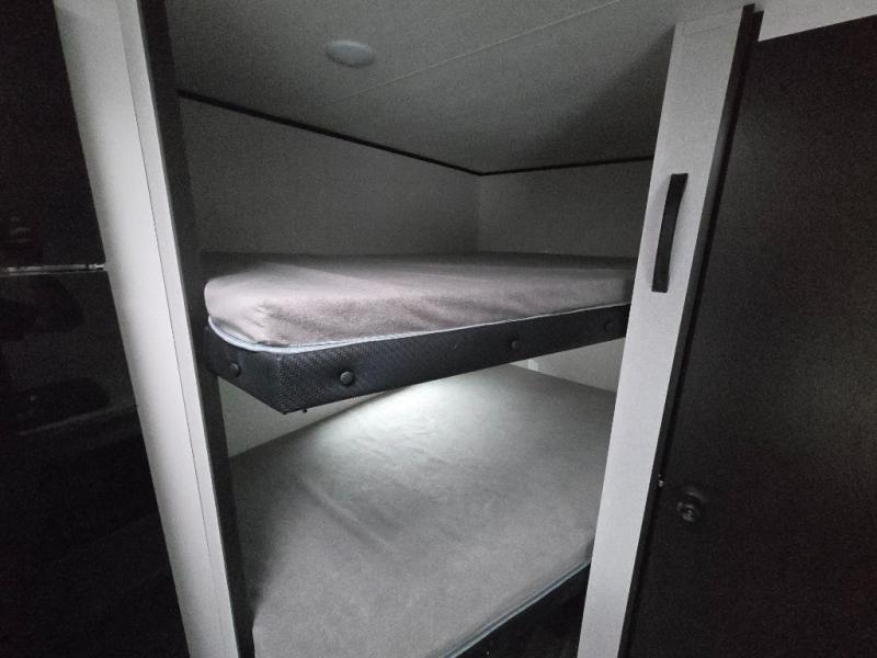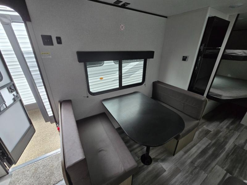 You can comfortably sleep eight to ten people in this trailer thanks to the double-size bunks, the 60" x 80" queen bed in the front bedroom, plus the booth dinette and jack-knife sofa in the main living area! The chef of your crew will have a two burner cooktop and microwave oven to prepare meals, and everyone can store their favorite drinks in the 12V refrigerator. The bathroom includes a 40" shower and a toilet, with the sink just outside of this room so others can brush their teeth if one is taking a shower before bed. The outside storage will let you bring along fishing poles and the 12' power awning will create a nice place to gather in the evenings!