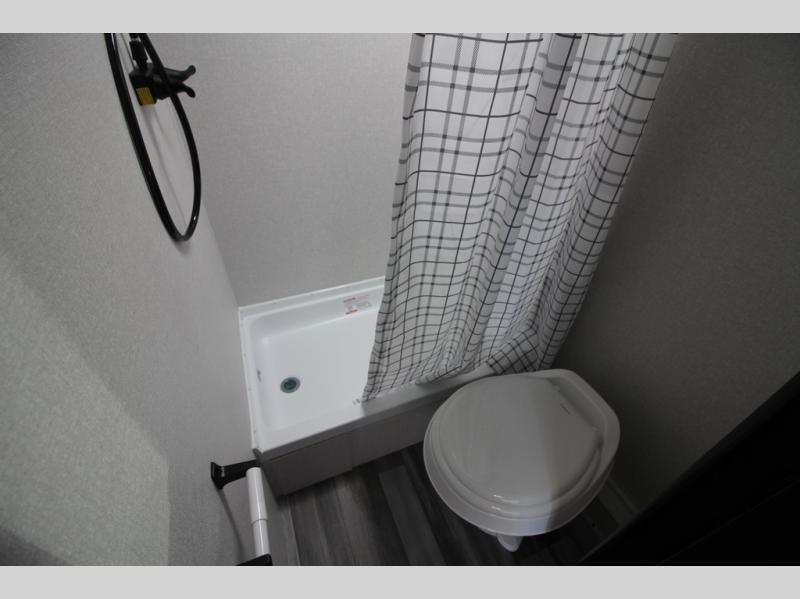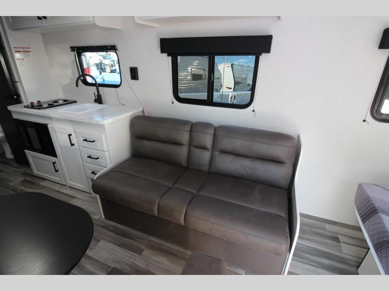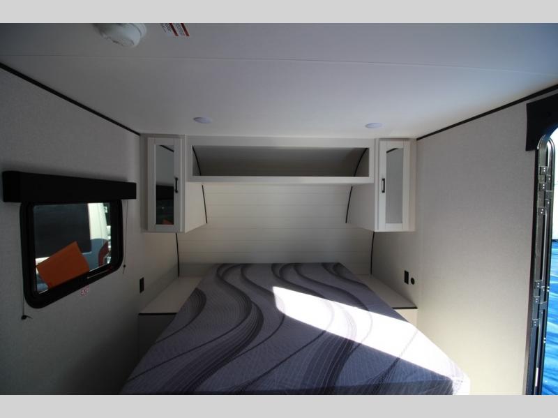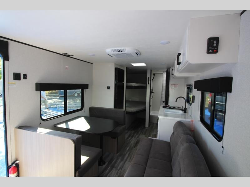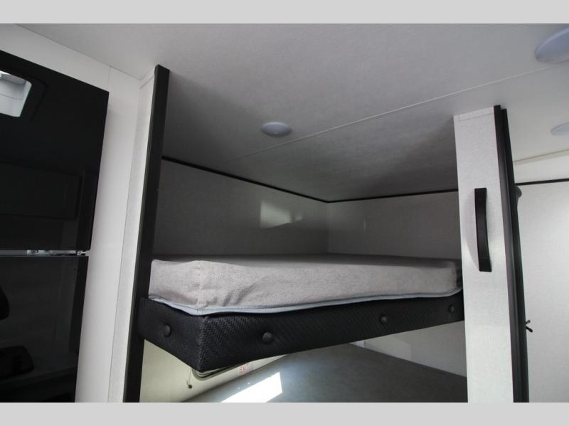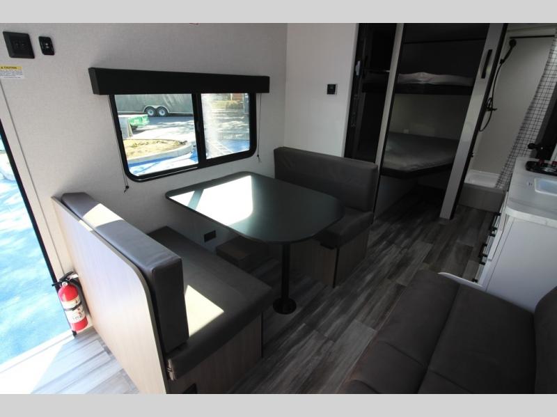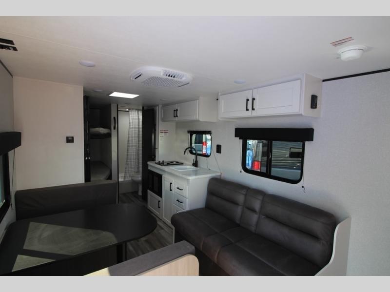 You can comfortably sleep eight to ten people in this trailer thanks to the double-size bunks, the 60" x 80" queen bed in the front bedroom, plus the booth dinette and jack-knife sofa in the main living area! The chef of your crew will have a two burner cooktop and microwave oven to prepare meals, and everyone can store their favorite drinks in the 12V refrigerator. The bathroom includes a 40" shower and a toilet, with the sink just outside of this room so others can brush their teeth if one is taking a shower before bed. The outside storage will let you bring along fishing poles and the 12' power awning will create a nice place to gather in the evenings!