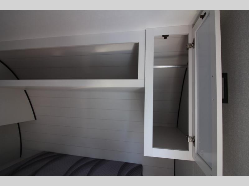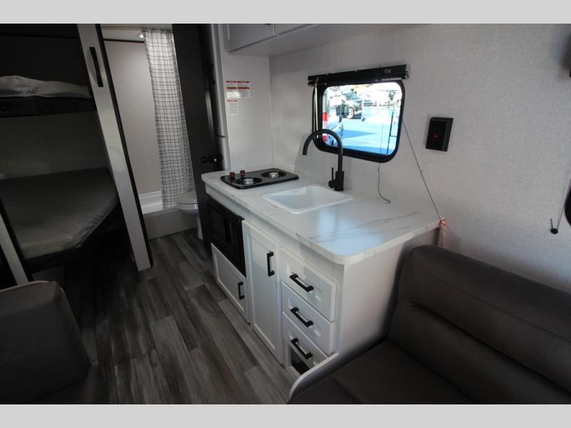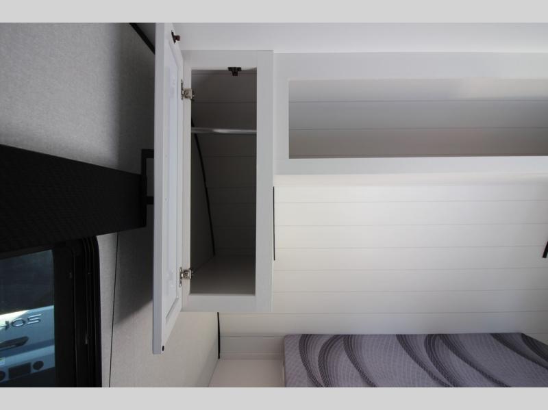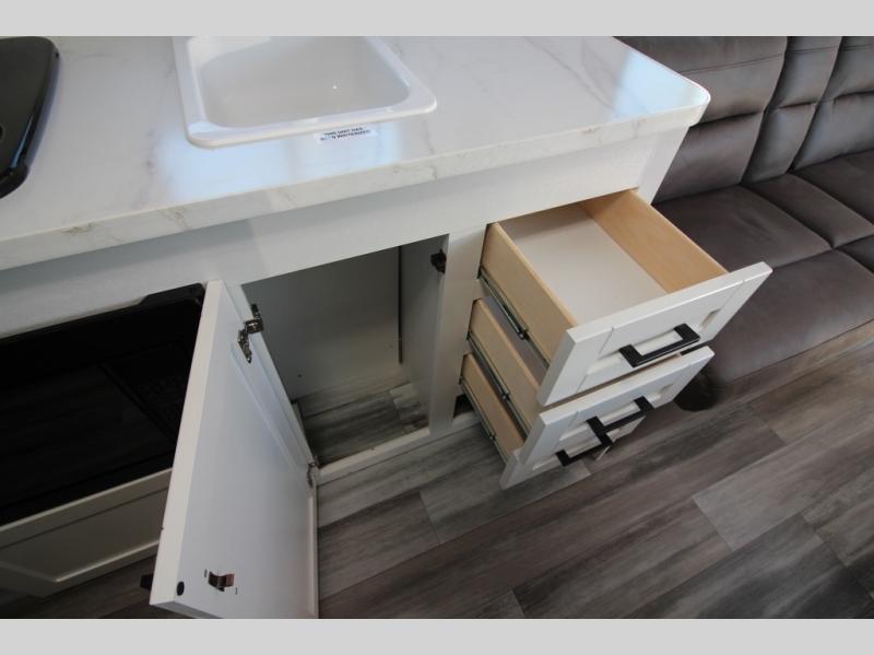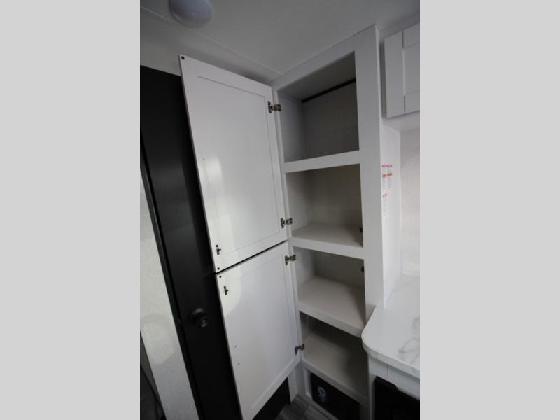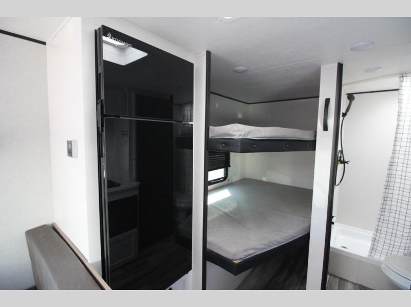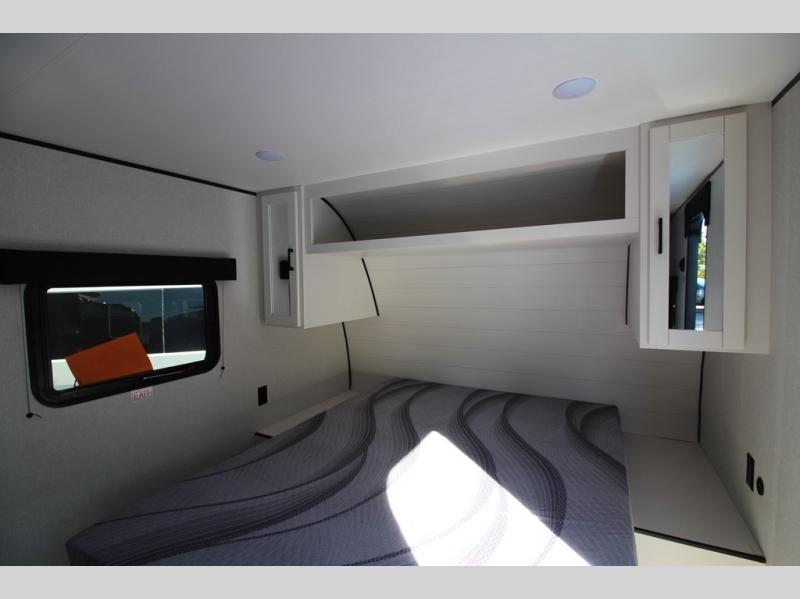 You can comfortably sleep eight to ten people in this trailer thanks to the double-size bunks, the 60" x 80" queen bed in the front bedroom, plus the booth dinette and jack-knife sofa in the main living area! The chef of your crew will have a two burner cooktop and microwave oven to prepare meals, and everyone can store their favorite drinks in the 12V refrigerator. The bathroom includes a 40" shower and a toilet, with the sink just outside of this room so others can brush their teeth if one is taking a shower before bed. The outside storage will let you bring along fishing poles and the 12' power awning will create a nice place to gather in the evenings!