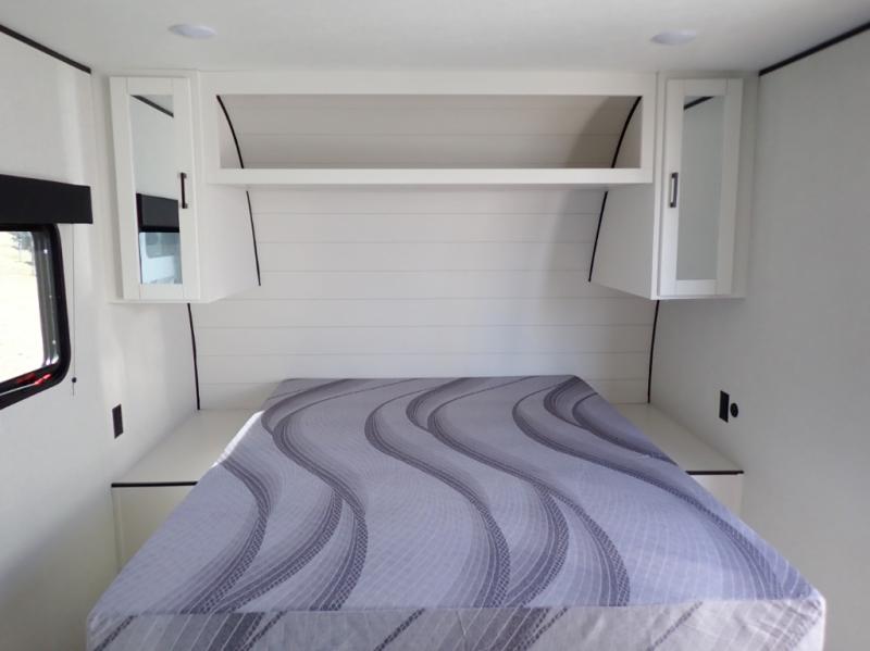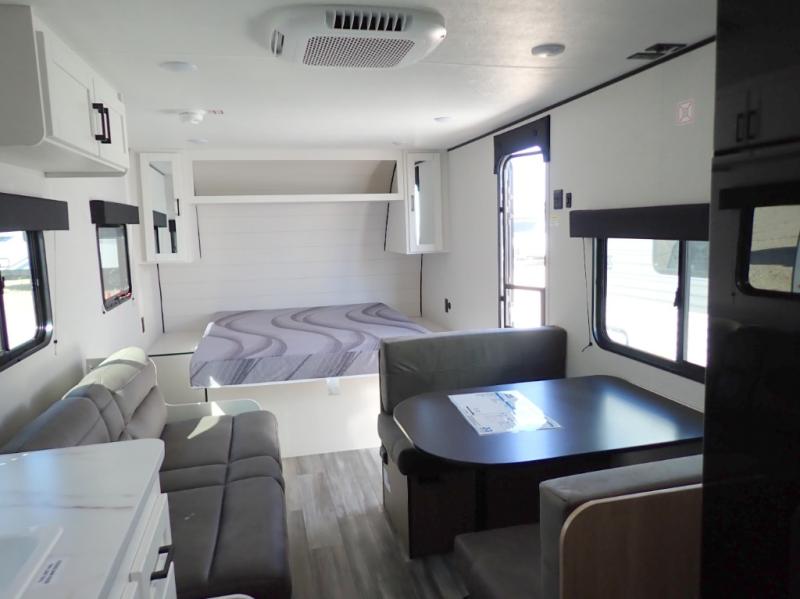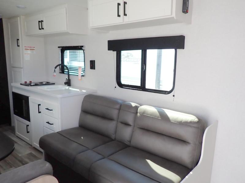 You can comfortably sleep eight to ten people in this trailer thanks to the double-size bunks, the 60" x 80" queen bed in the front bedroom, plus the booth dinette and jack-knife sofa in the main living area! The chef of your crew will have a two burner cooktop and microwave oven to prepare meals, and everyone can store their favorite drinks in the 12V refrigerator. The bathroom includes a 40" shower and a toilet, with the sink just outside of this room so others can brush their teeth if one is taking a shower before bed. The outside storage will let you bring along fishing poles and the 12' power awning will create a nice place to gather in the evenings!