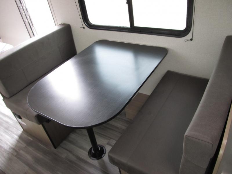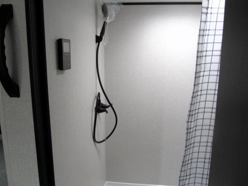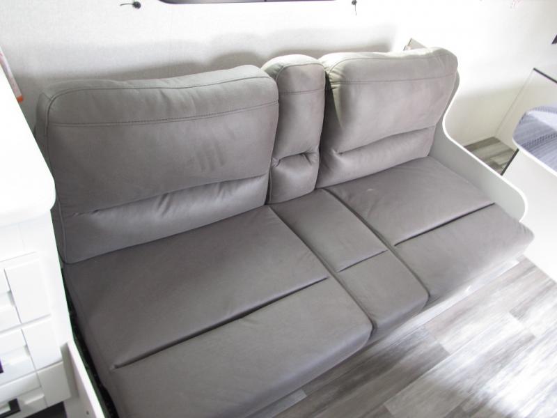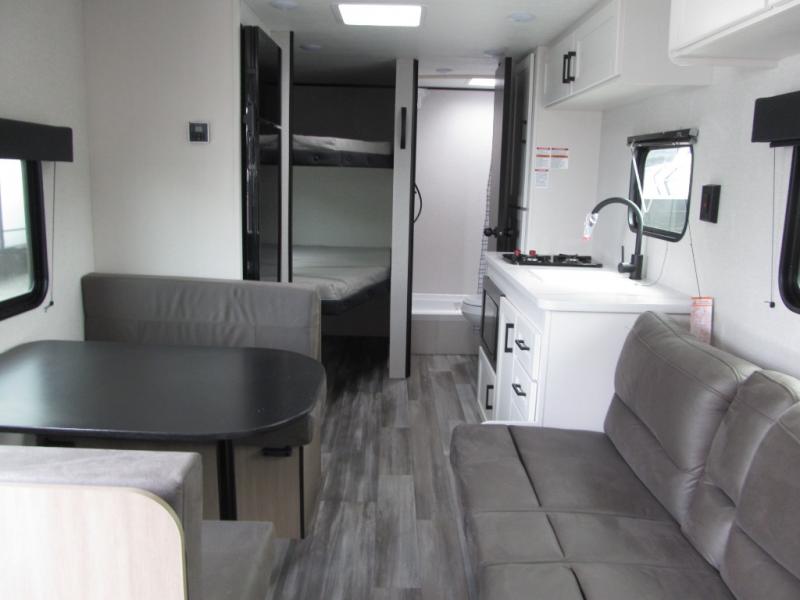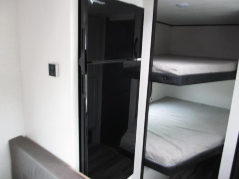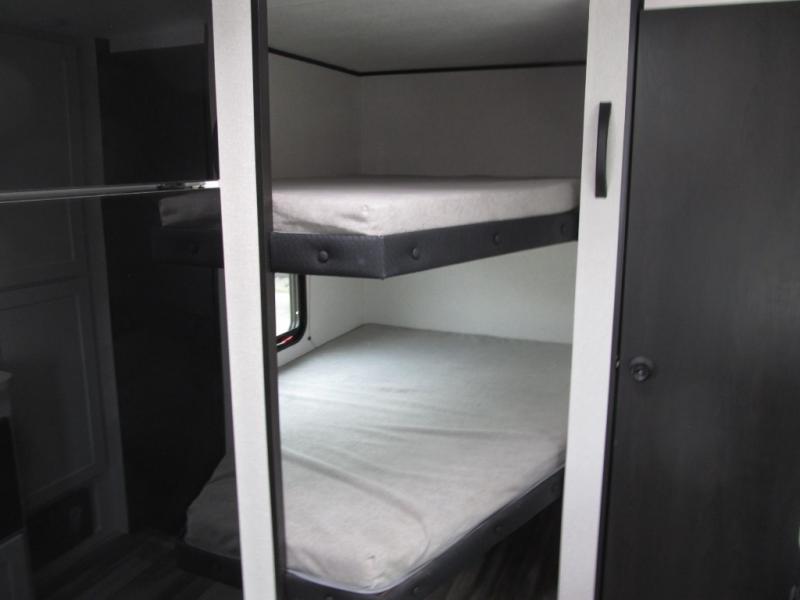 You can comfortably sleep eight to ten people in this trailer thanks to the double-size bunks, the 60" x 80" queen bed in the front bedroom, plus the booth dinette and jack-knife sofa in the main living area! The chef of your crew will have a two burner cooktop and microwave oven to prepare meals, and everyone can store their favorite drinks in the 12V refrigerator. The bathroom includes a 40" shower and a toilet, with the sink just outside of this room so others can brush their teeth if one is taking a shower before bed. The outside storage will let you bring along fishing poles and the 12' power awning will create a nice place to gather in the evenings!