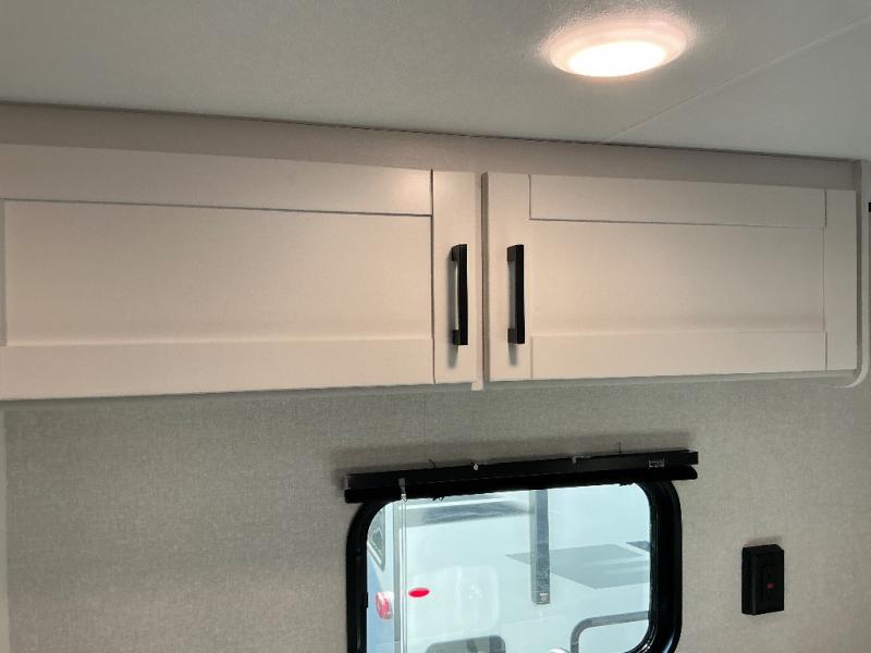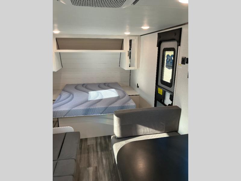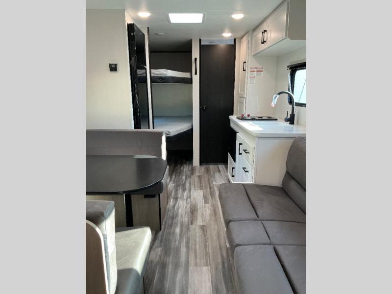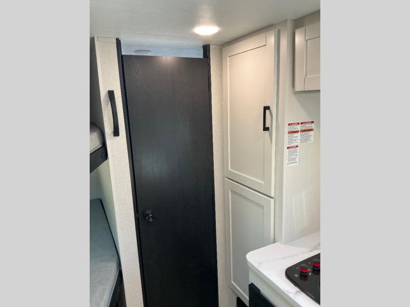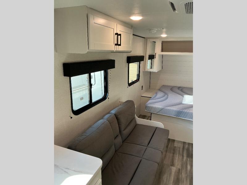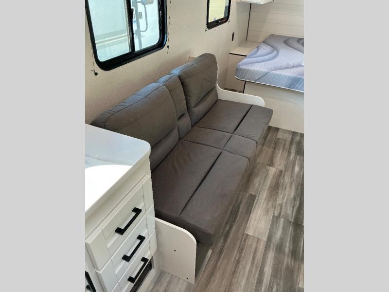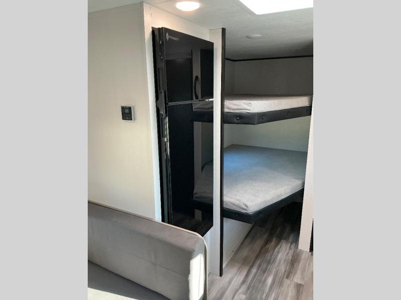You can comfortably sleep eight to ten people in this trailer thanks to the double-size bunks, the 60" x 80" queen bed in the front bedroom, plus the booth dinette and jack-knife sofa in the main living area! The chef of your crew will have a two burner cooktop and microwave oven to prepare meals, and everyone can store their favorite drinks in the 12V refrigerator. The bathroom includes a 40" shower and a toilet, with the sink just outside of this room so others can brush their teeth if one is taking a shower before bed. The outside storage will let you bring along fishing poles and the 12' power awning will create a nice place to gather in the evenings!