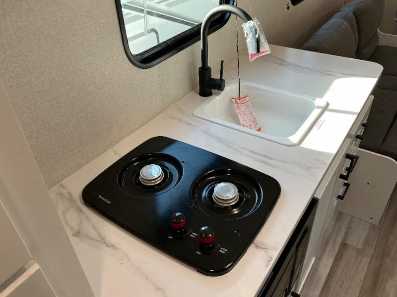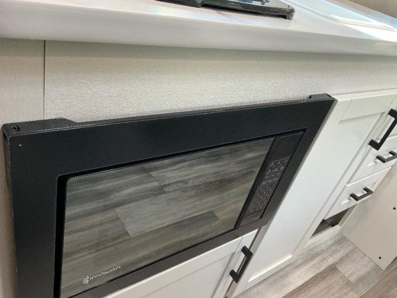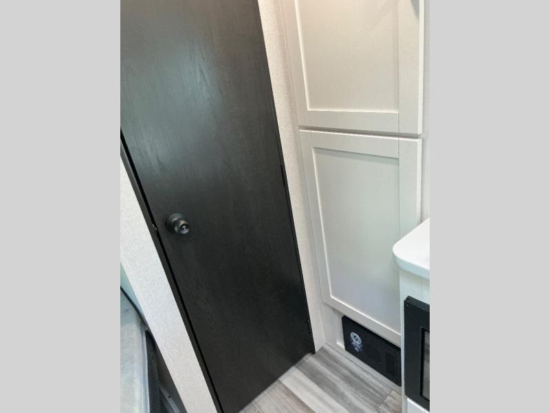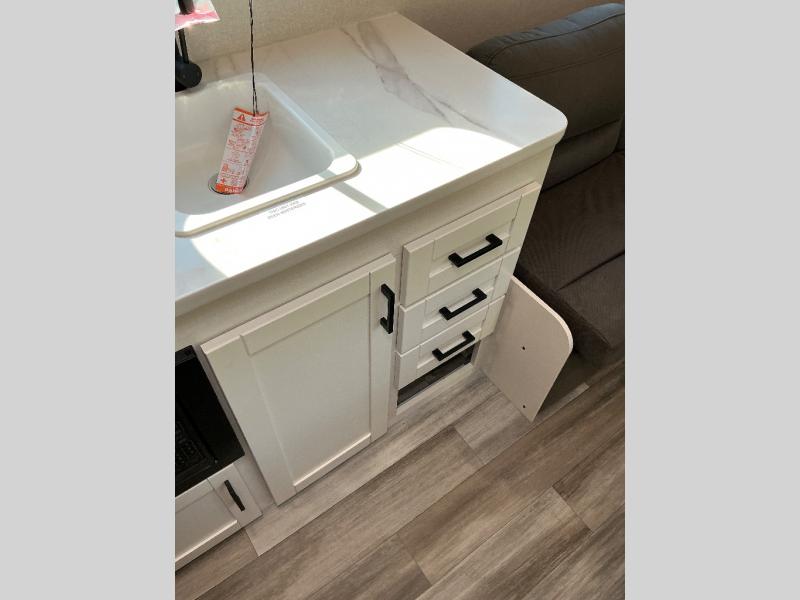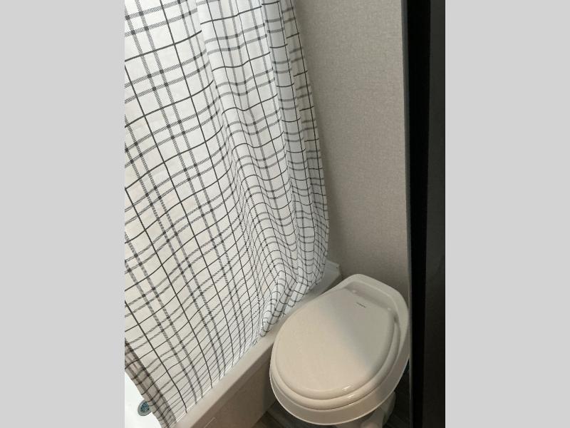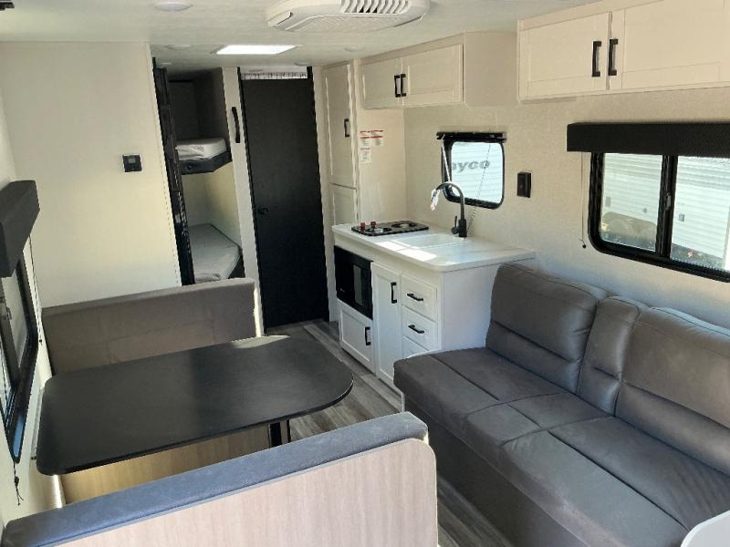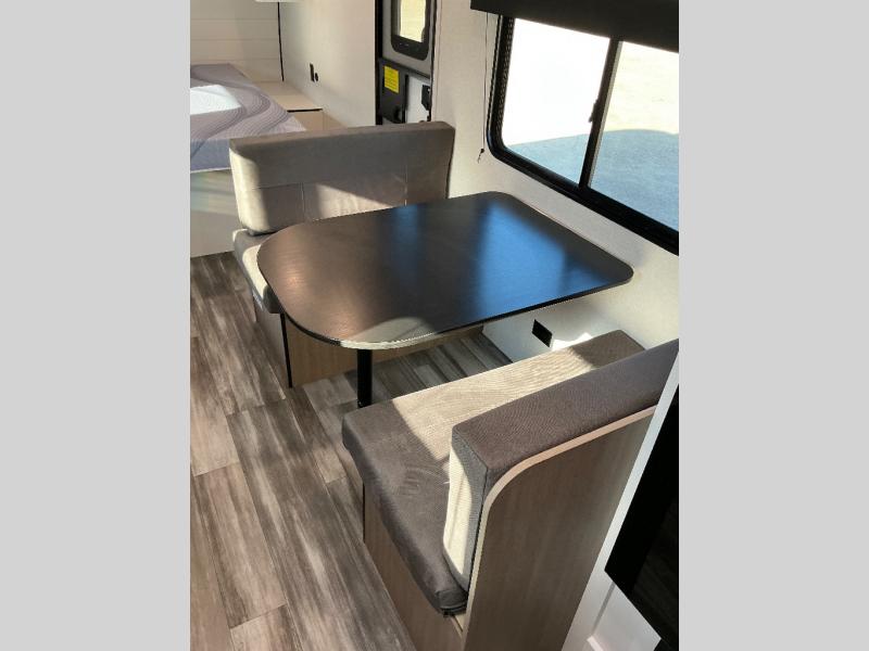 You can comfortably sleep eight to ten people in this trailer thanks to the double-size bunks, the 60" x 80" queen bed in the front bedroom, plus the booth dinette and jack-knife sofa in the main living area! The chef of your crew will have a two burner cooktop and microwave oven to prepare meals, and everyone can store their favorite drinks in the 12V refrigerator. The bathroom includes a 40" shower and a toilet, with the sink just outside of this room so others can brush their teeth if one is taking a shower before bed. The outside storage will let you bring along fishing poles and the 12' power awning will create a nice place to gather in the evenings!