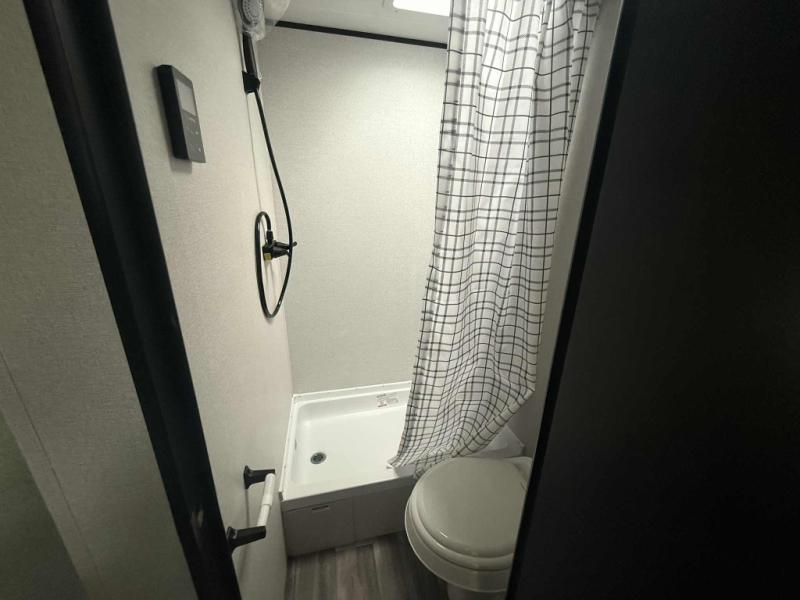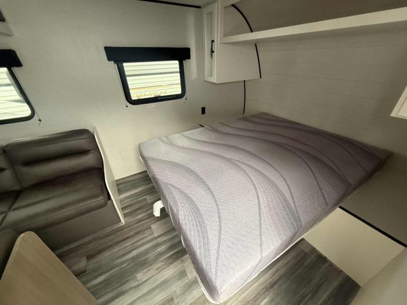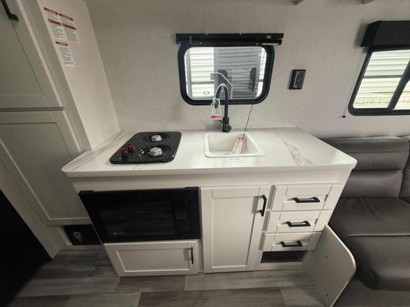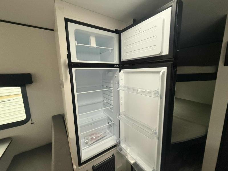 You can comfortably sleep eight to ten people in this trailer thanks to the double-size bunks, the 60" x 80" queen bed in the front bedroom, plus the booth dinette and jack-knife sofa in the main living area! The chef of your crew will have a two burner cooktop and microwave oven to prepare meals, and everyone can store their favorite drinks in the 12V refrigerator. The bathroom includes a 40" shower and a toilet, with the sink just outside of this room so others can brush their teeth if one is taking a shower before bed. The outside storage will let you bring along fishing poles and the 12' power awning will create a nice place to gather in the evenings!
