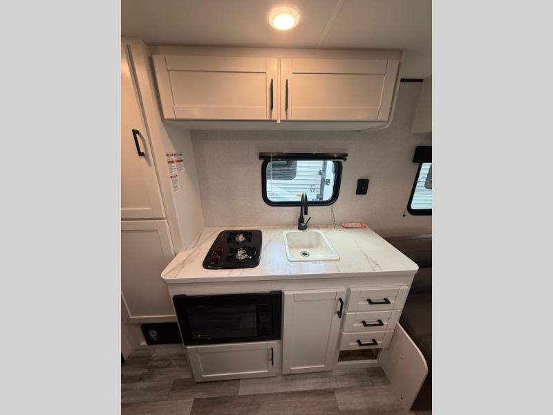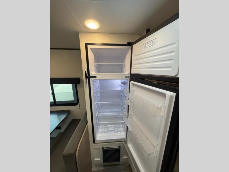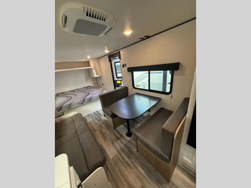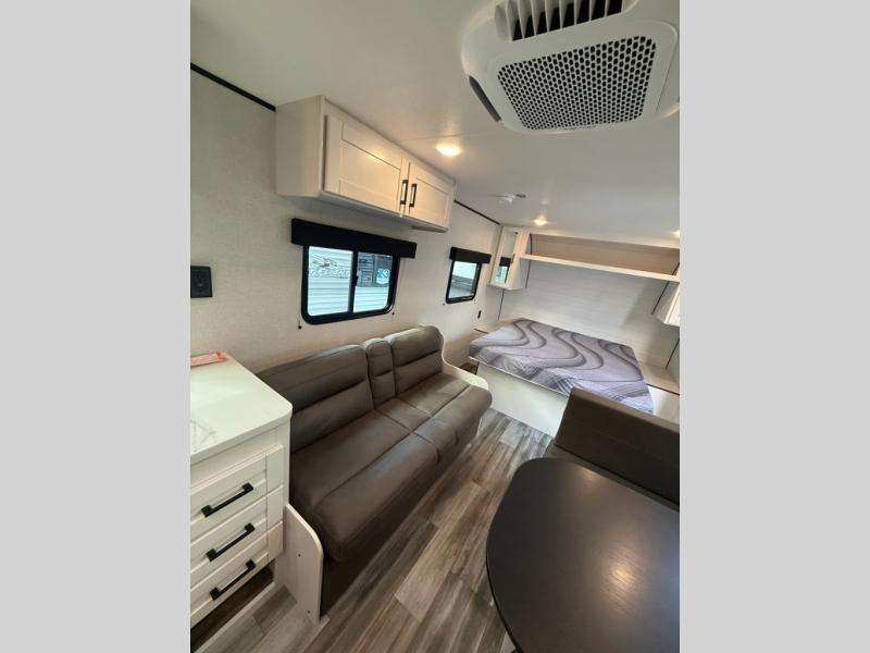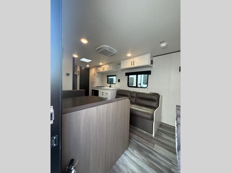 You can comfortably sleep eight to ten people in this trailer thanks to the double-size bunks, the 60" x 80" queen bed in the front bedroom, plus the booth dinette and jack-knife sofa in the main living area! The chef of your crew will have a two burner cooktop and microwave oven to prepare meals, and everyone can store their favorite drinks in the 12V refrigerator. The bathroom includes a 40" shower and a toilet, with the sink just outside of this room so others can brush their teeth if one is taking a shower before bed. The outside storage will let you bring along fishing poles and the 12' power awning will create a nice place to gather in the evenings!