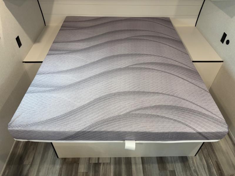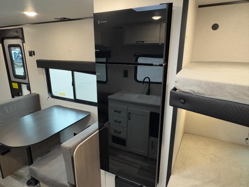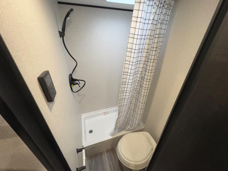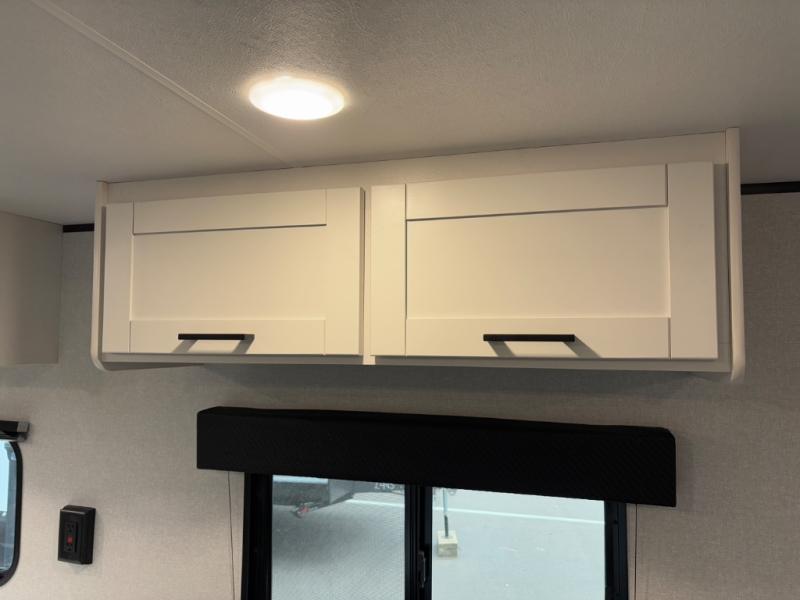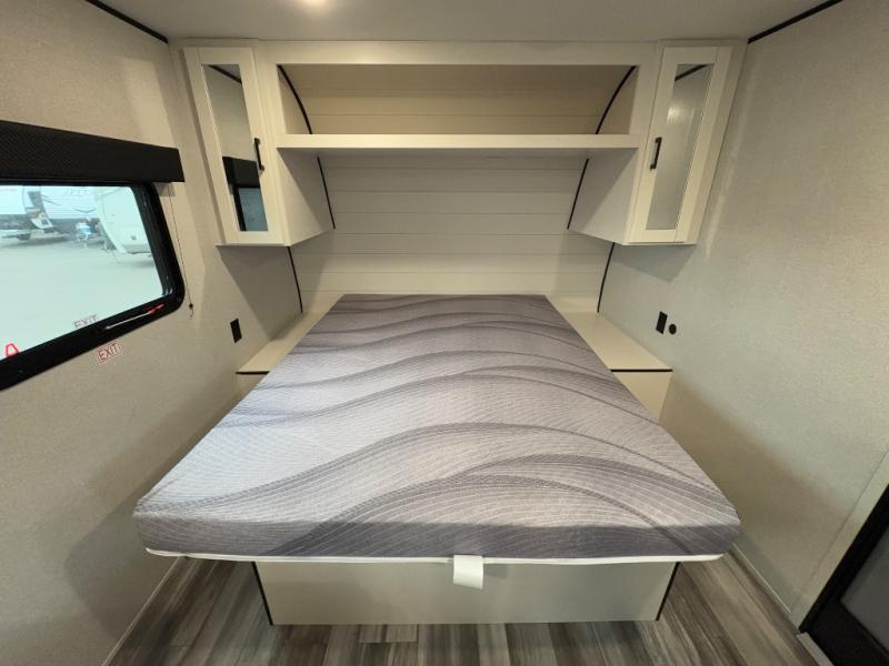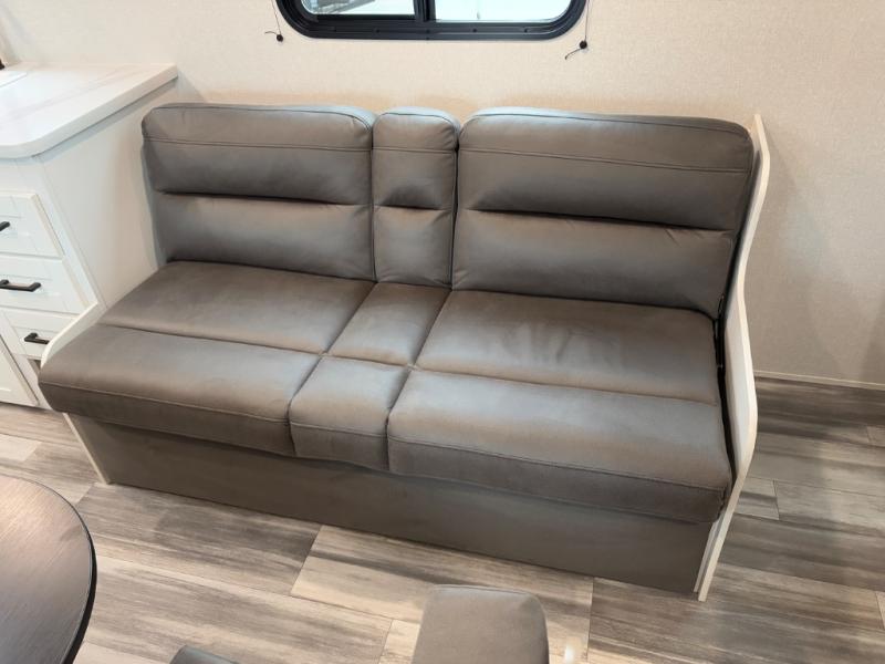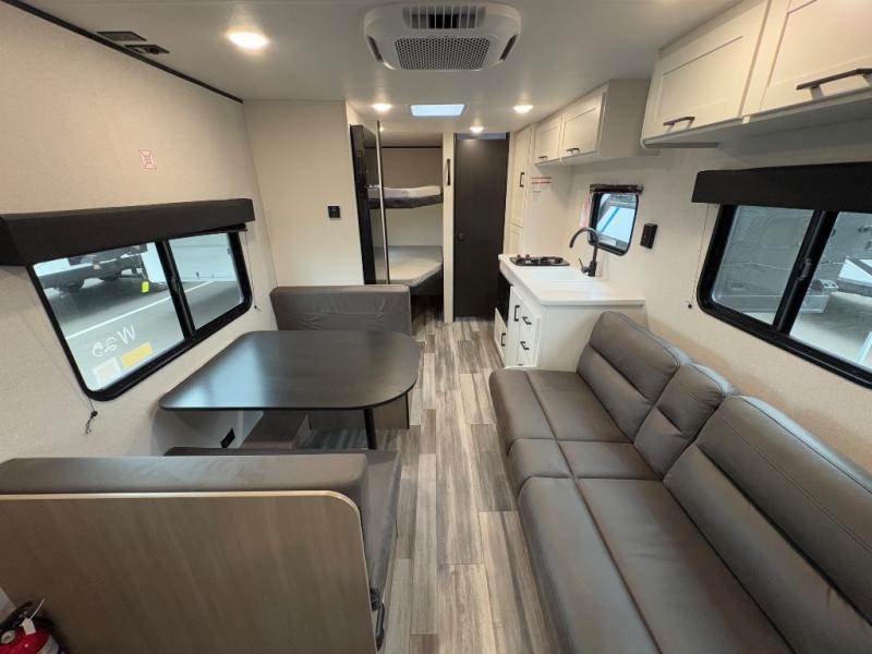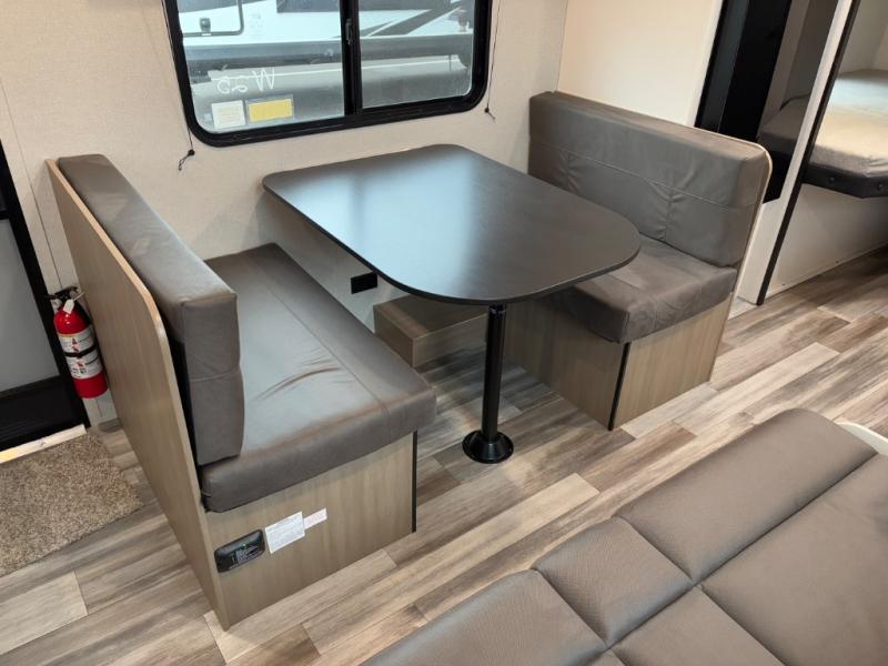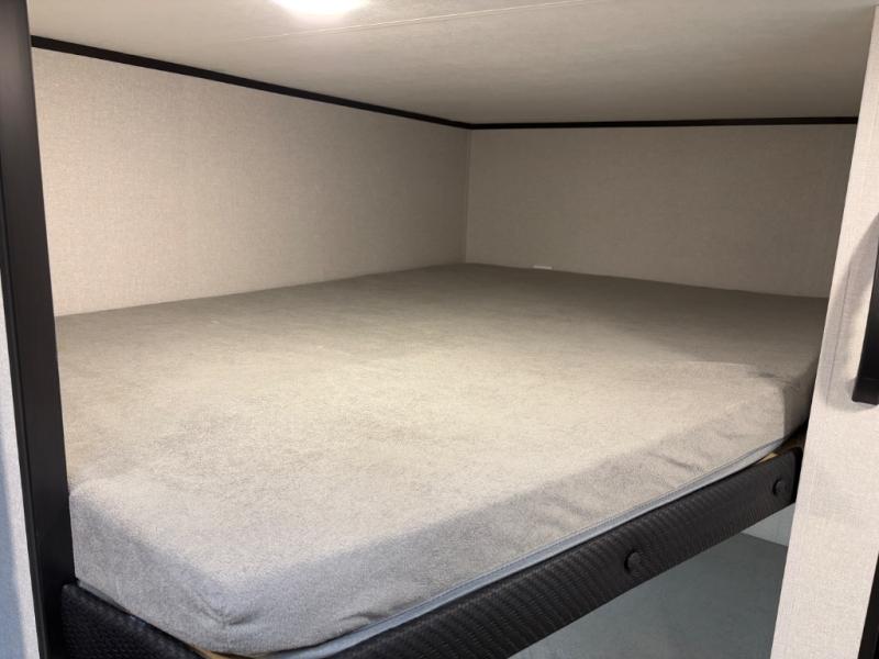 You can comfortably sleep eight to ten people in this trailer thanks to the double-size bunks, the 60" x 80" queen bed in the front bedroom, plus the booth dinette and jack-knife sofa in the main living area! The chef of your crew will have a two burner cooktop and microwave oven to prepare meals, and everyone can store their favorite drinks in the 12V refrigerator. The bathroom includes a 40" shower and a toilet, with the sink just outside of this room so others can brush their teeth if one is taking a shower before bed. The outside storage will let you bring along fishing poles and the 12' power awning will create a nice place to gather in the evenings!
