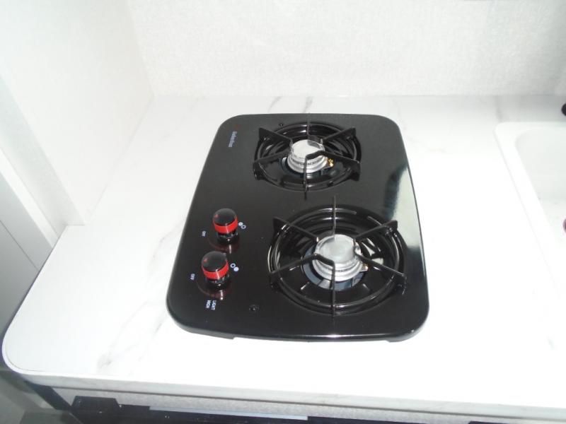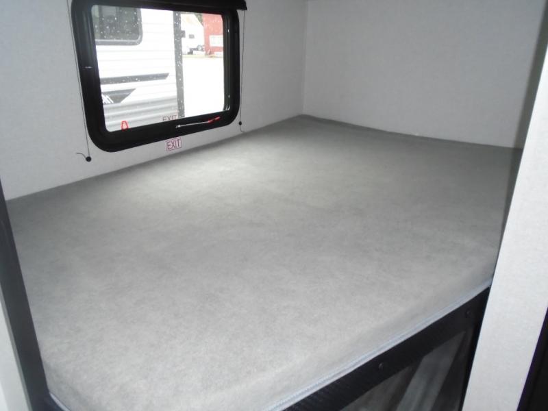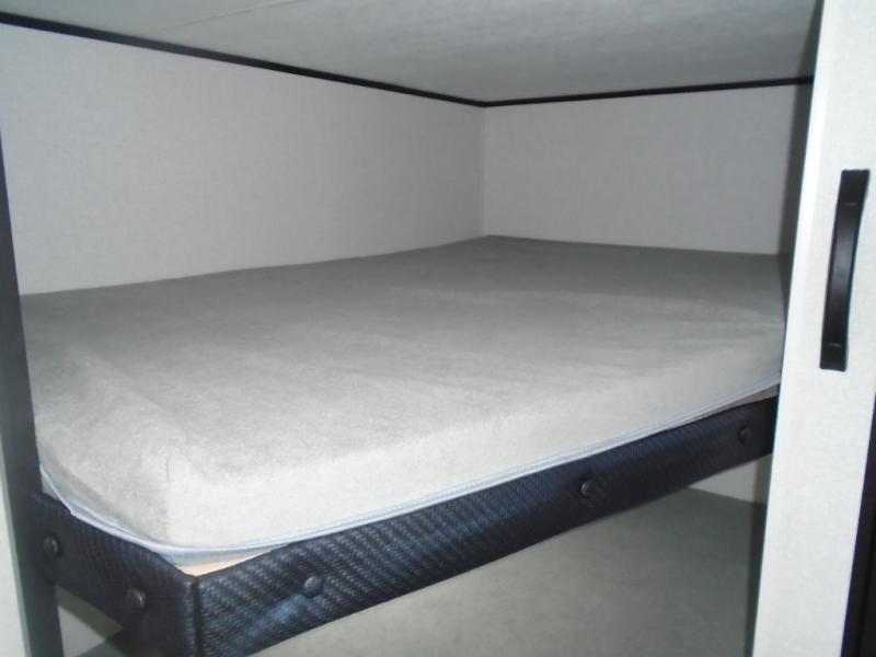 You can comfortably sleep eight to ten people in this trailer thanks to the double-size bunks, the 60" x 80" queen bed in the front bedroom, plus the booth dinette and jack-knife sofa in the main living area! The chef of your crew will have a two burner cooktop and microwave oven to prepare meals, and everyone can store their favorite drinks in the 12V refrigerator. The bathroom includes a 40" shower and a toilet, with the sink just outside of this room so others can brush their teeth if one is taking a shower before bed. The outside storage will let you bring along fishing poles and the 12' power awning will create a nice place to gather in the evenings!